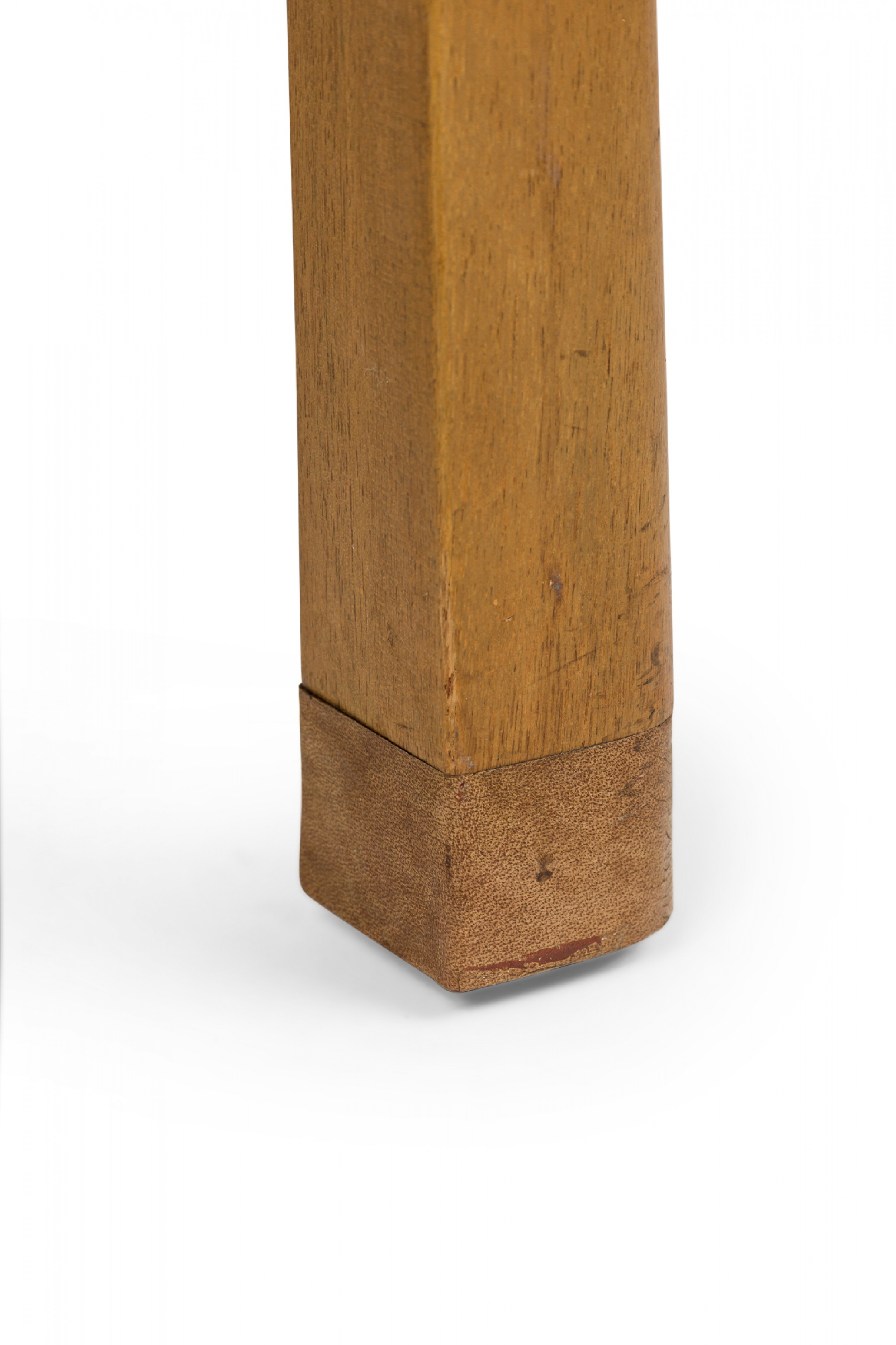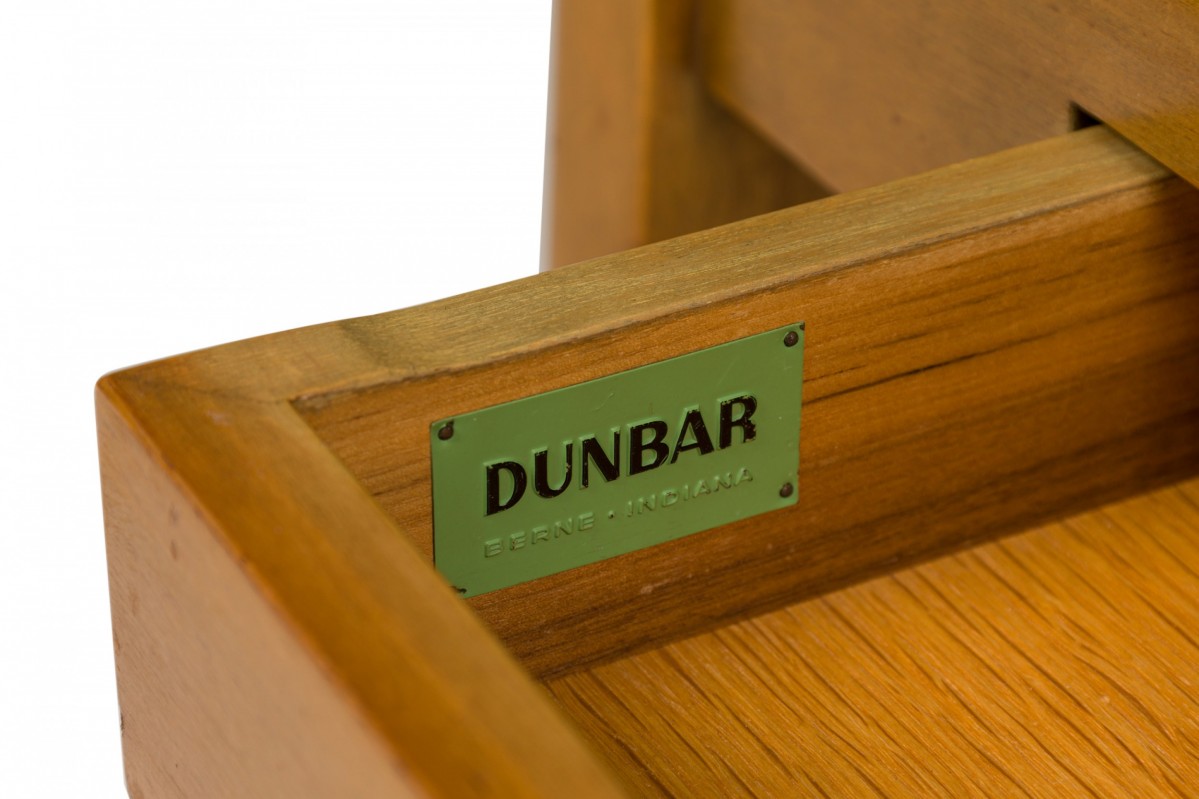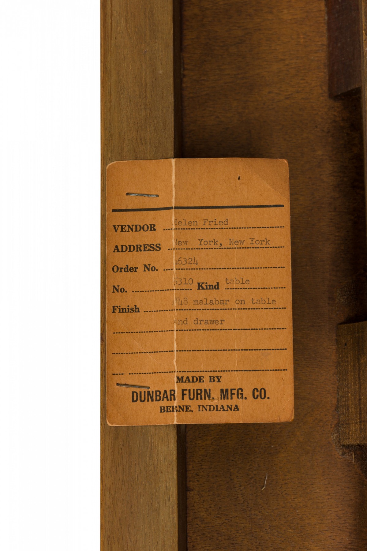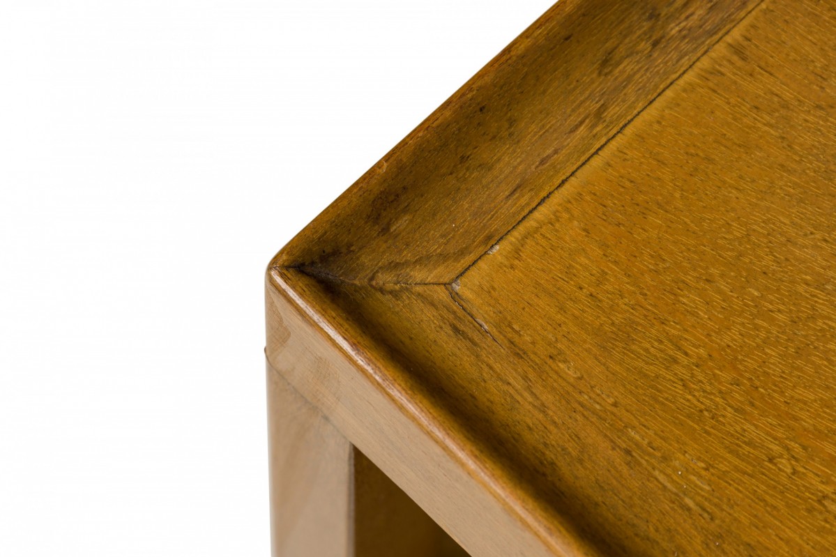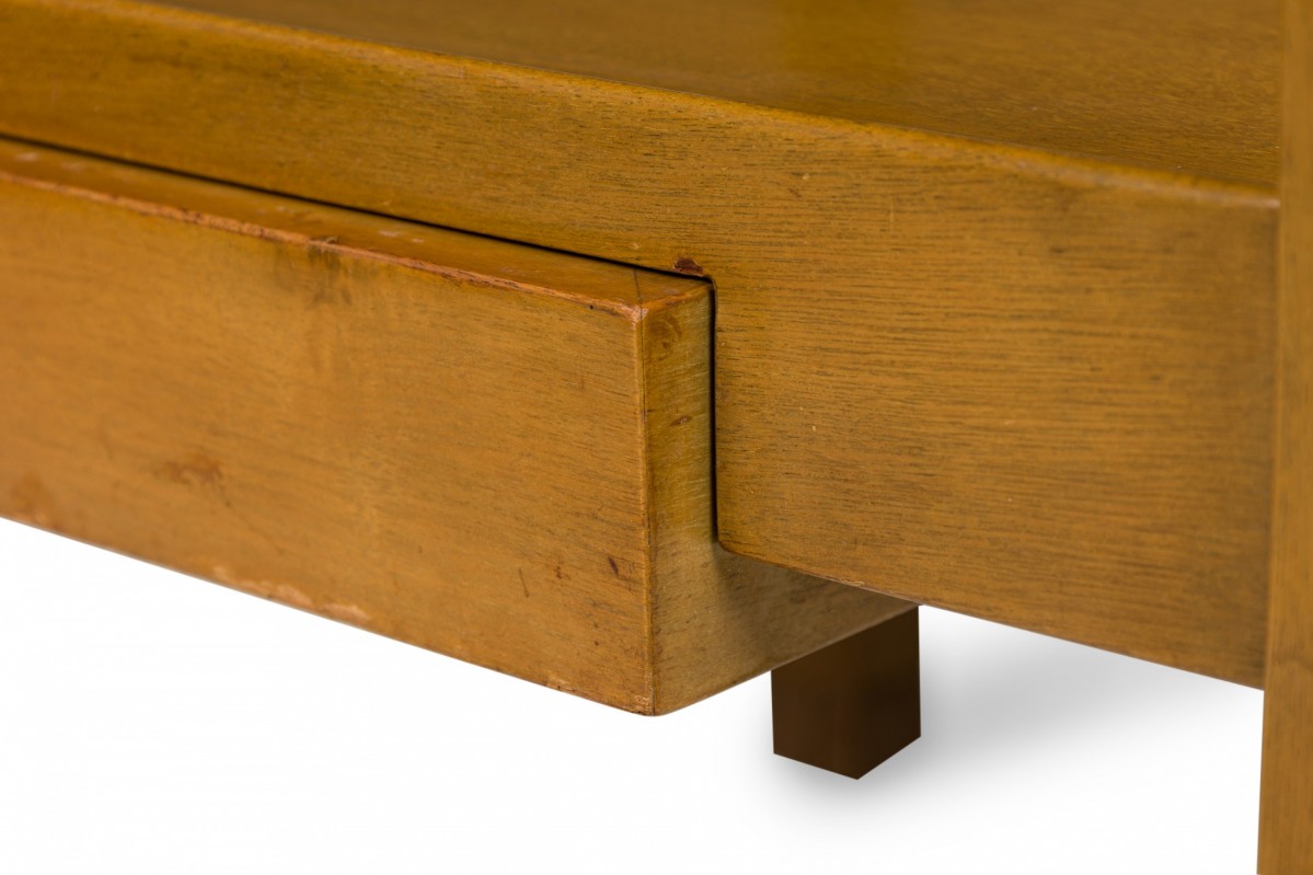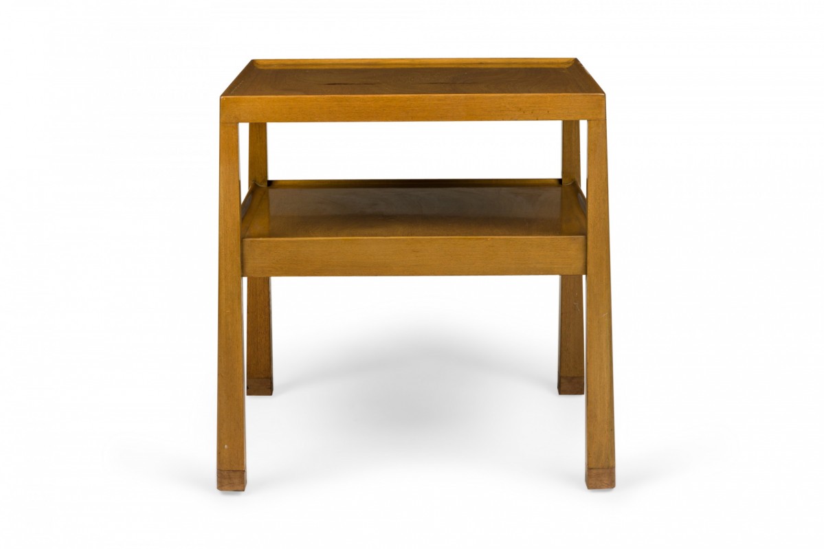American Mid-Century two-tier end / side table with a square top with a shallow gallery above a lower shelf containing a single drawer supported by two reverse tapered legs. (Similar table: DUF0759)