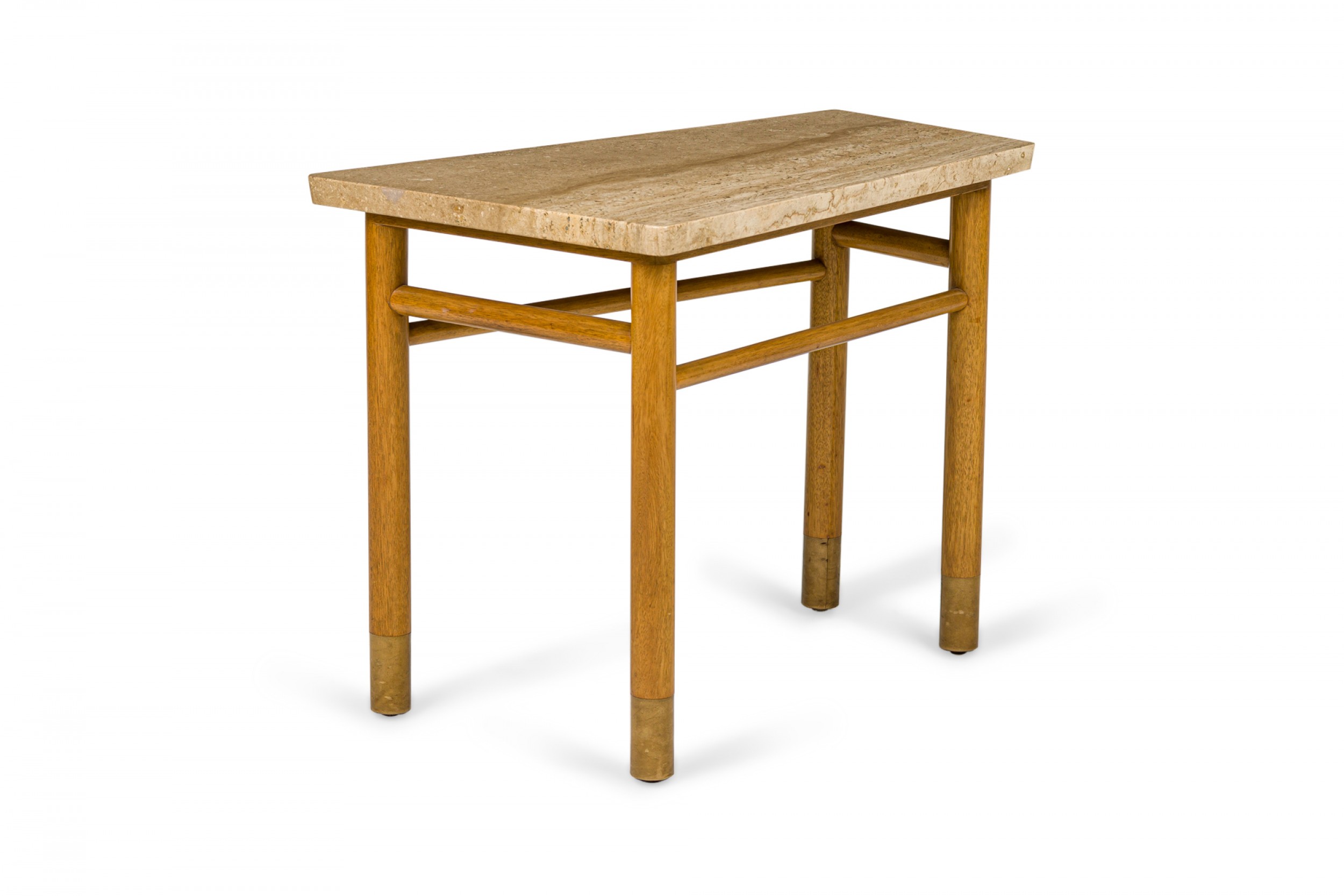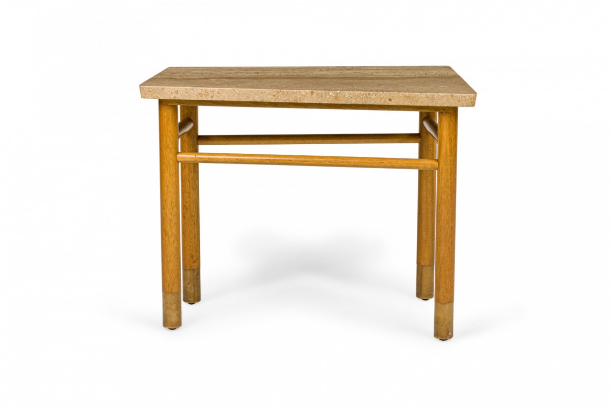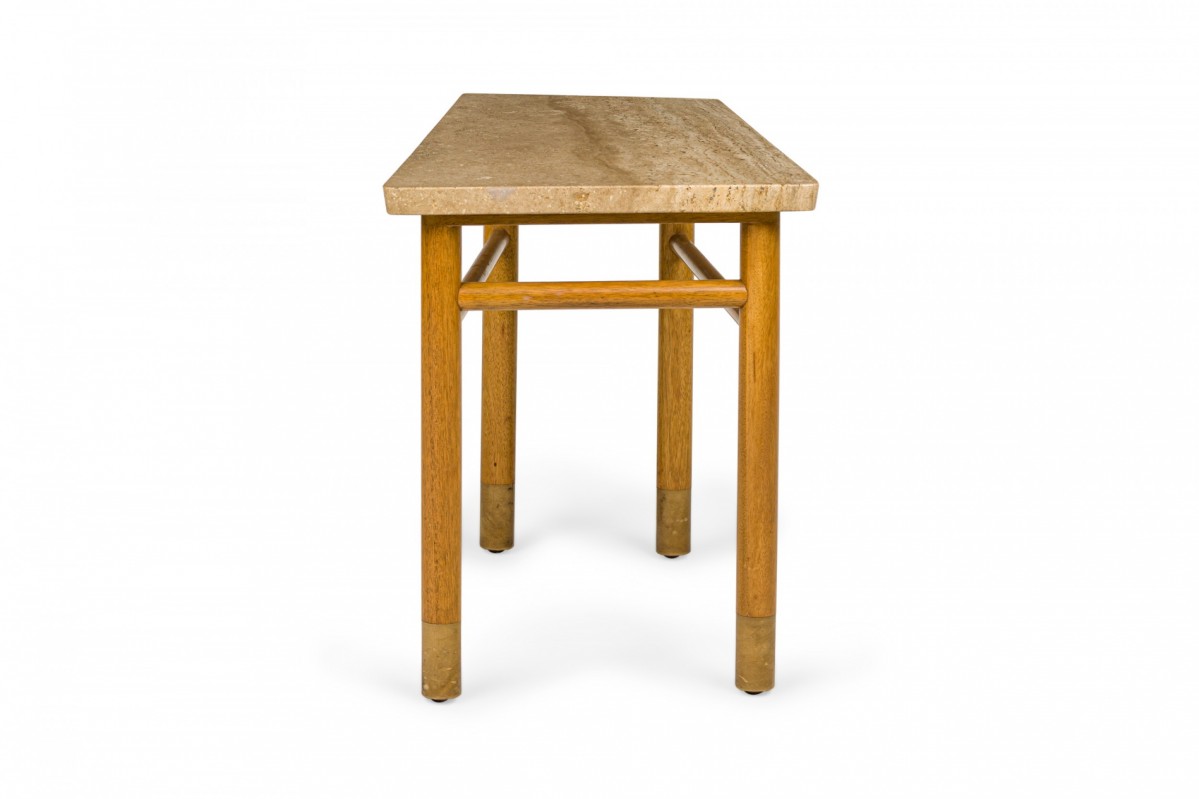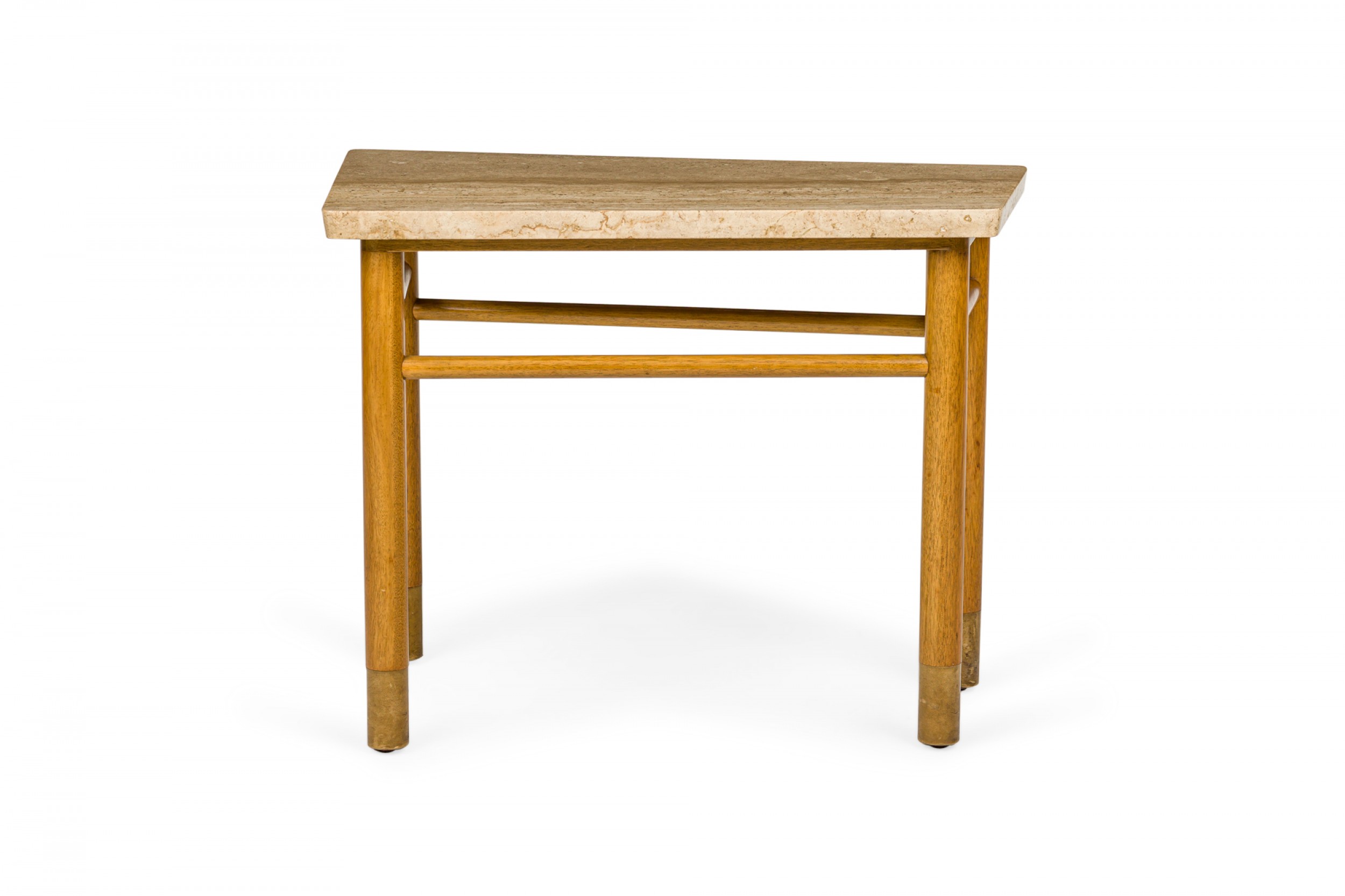 American Mid-Century end / side table with a wedge-shaped beige travertine top resting on a light wood base with connecting stretchers and four dowel legs ending in beige leather wrapped feet. (Similar piece: DUF0745)