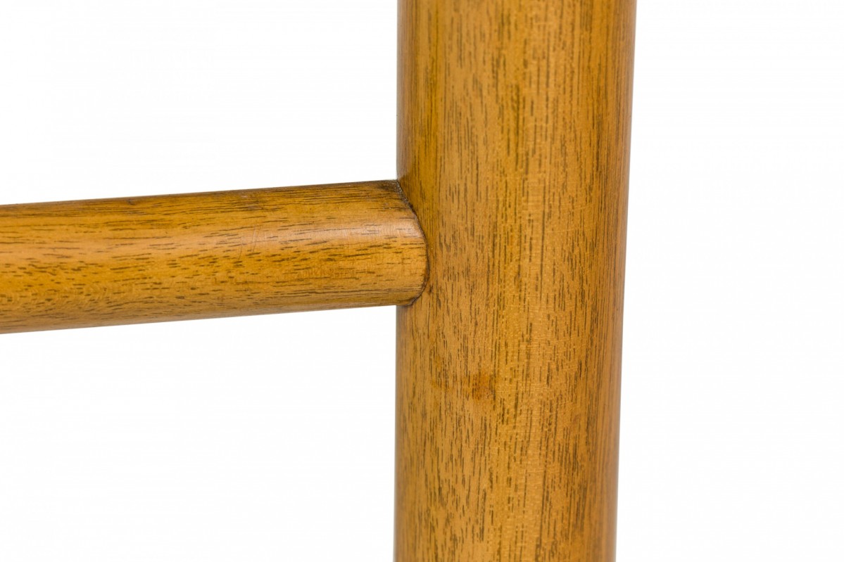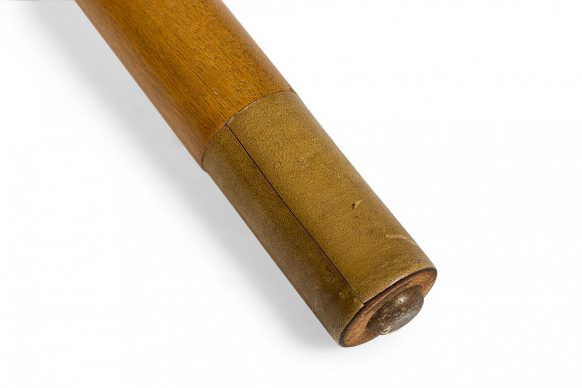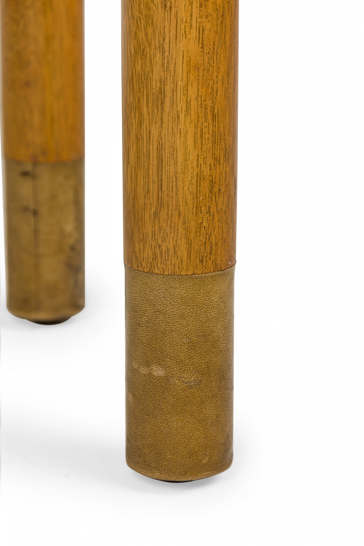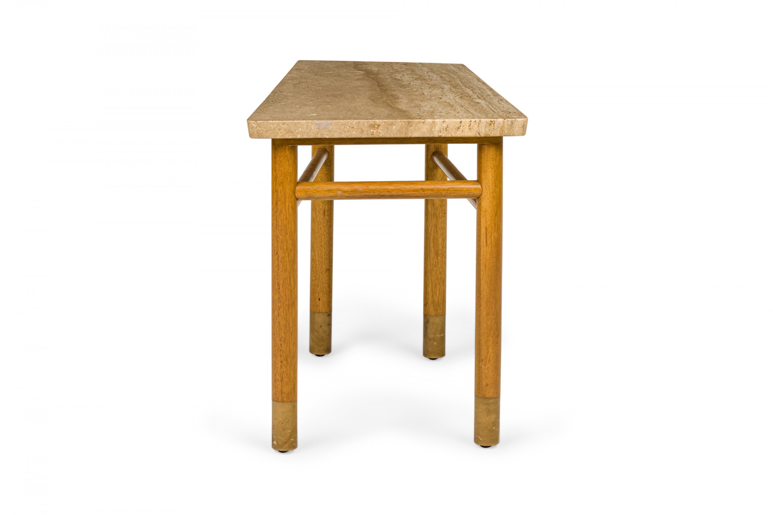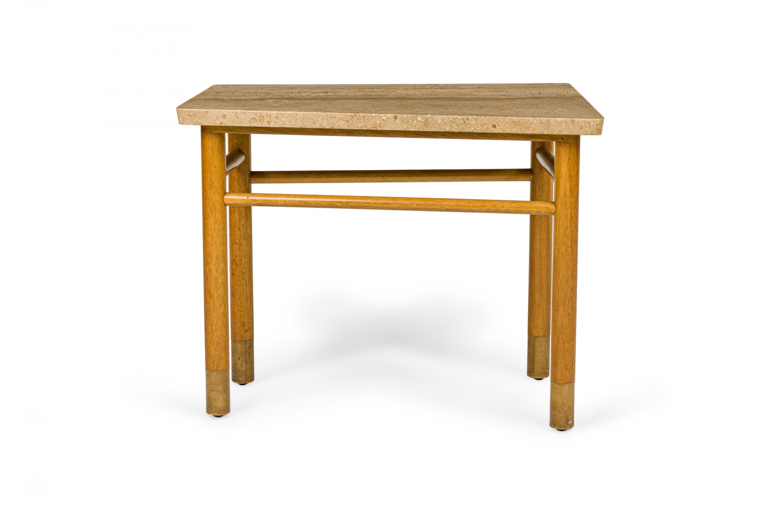 American Mid-Century end / side table with a wedge-shaped beige travertine top resting on a light wood base with connecting stretchers and four dowel legs ending in beige leather wrapped feet. (Similar piece: DUF0745)
