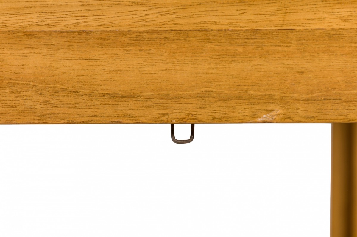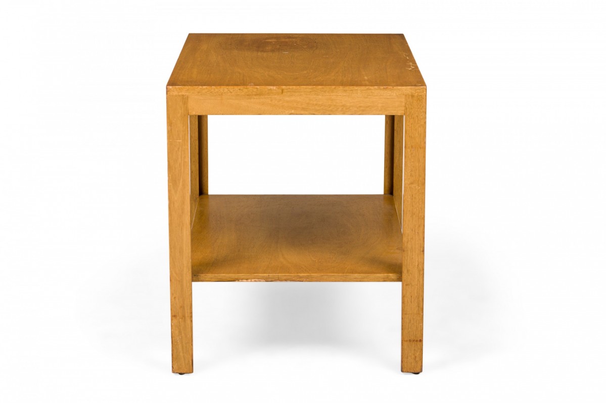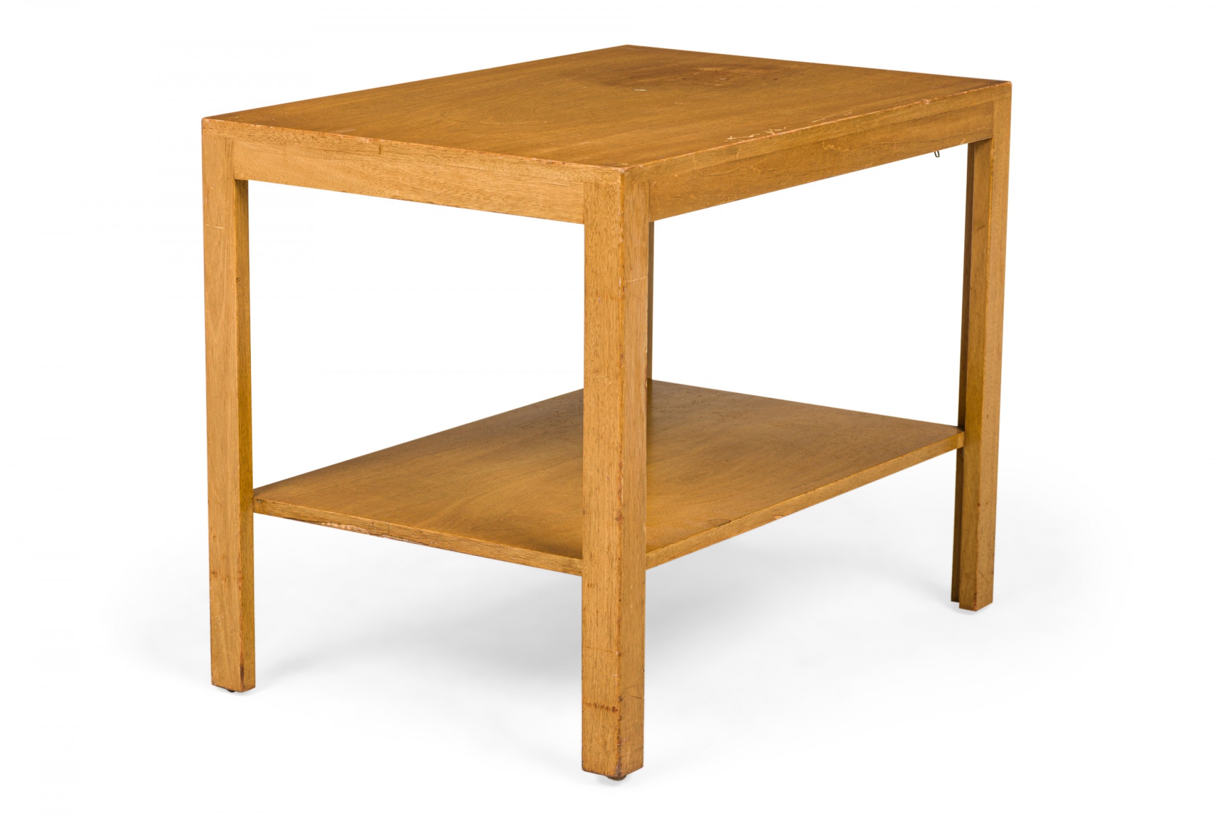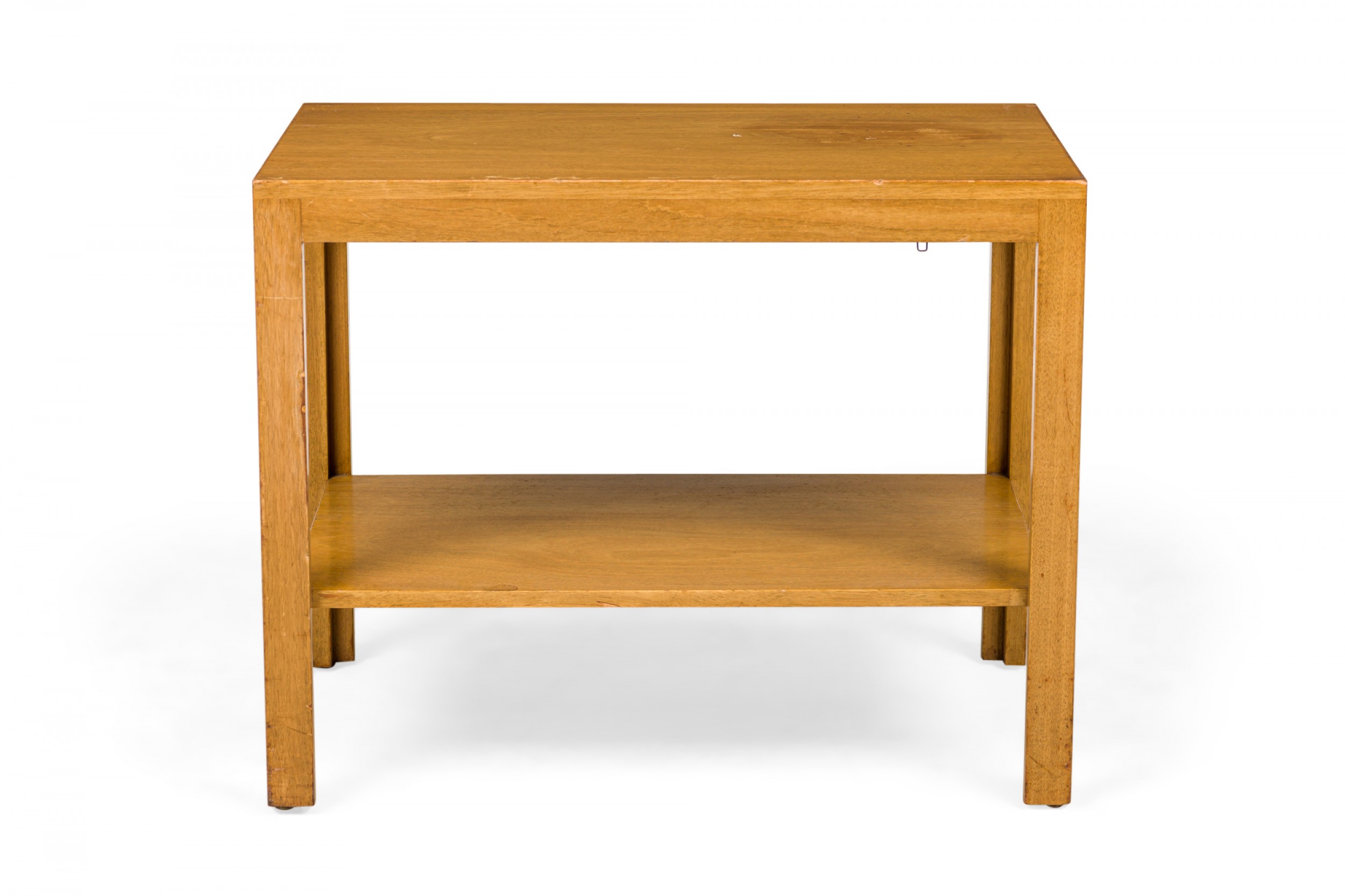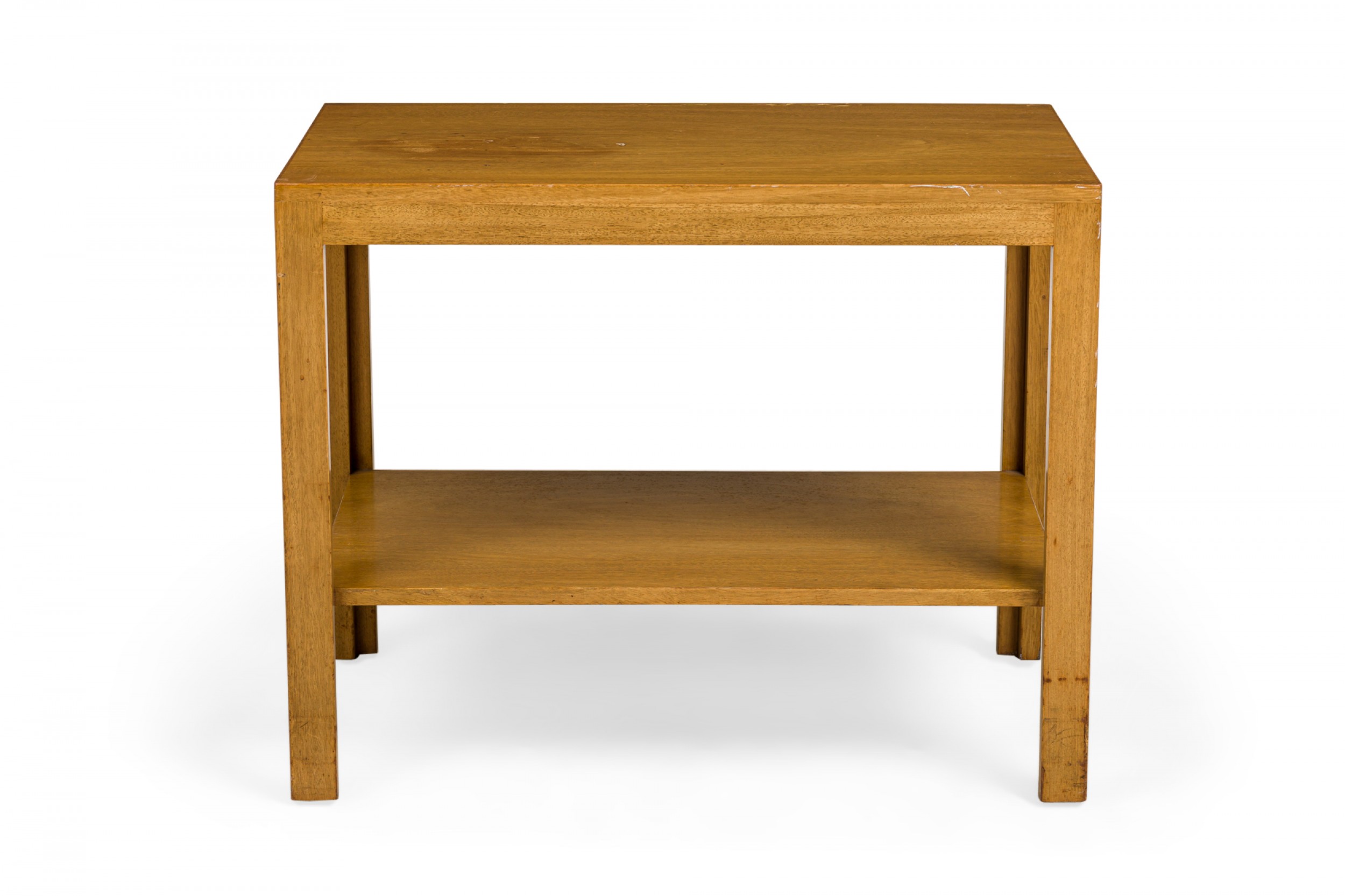 American Mid-Century Parsons-style end/side table with a wooden rectangular form with a lower stretcher shelf.