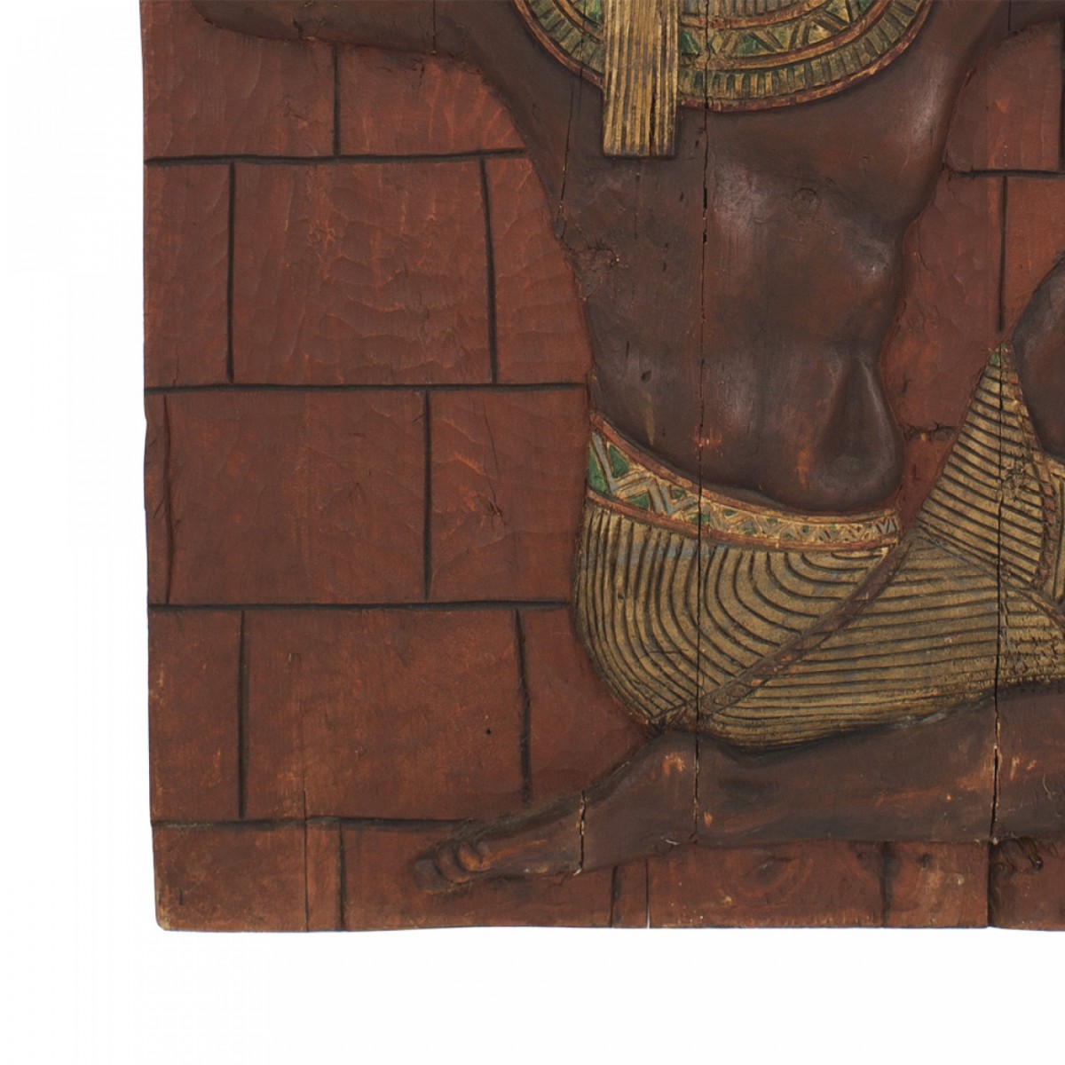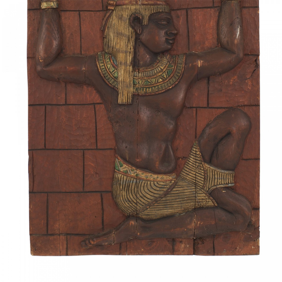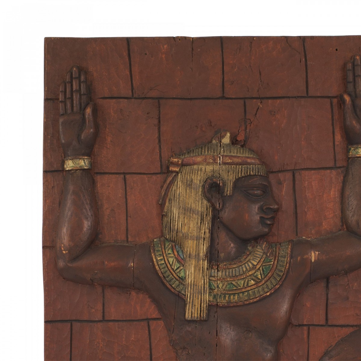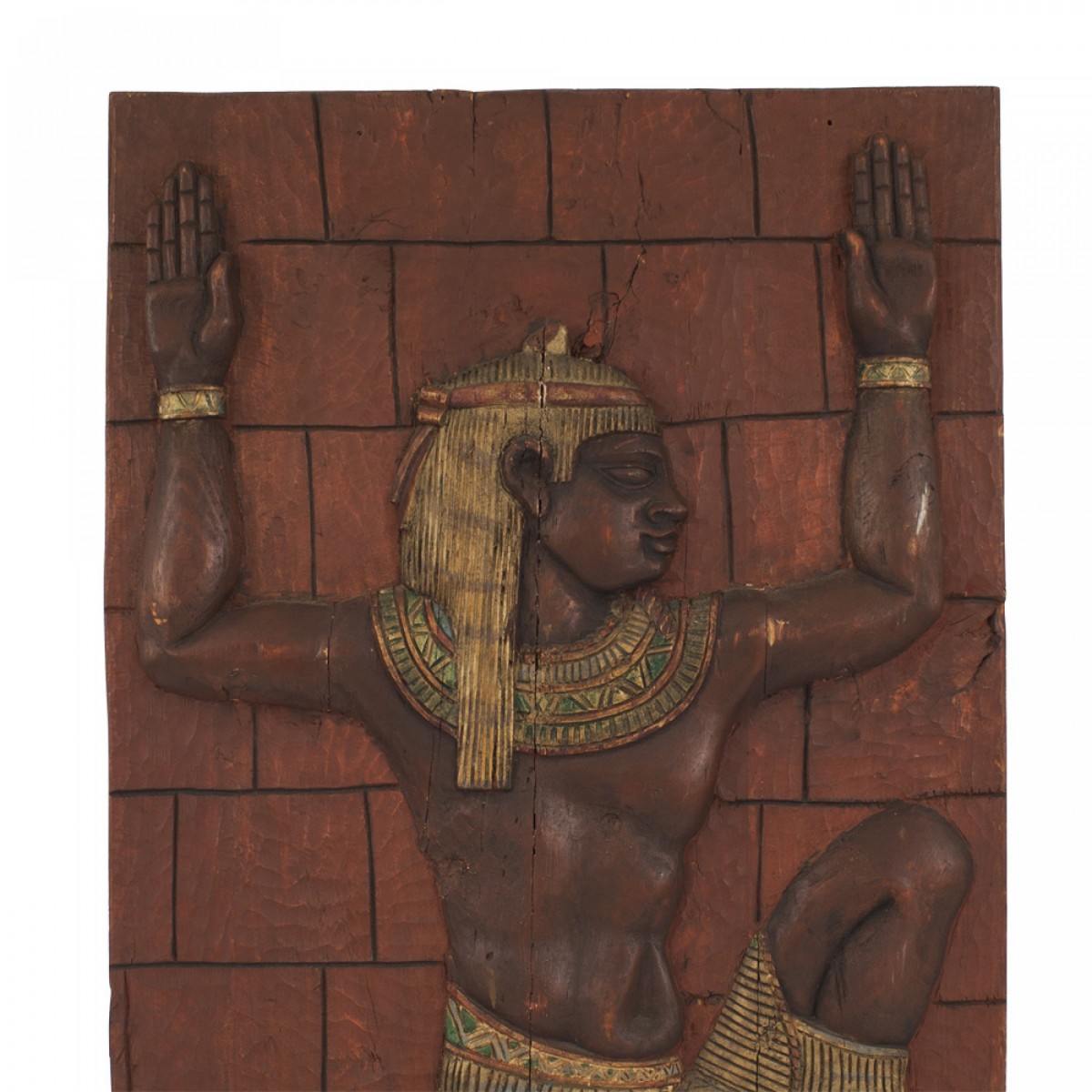 Egyptian Revival-style polychromed wall plaque featuring a costumed Egyptian figure.