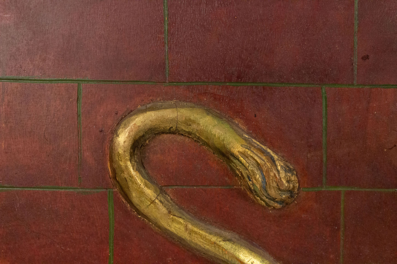 Egyptian style (20th Century) painted red and gold wall plaque with winged bull.