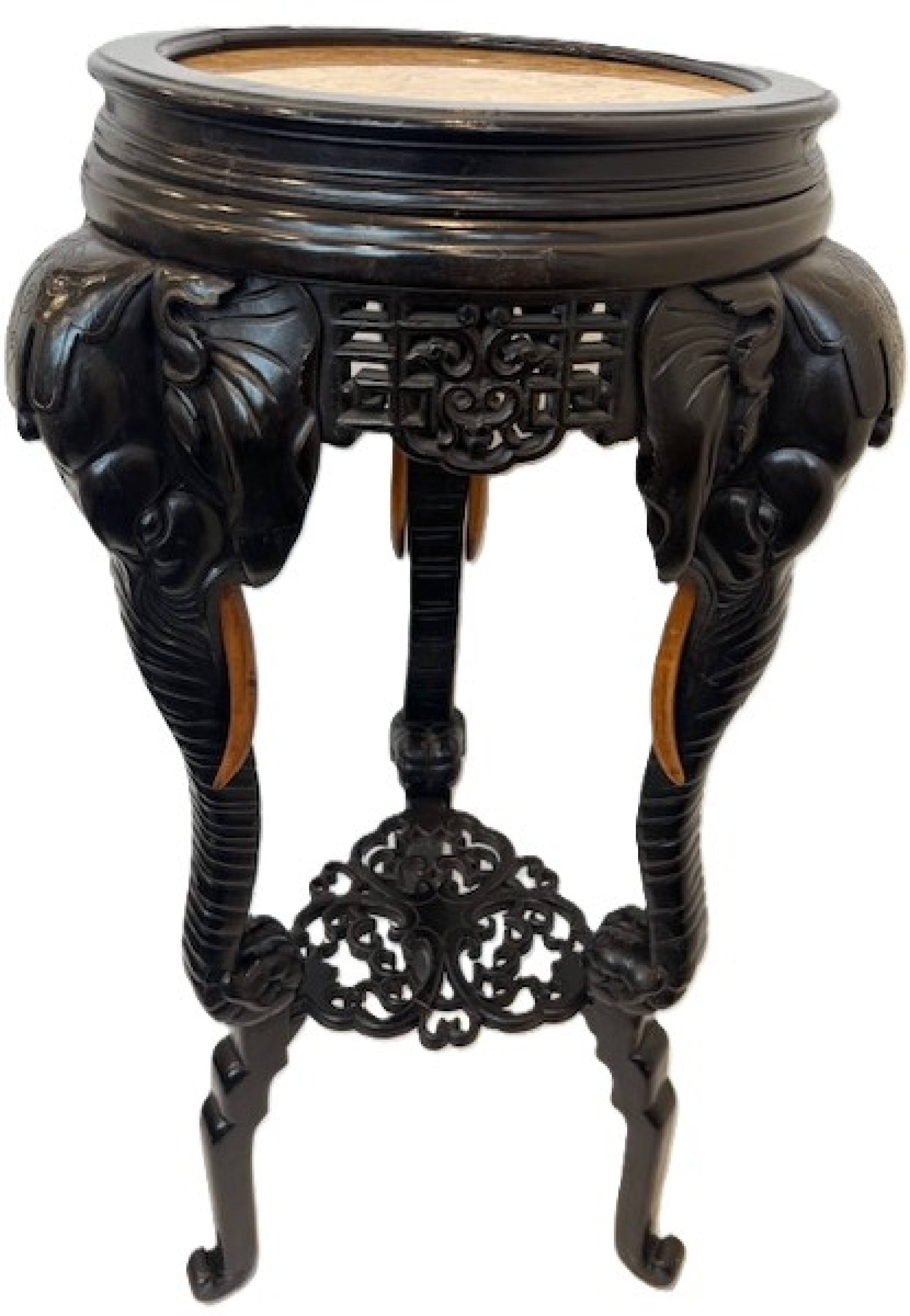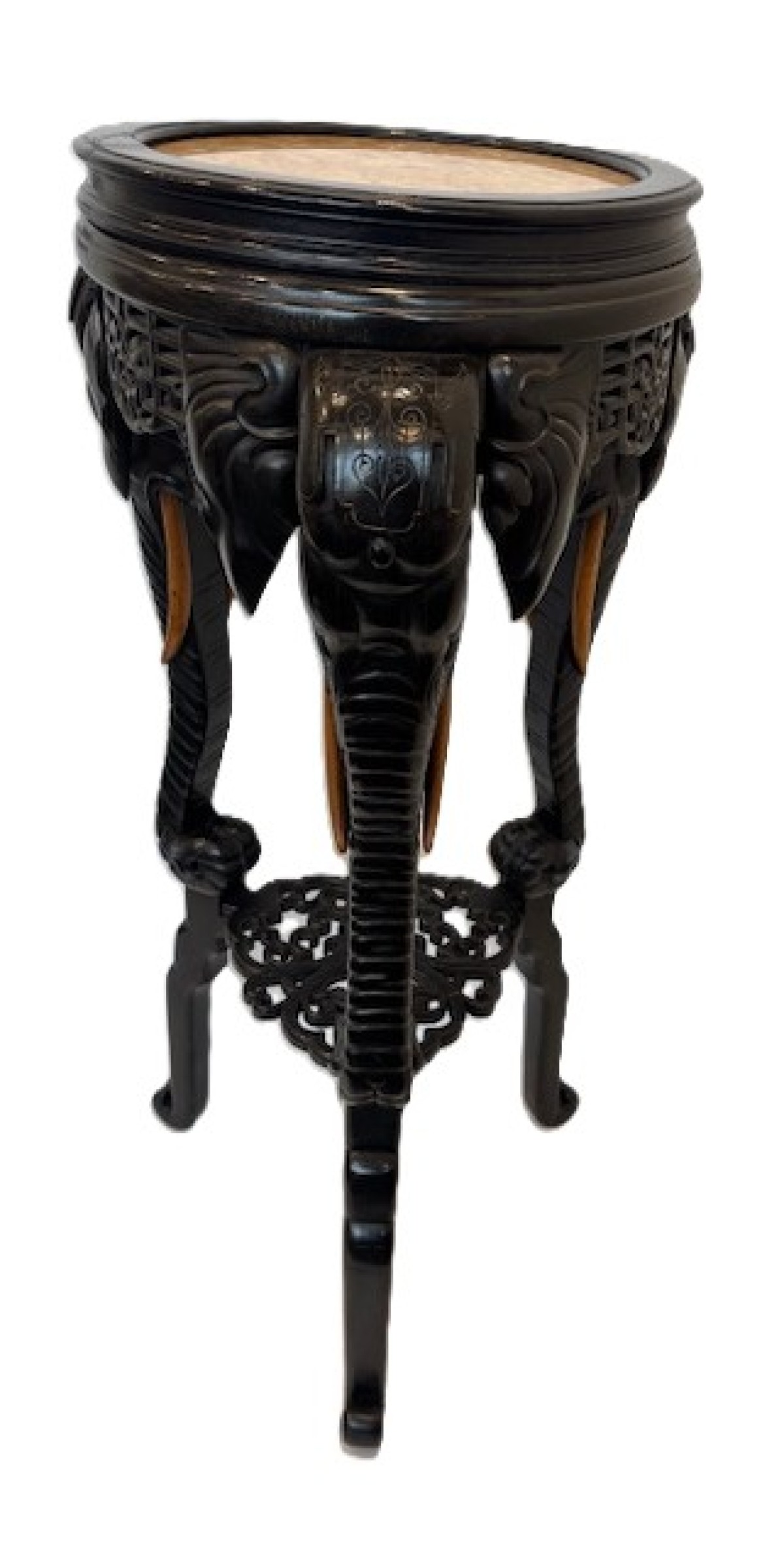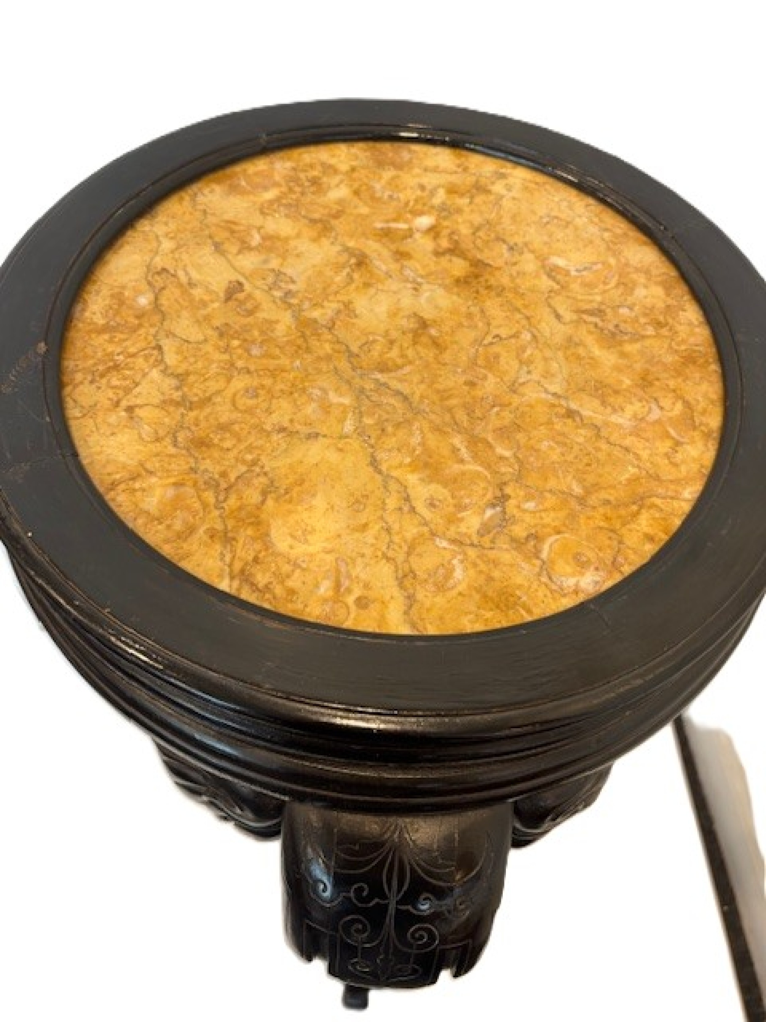 English Regency style ebonized 3 elephant leg pedestal and inset marble top
