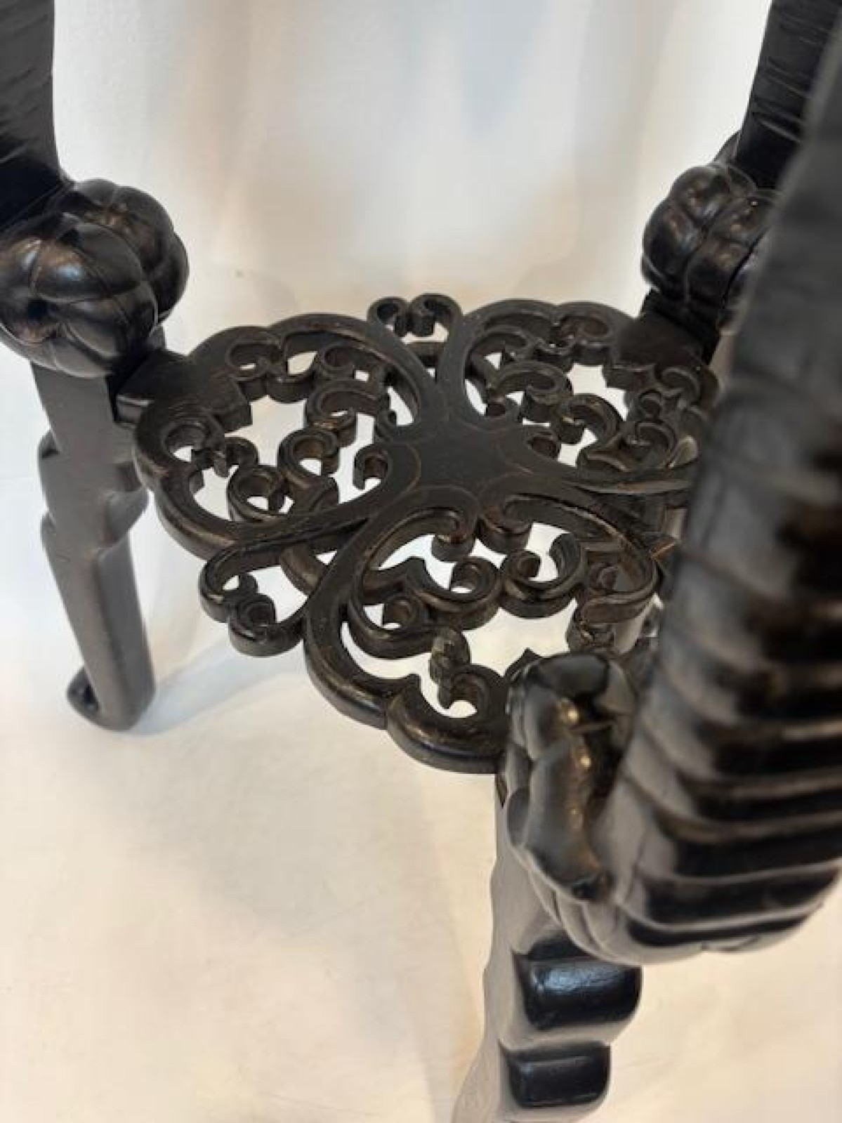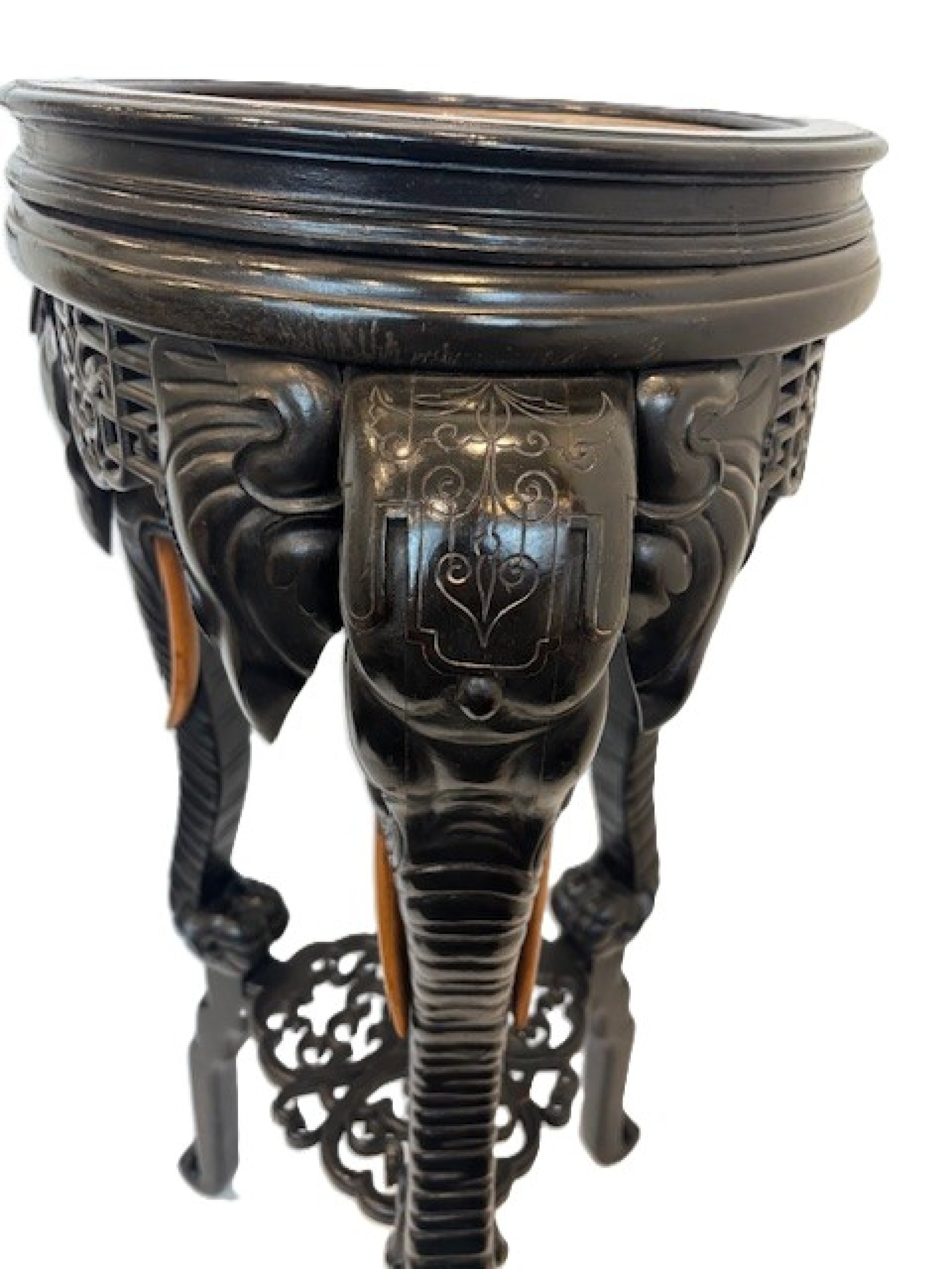 English Regency style ebonized 3 elephant leg pedestal with a filigree carved apron and stretcher and having an inset round yellow marble top