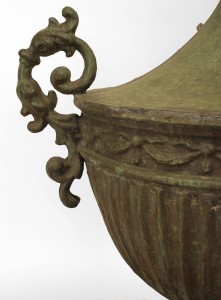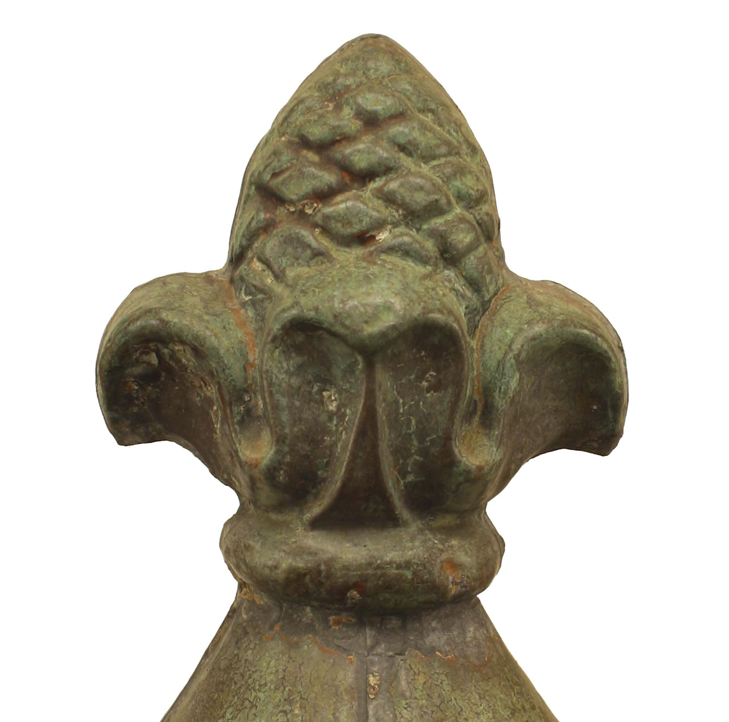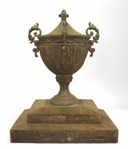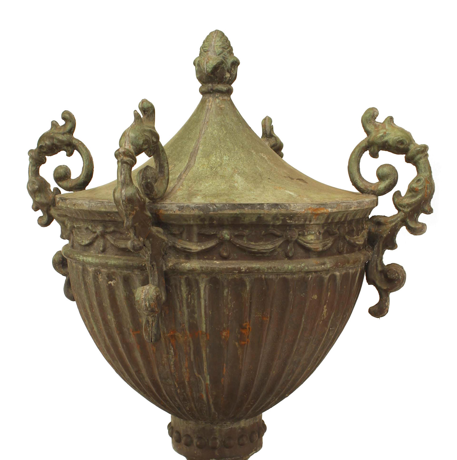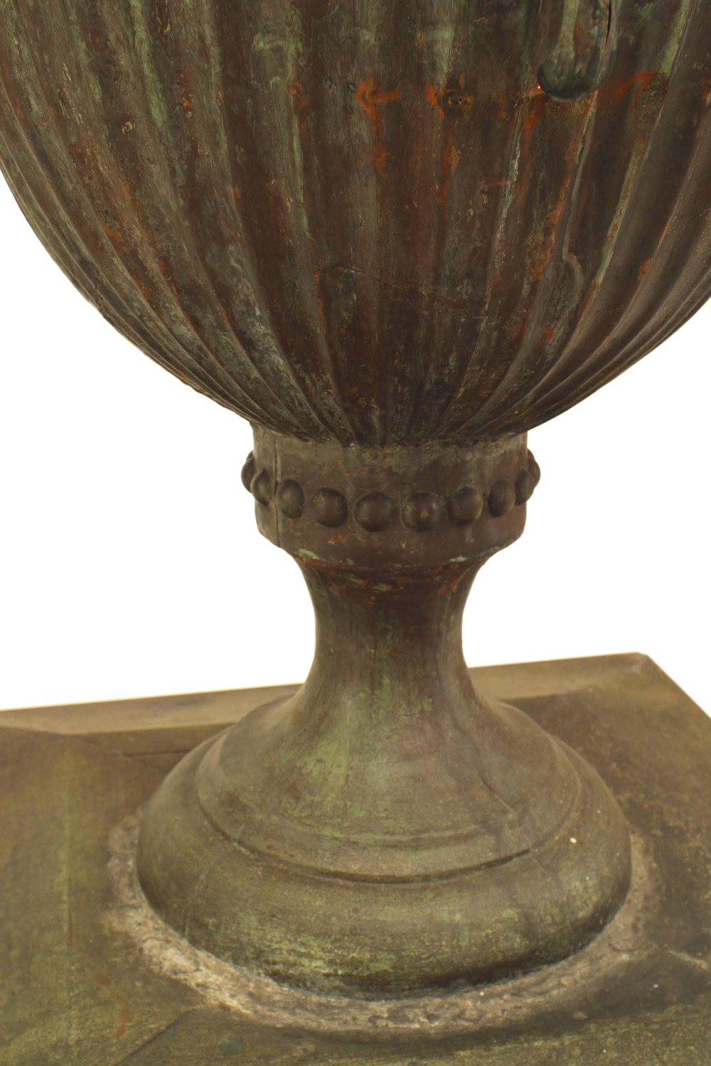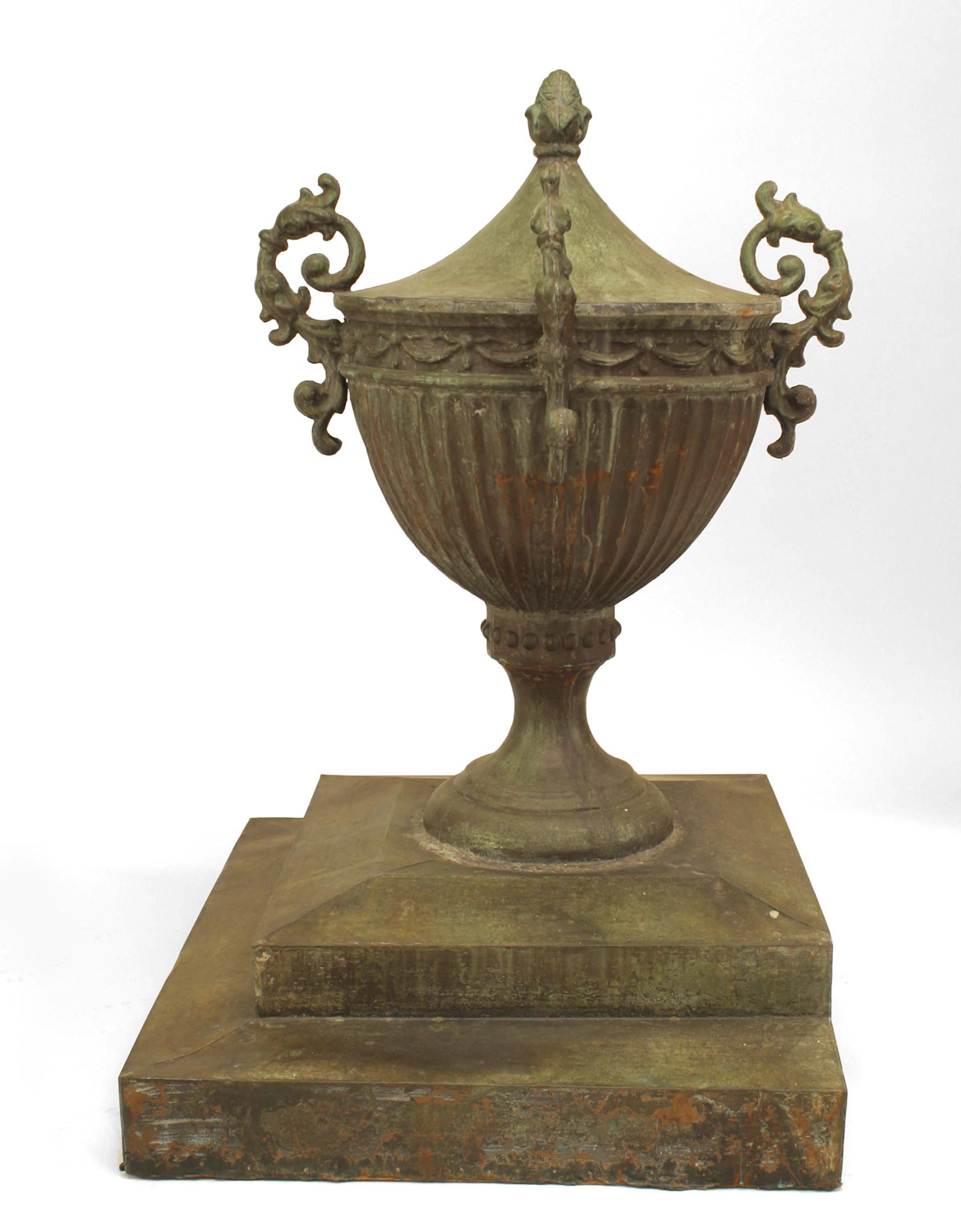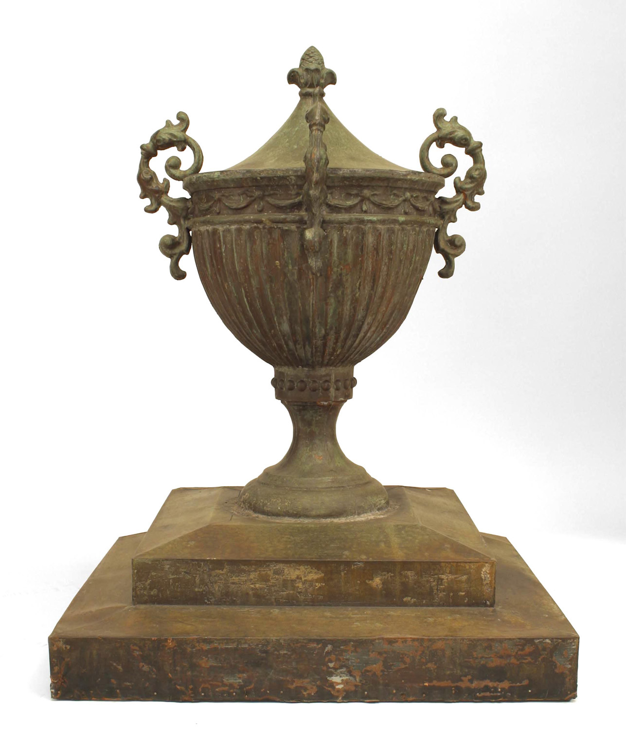 2 English Adam style (18/19th Cent) copper outdoor urns with floral top finial on square base. (Priced Each).