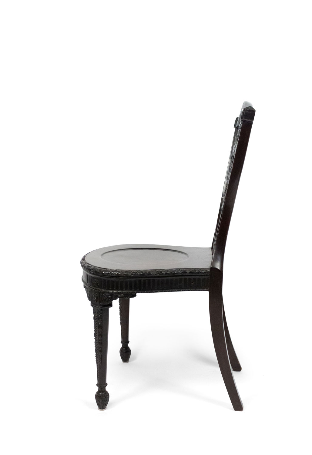 2 English Adam style (19th Cent) mahogany shield back (hall) side chairs with round carved seat. (PRICED EACH)