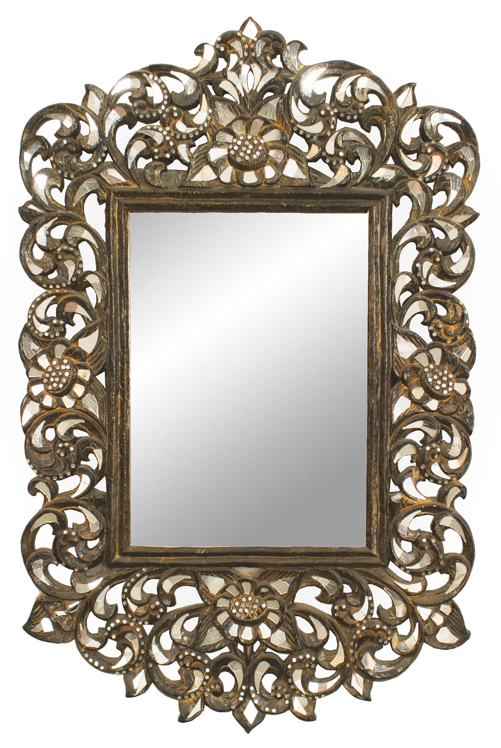 English Anglo-Indian style (20th Century) ebonized and filigree carved wall mirror with a shaped frame with smaller decorative pieces of mirror.