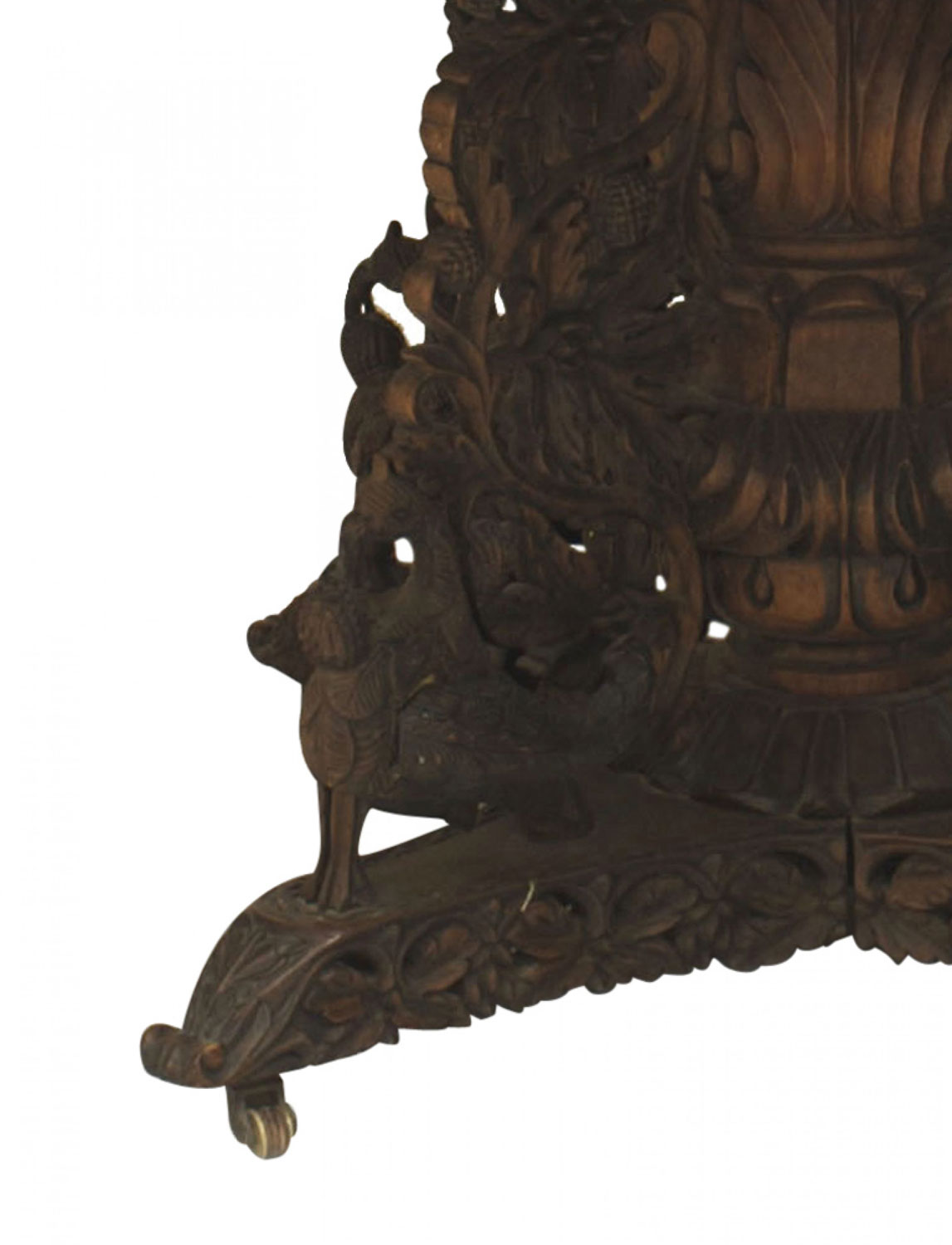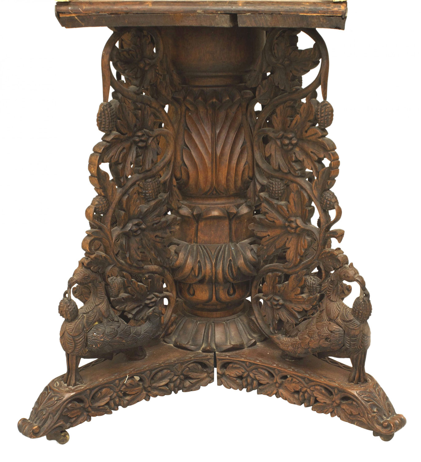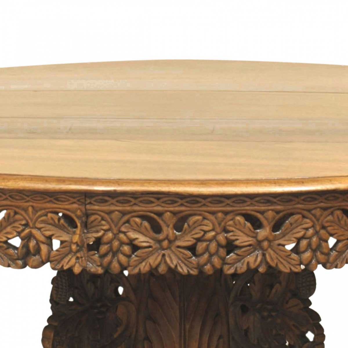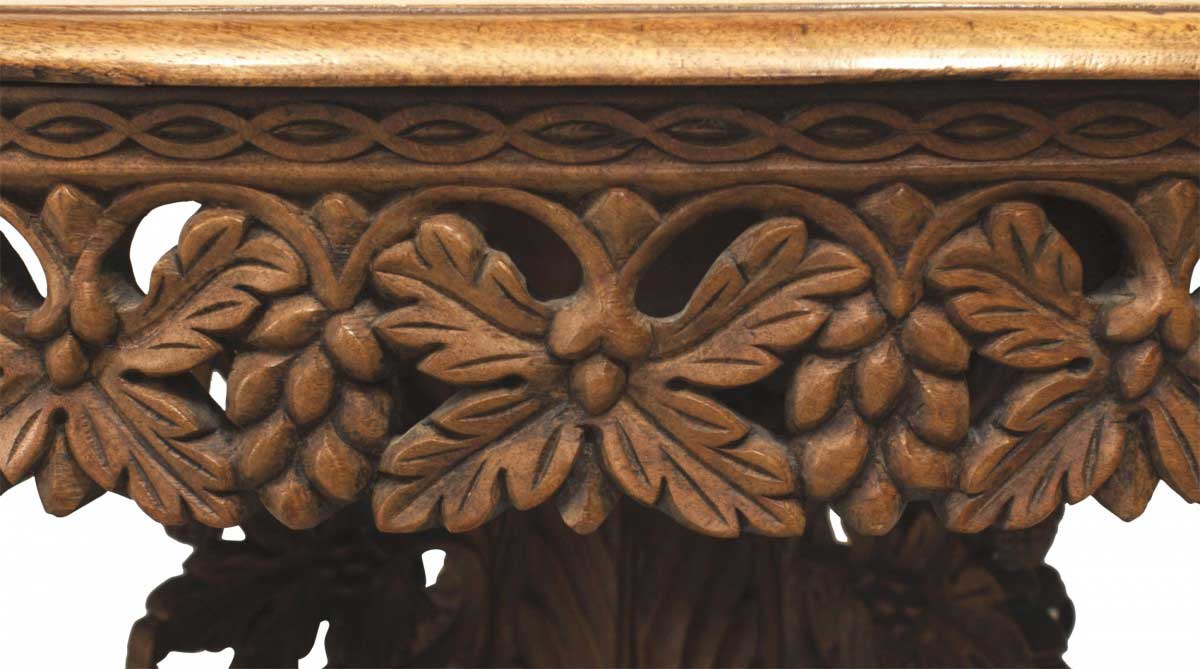 English Anglo-Indian (mid-19th century) teak and padauk circular table with a filigree apron and pedestal base having intricate foliate and aviary carvings.