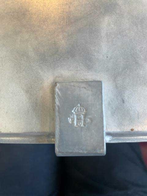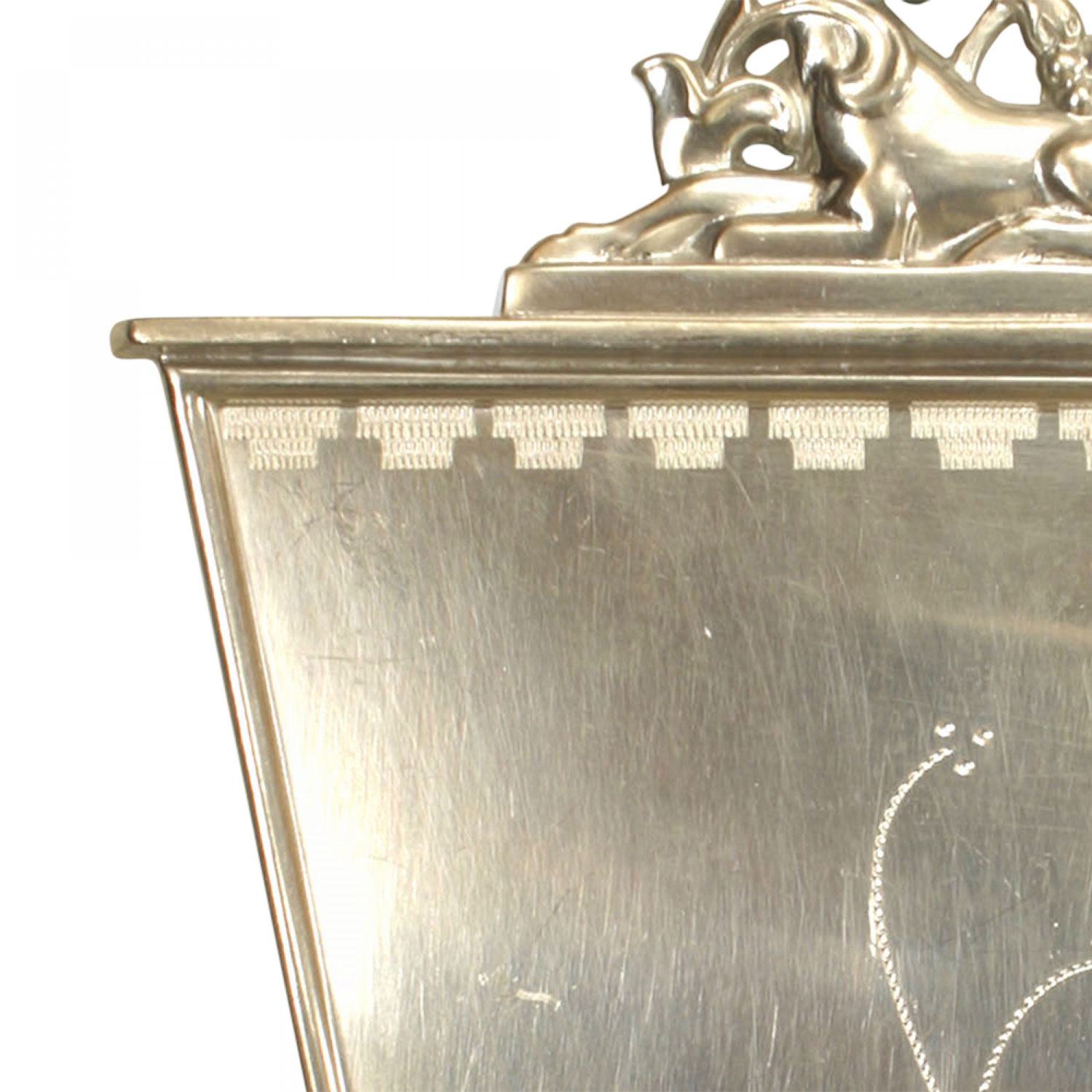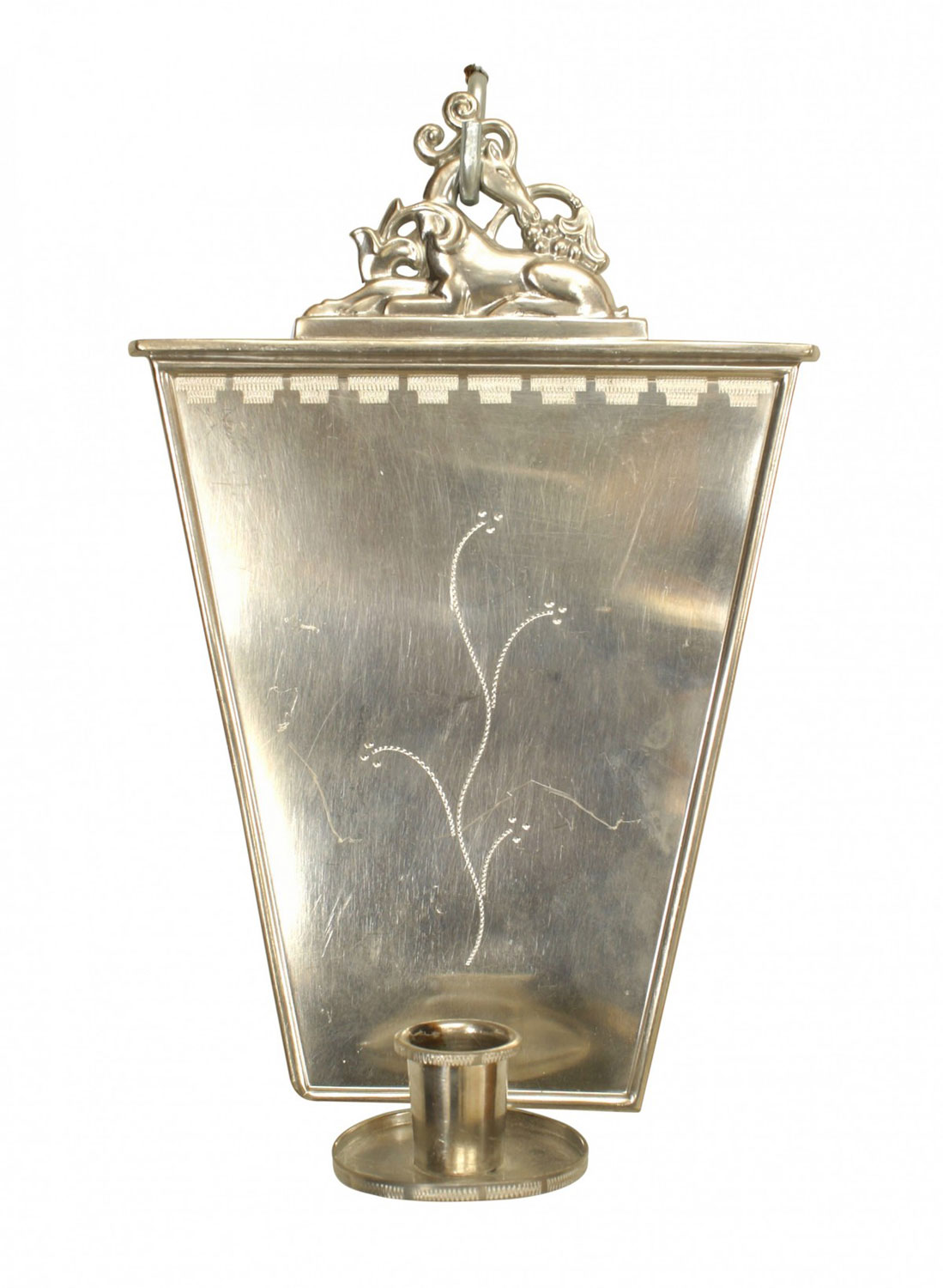 2 English Art Deco pewter wall sconces with a single arm, keystone-form backplates, and stylized deer pediments.(PRICED EACH)