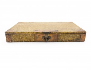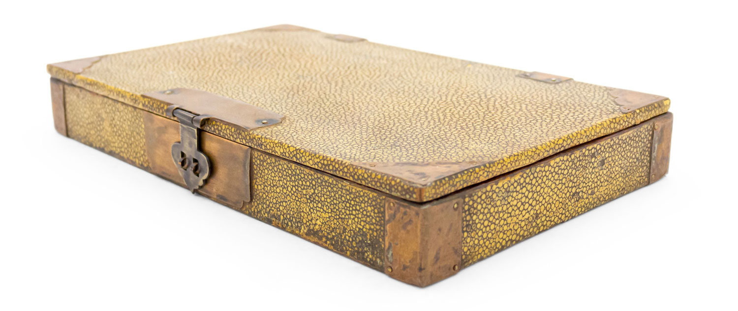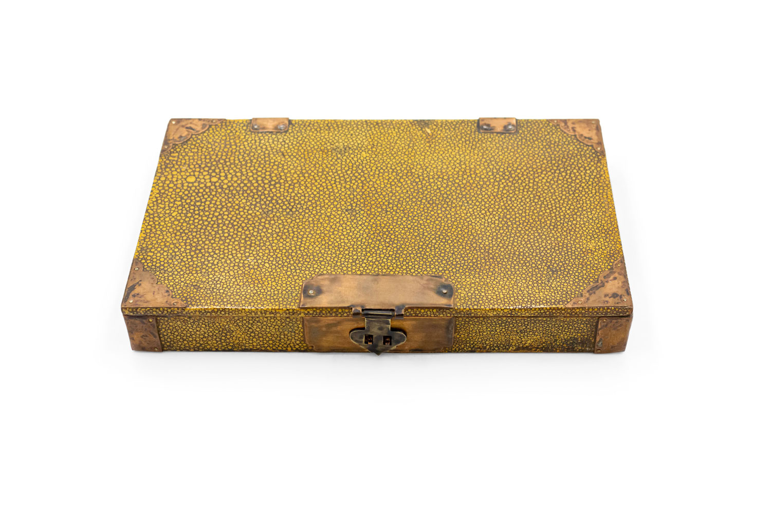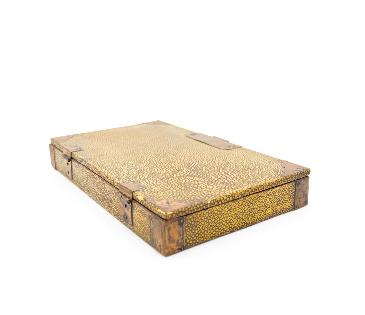 English Art Deco large rectangular dark yellow shagreen box with a copper latch and trim.
