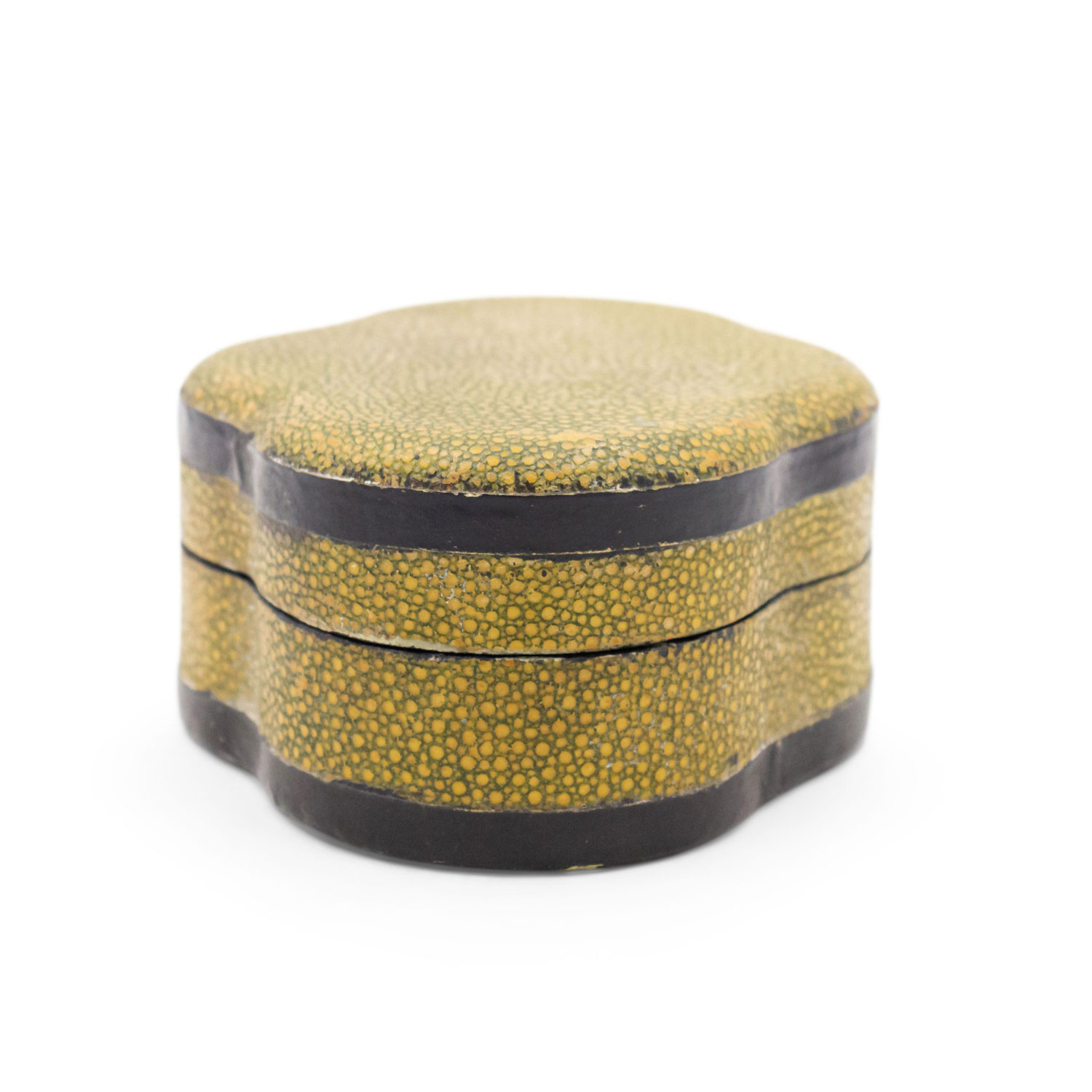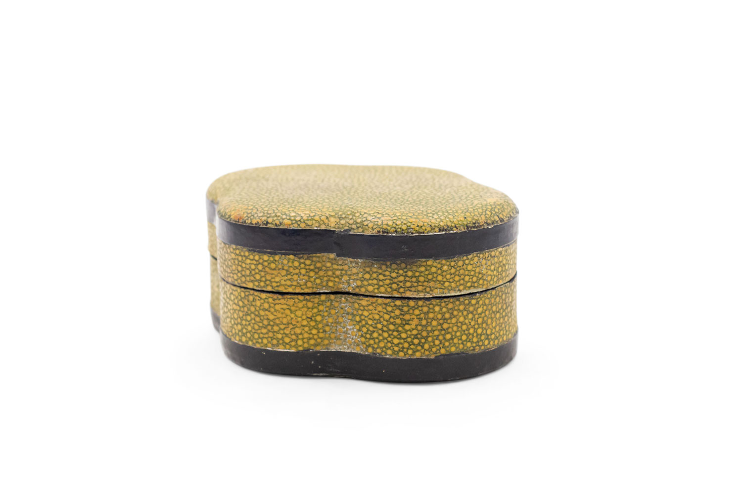 English Art Deco yellow/green shagreen ovoid shaped box with ebonized trim.