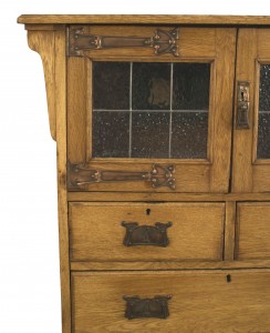 English Arts and Crafts oak cupboard cabinet with copper Art Nouveau hardware and 2 leaded glass doors.