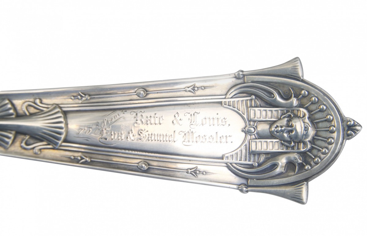 Set of 9 various English Arts & Crafts Egyptian Revival sterling silver spoons with sphinx head & fan design (ladle, cake knife, 7 various small spoons) marked B. F. Norris & Co-1872)