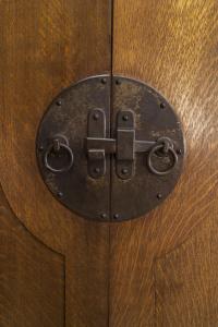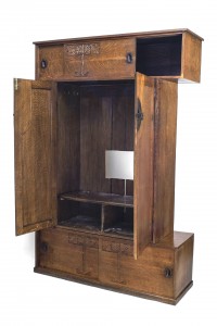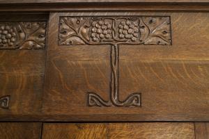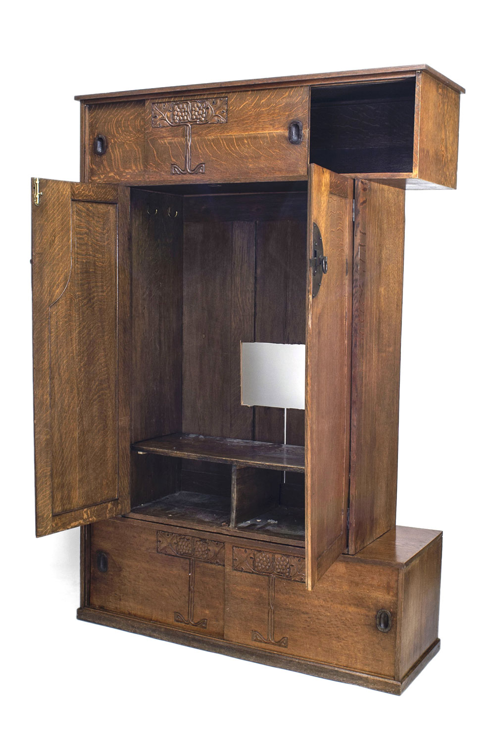 English Arts & Crafts oak armoire with a top and bottom cabinet with sliding doors and floral carved design centering a 2 door cabinet (possibly LIBERTY)