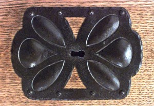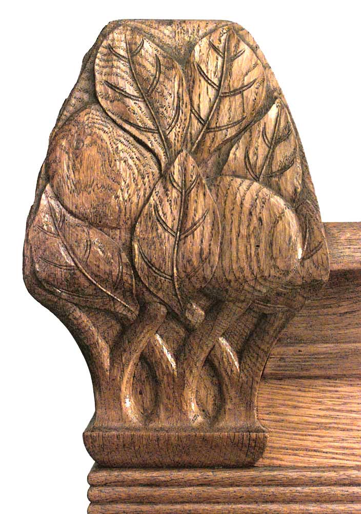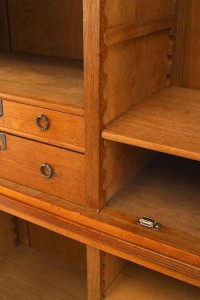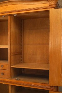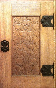 Swedish Arts & Crafts (circa 1915) oak 4 door cabinet with carved floral design finials & trim and decorative metal hardware (by designer and architect CARL WESTMAN).