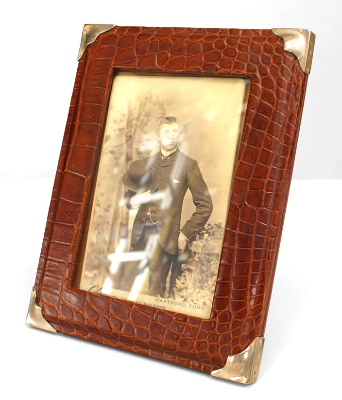 English Victorian (20th Century) brown crocodile easel picture frame with silver corners.