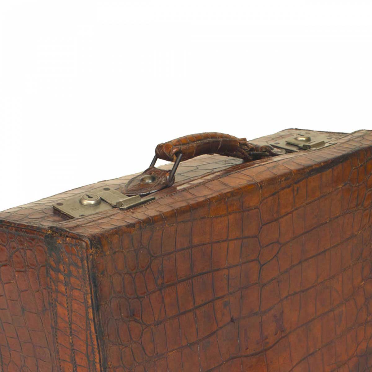 English large brown crocodile valise with metal latches and an attache case interior.