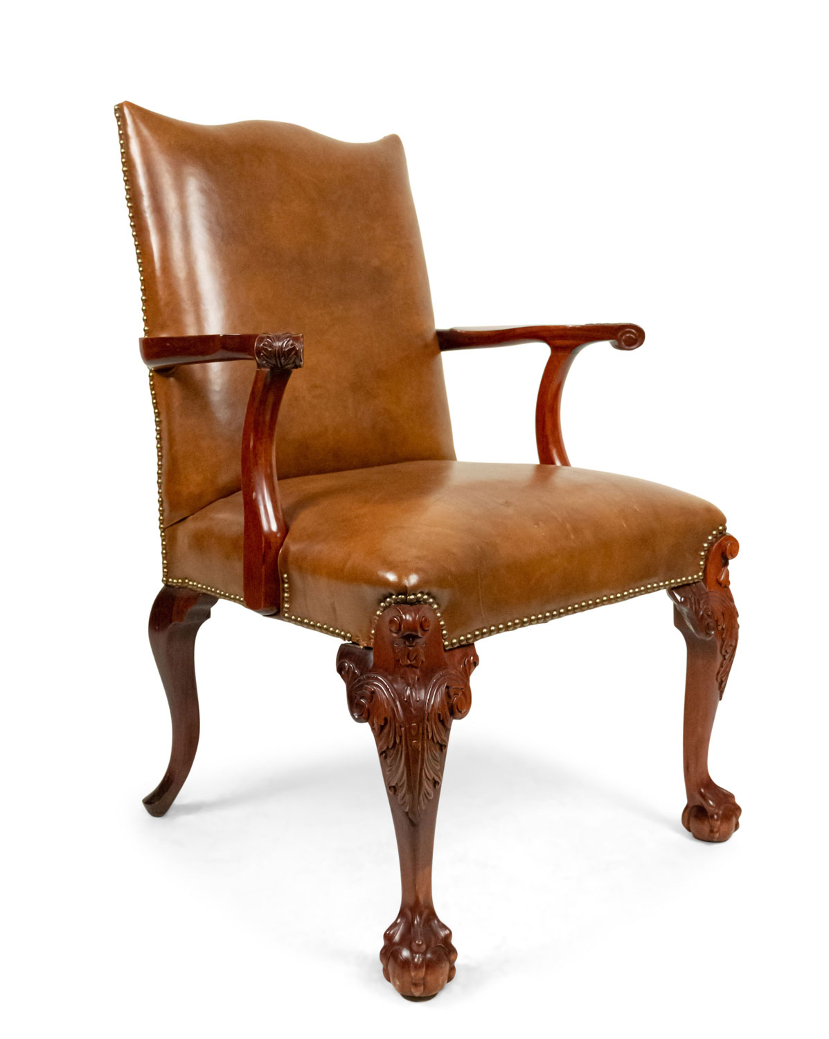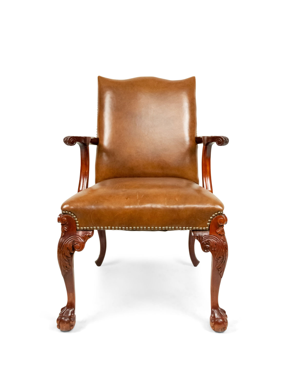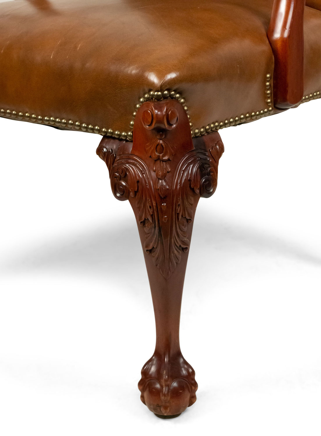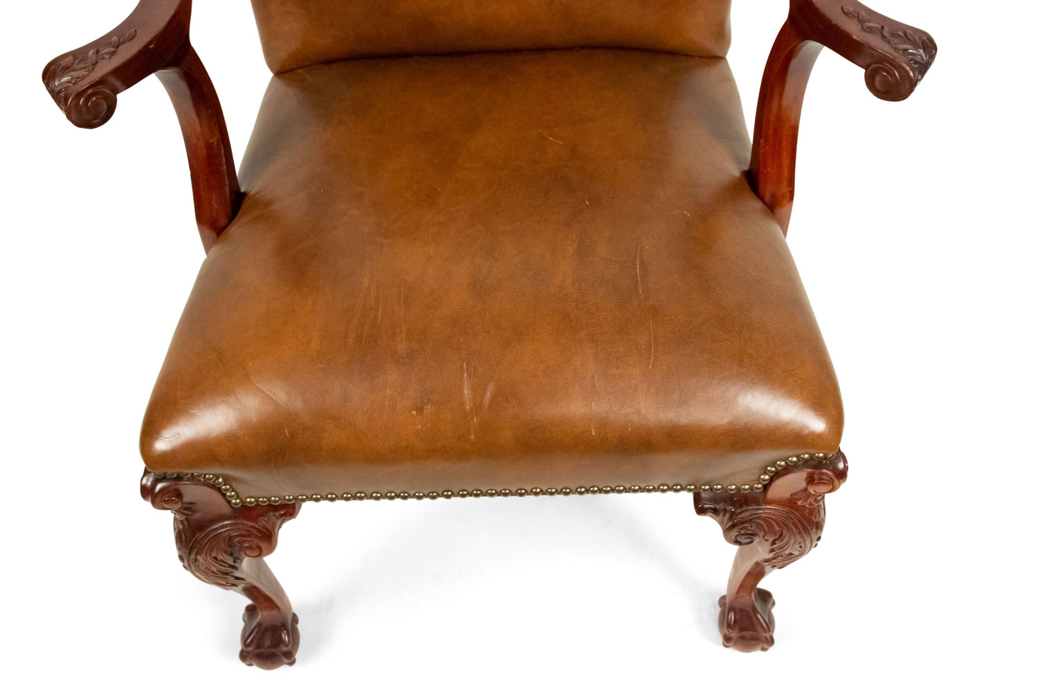 17 English Chippendale style mahogany open arm chairs with close nailed brown leather upholstery on cabriole legs with ball & claw feet (late 20th Cent) (PRICED EACH)