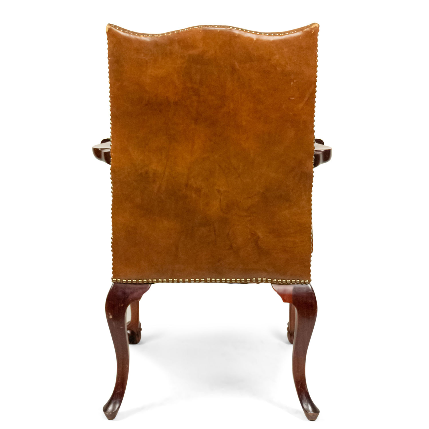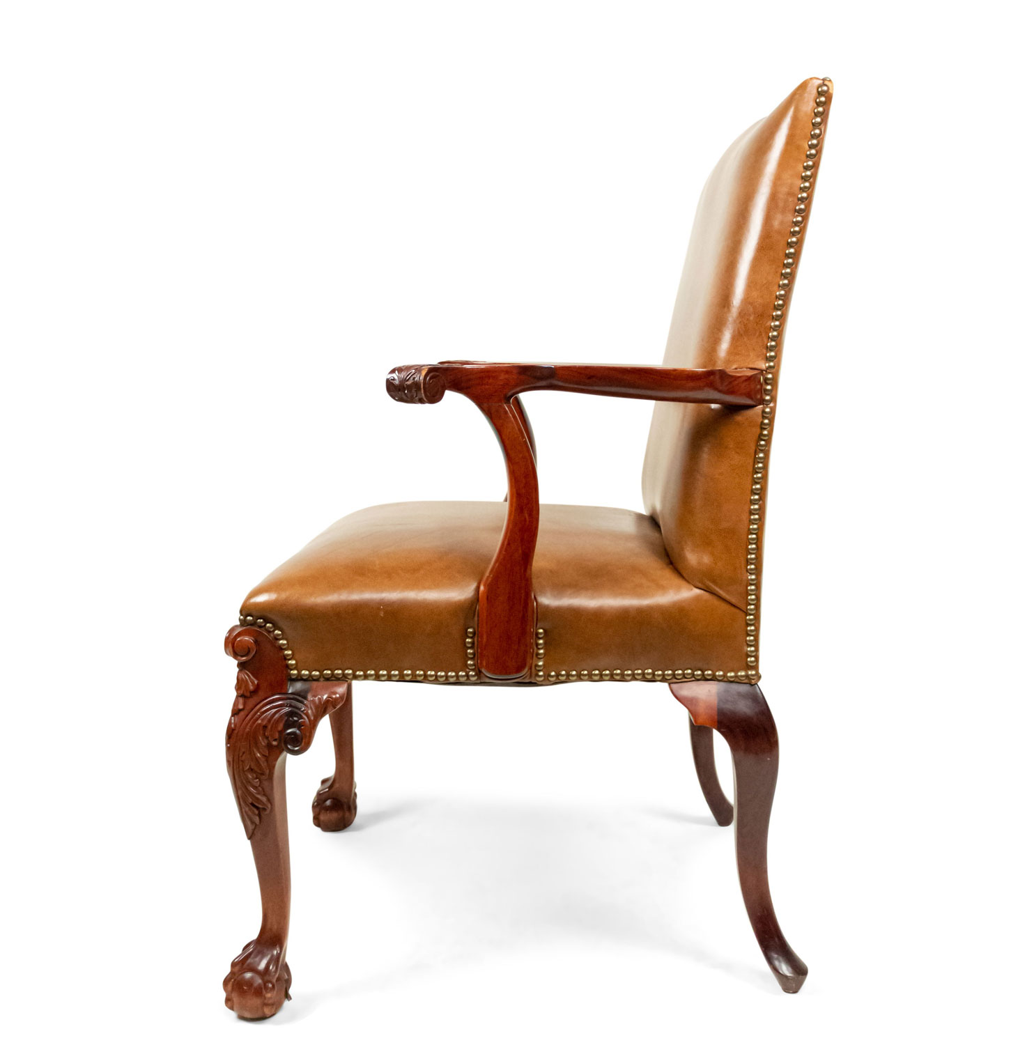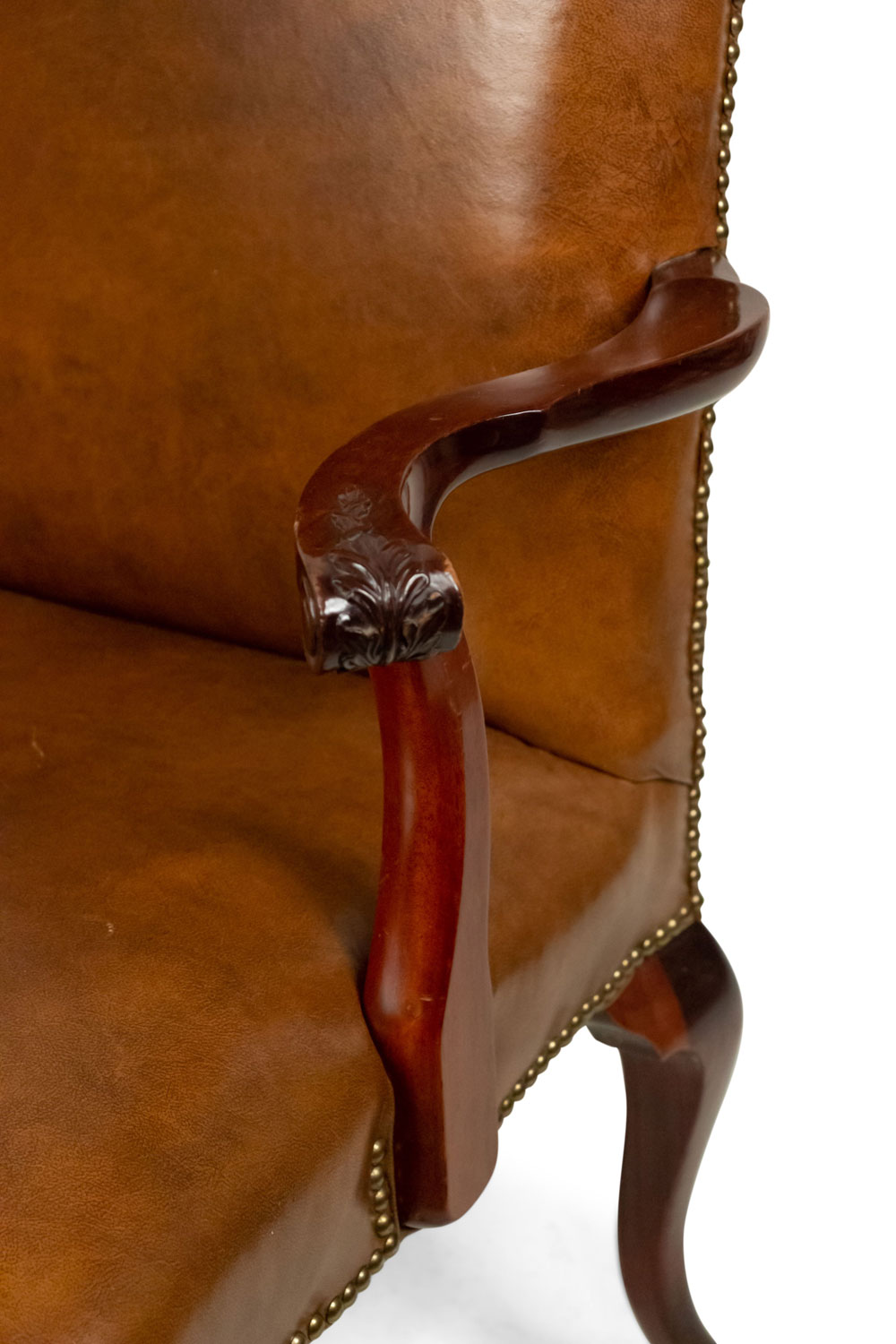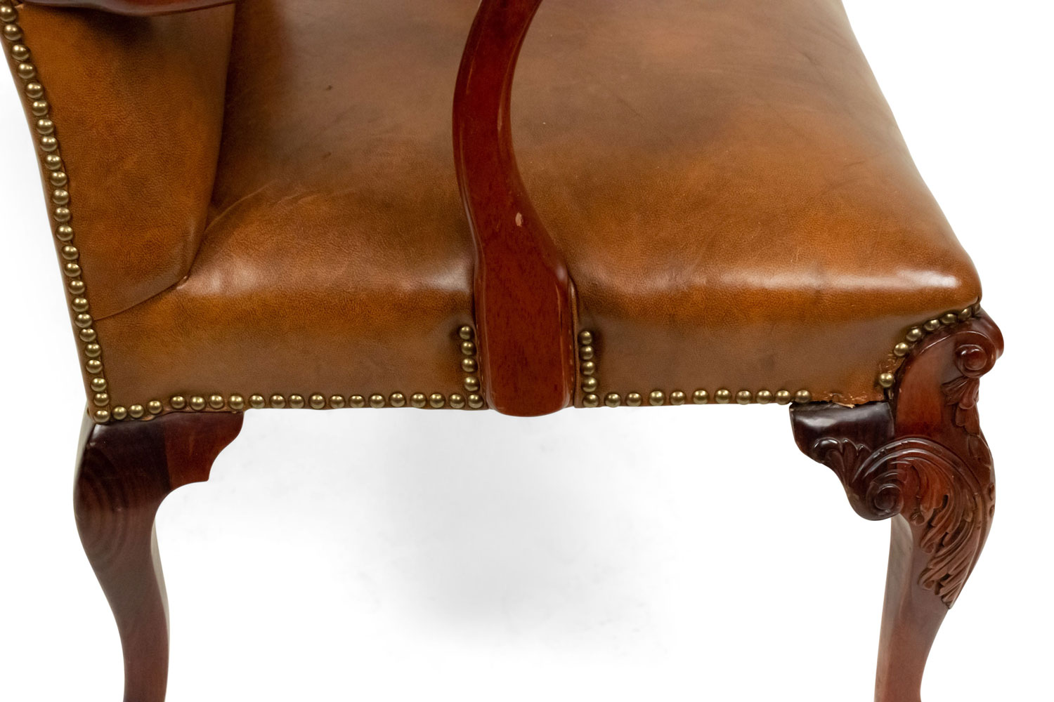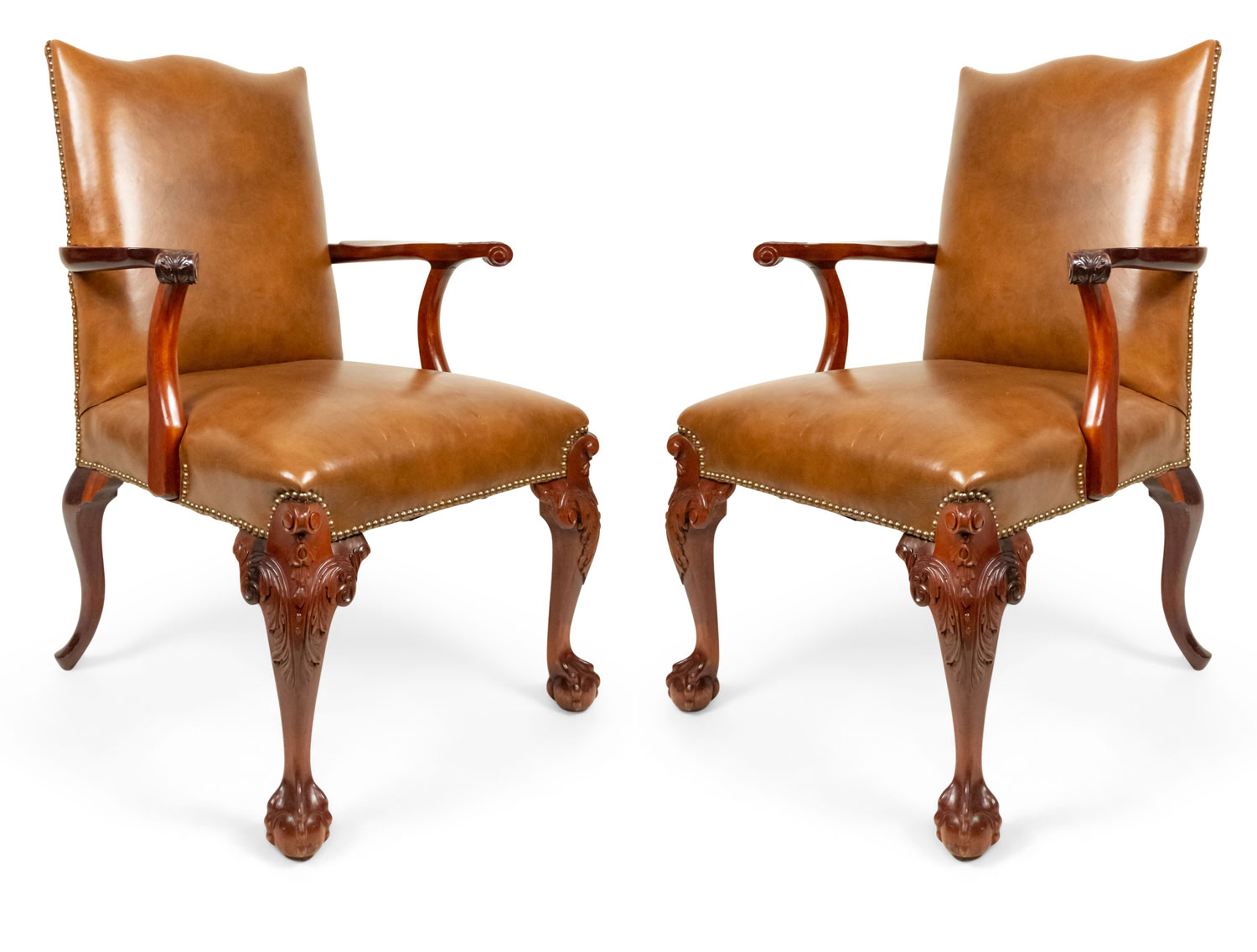 17 English Chippendale style mahogany open arm chairs with close nailed brown leather upholstery on cabriole legs with ball & claw feet (late 20th Cent) (PRICED EACH)