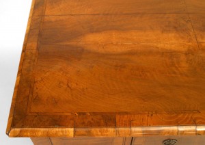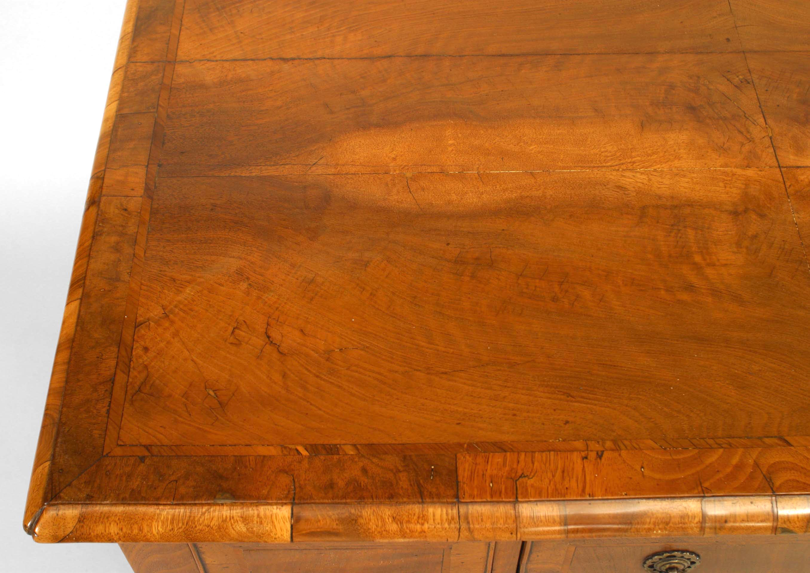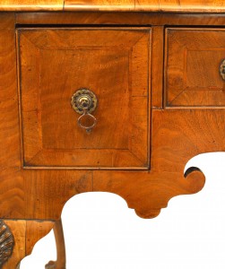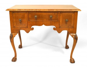 English Chippendale style (18th Century) burl walnut veneer lowboy with 3 drawers and brass handles.