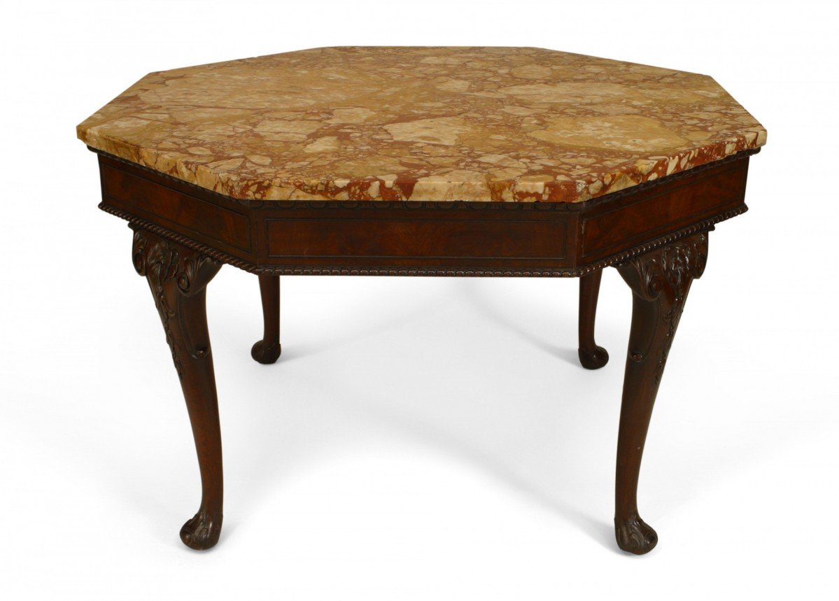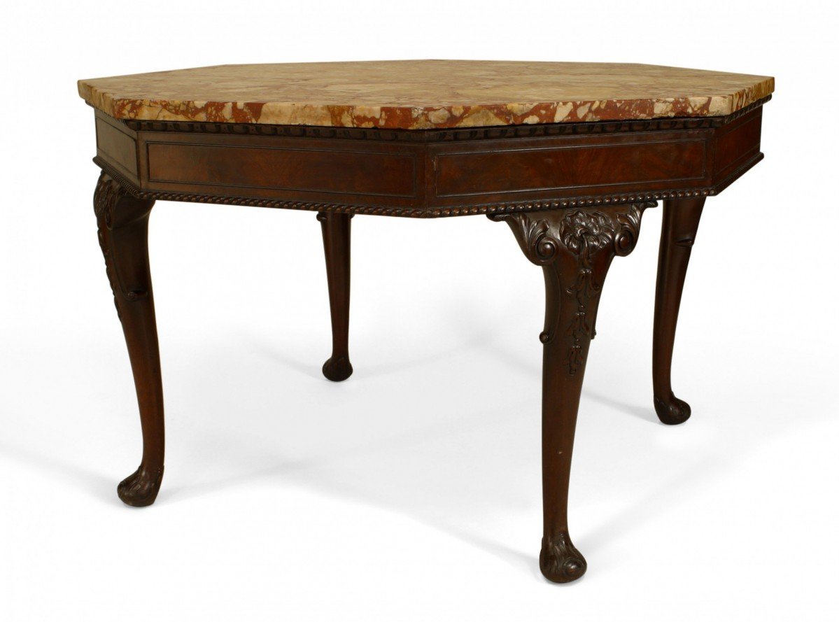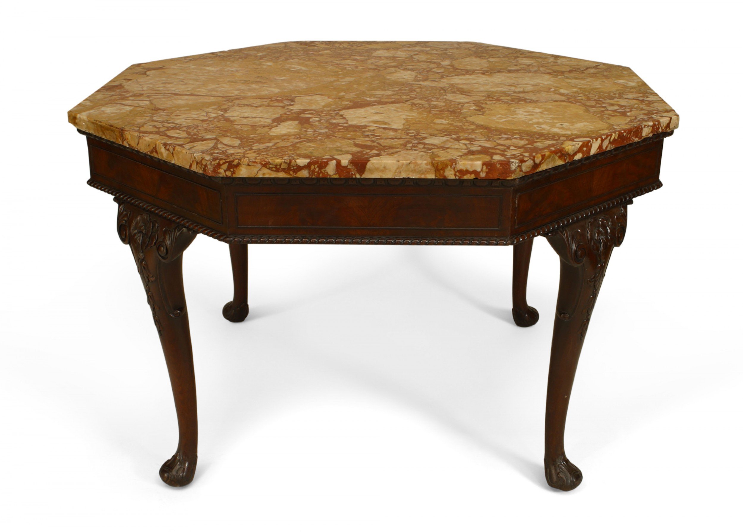 English Chippendale/Georgian (19th Century) mahogany center table with carved cabriole legs supporting an octagonal rouge marble top.