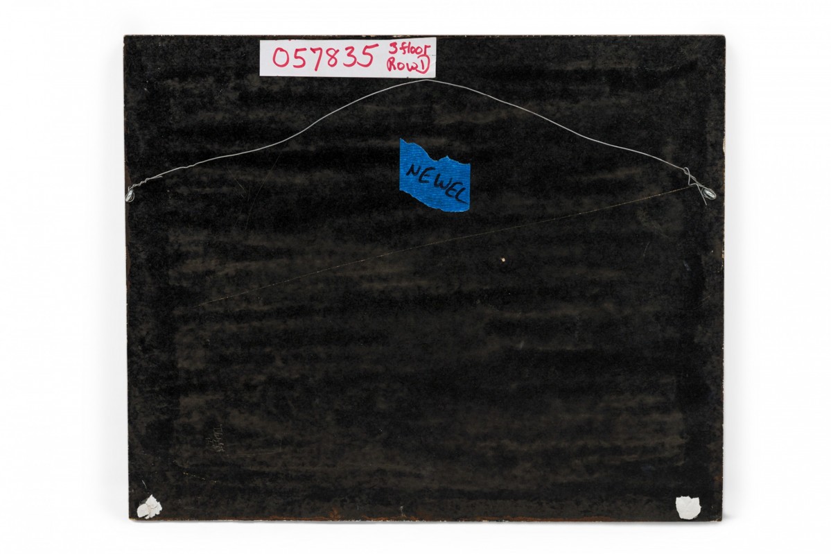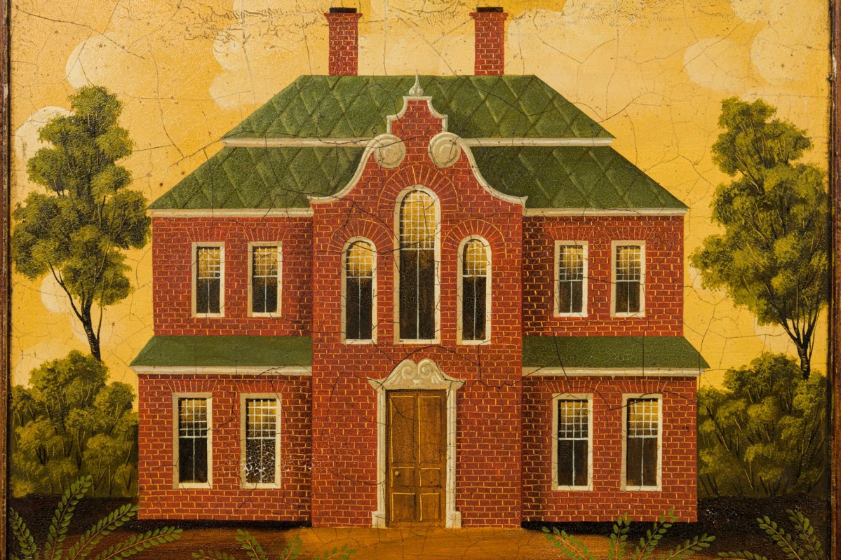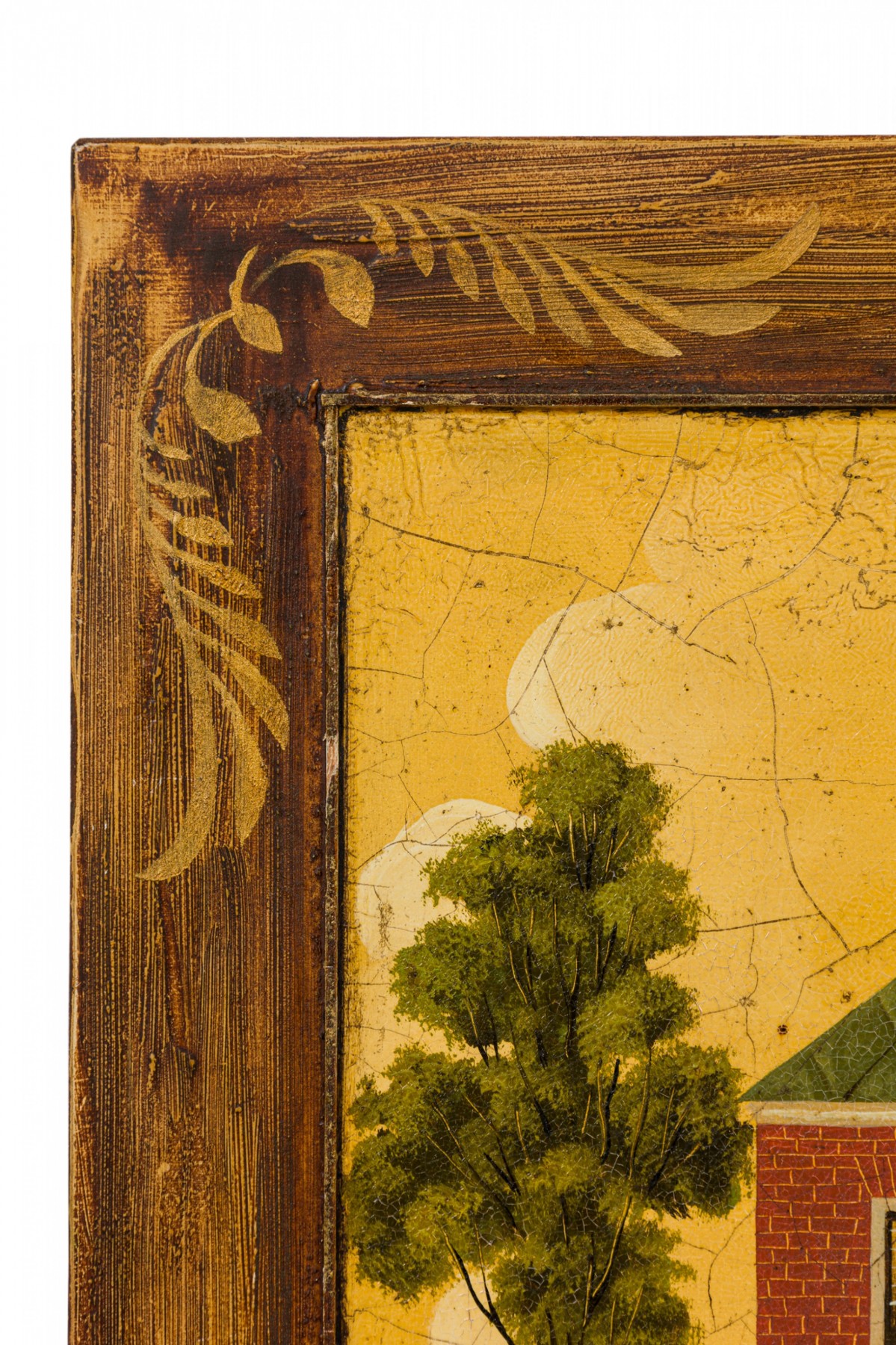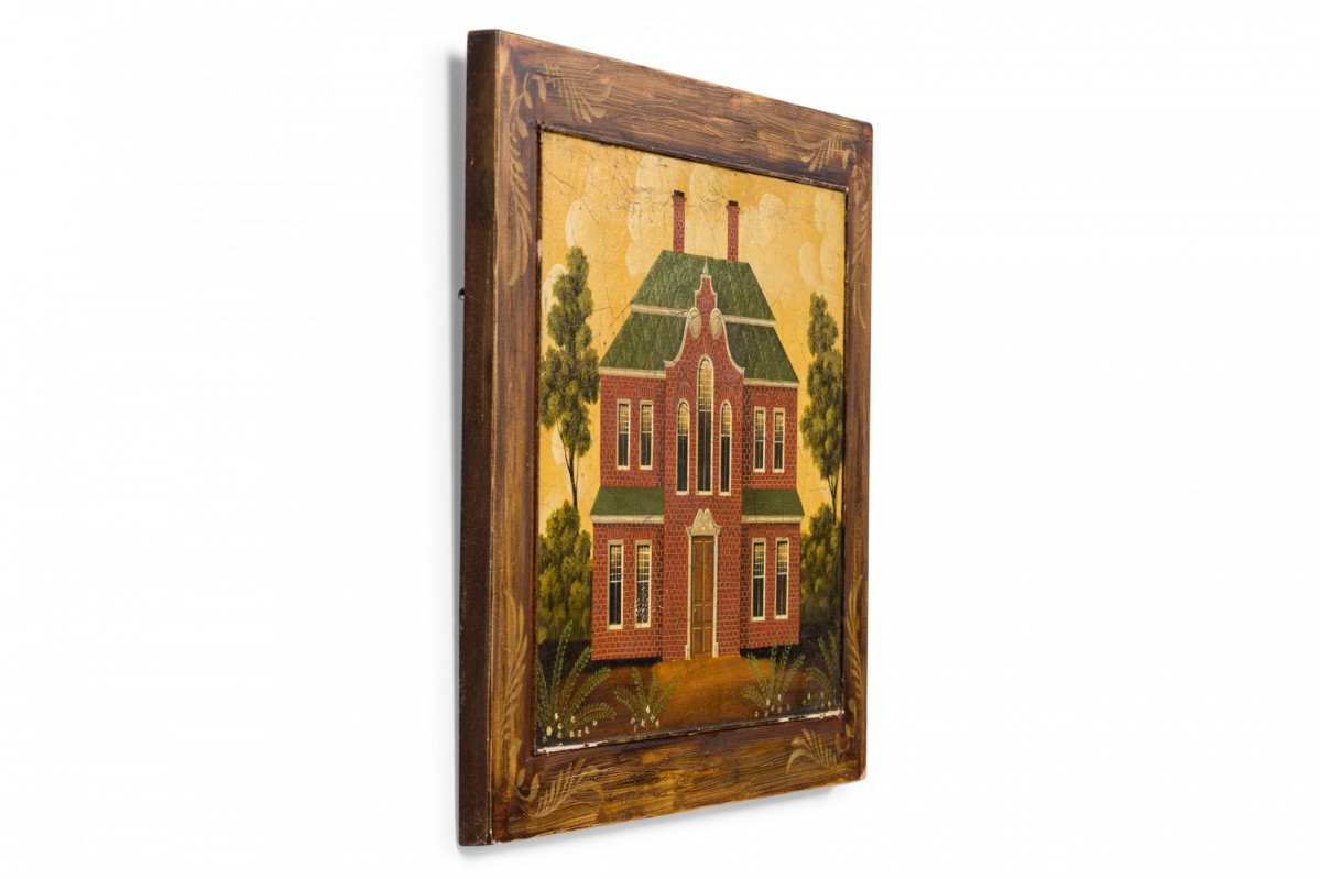 English Country style (20th Cent) acrylic on board painting, depicting a brick house, within faux wood and decorated frame. (7 Similar pieces: 057835B, 057835C, 057835D, 057835E, 057835F, 057835G, 057835H)