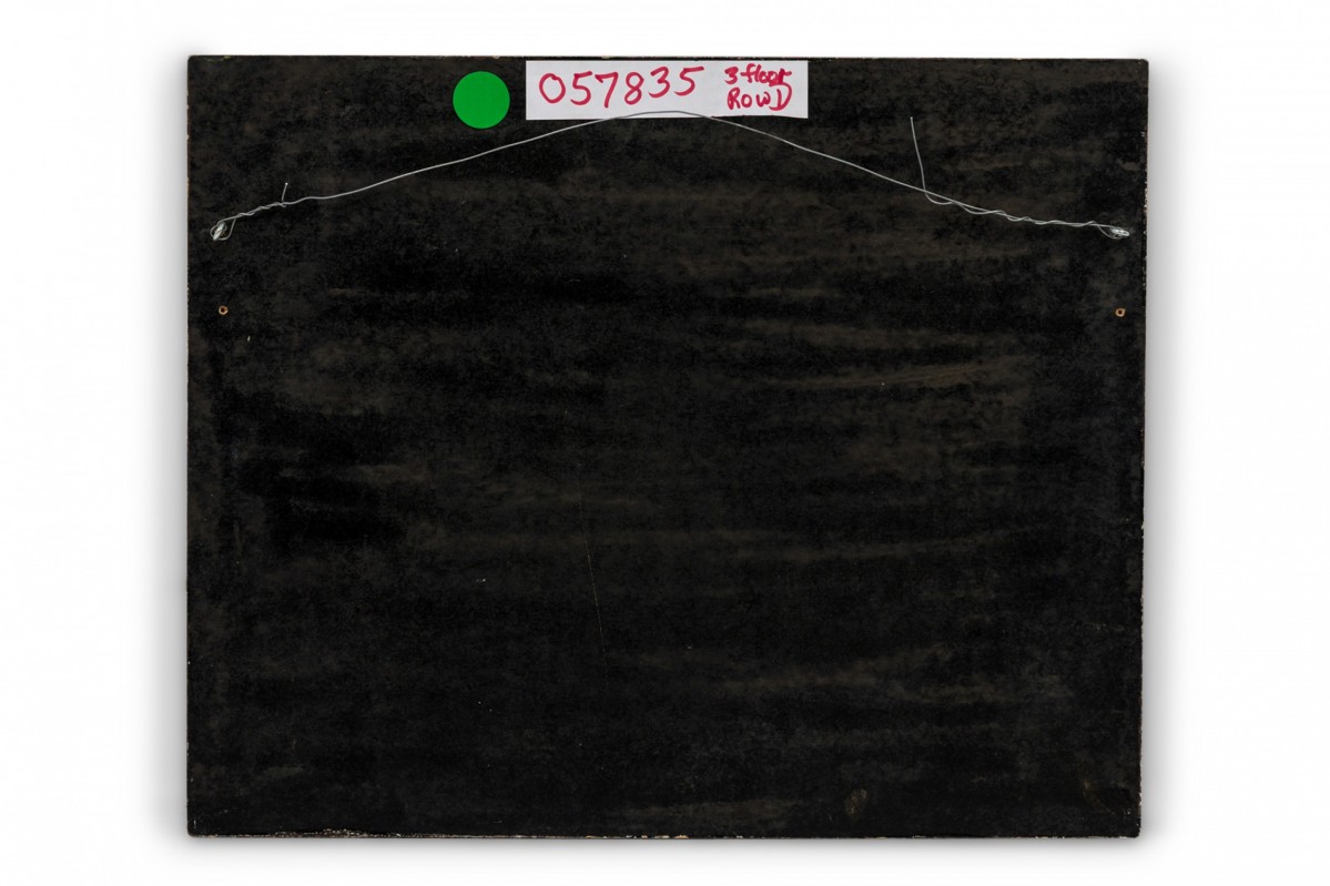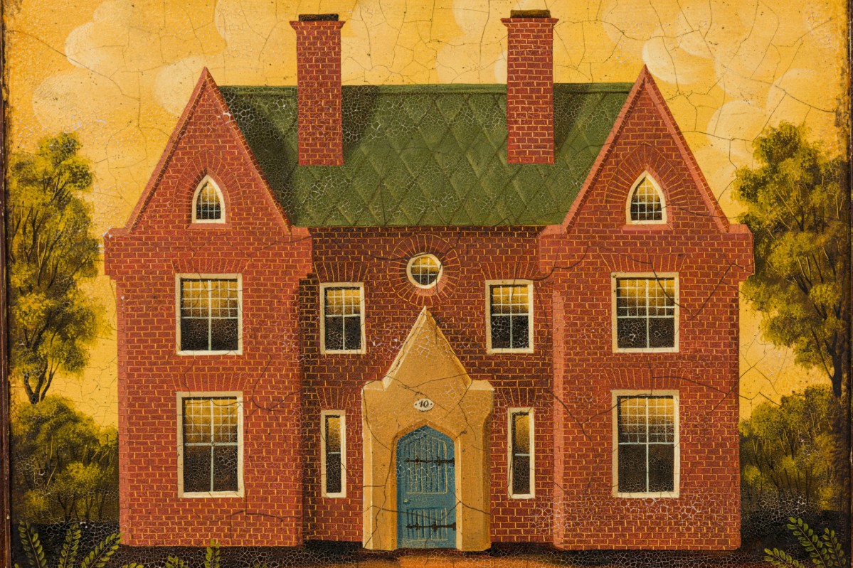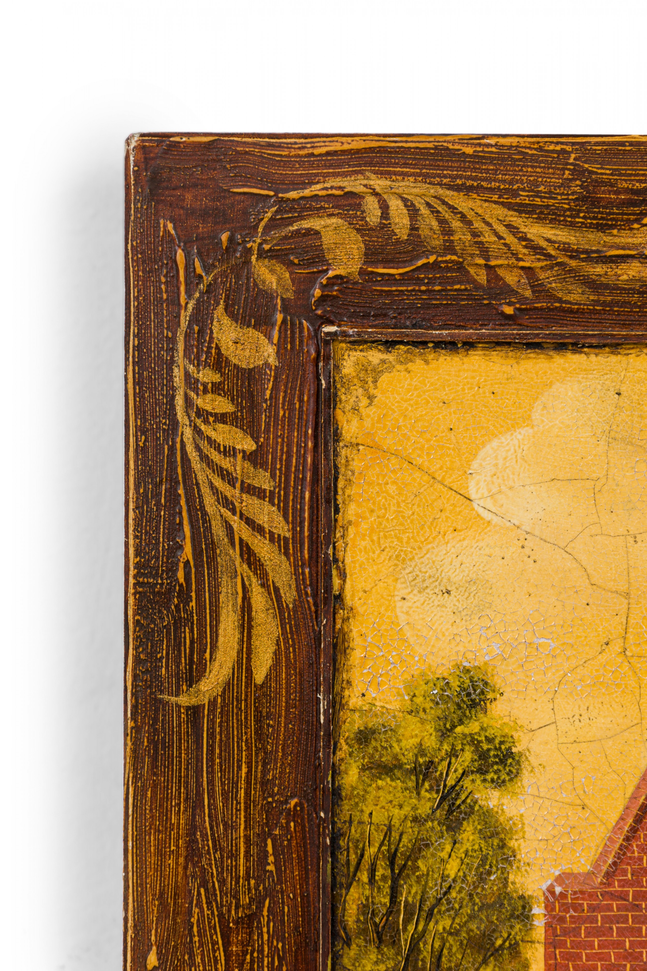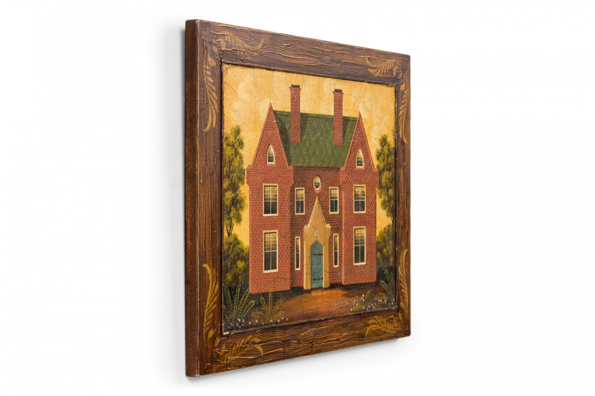 English Country style (20th Cent) acrylic on board painting, depicting a brick house, within faux wood and decorated frame. (7 Similar pieces: 057835A, 057835B, 057835C, 057835E, 057835F, 057835G, 057835H)