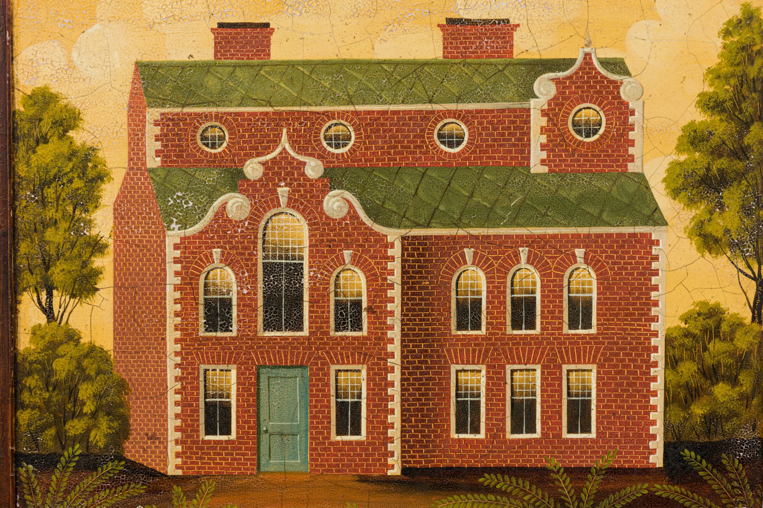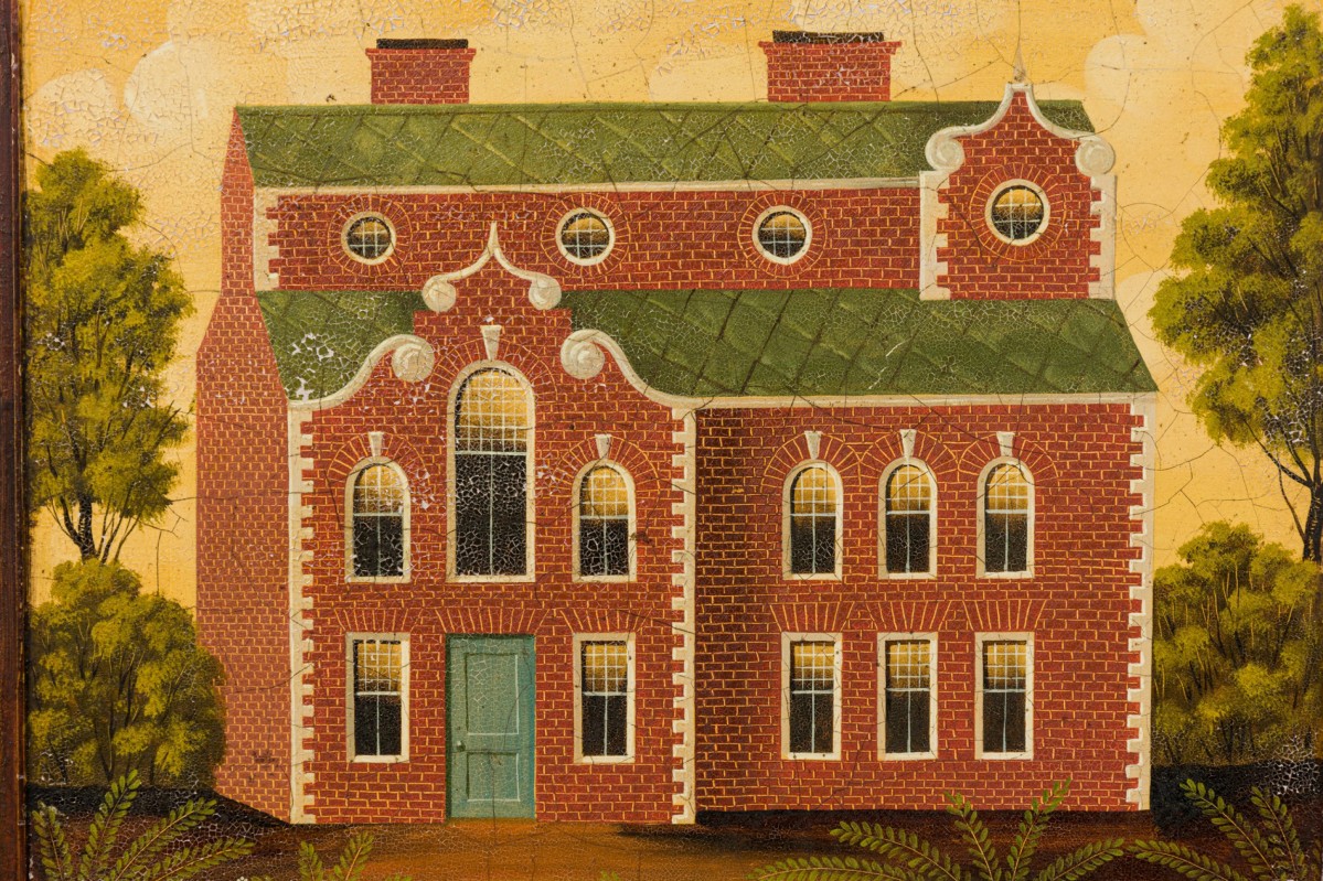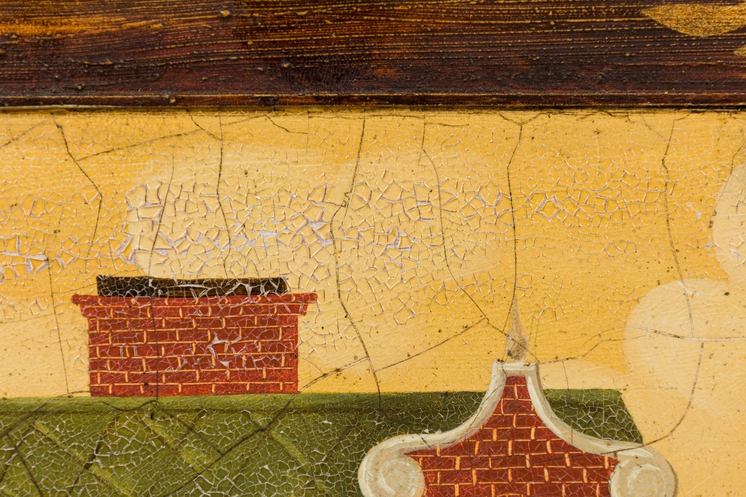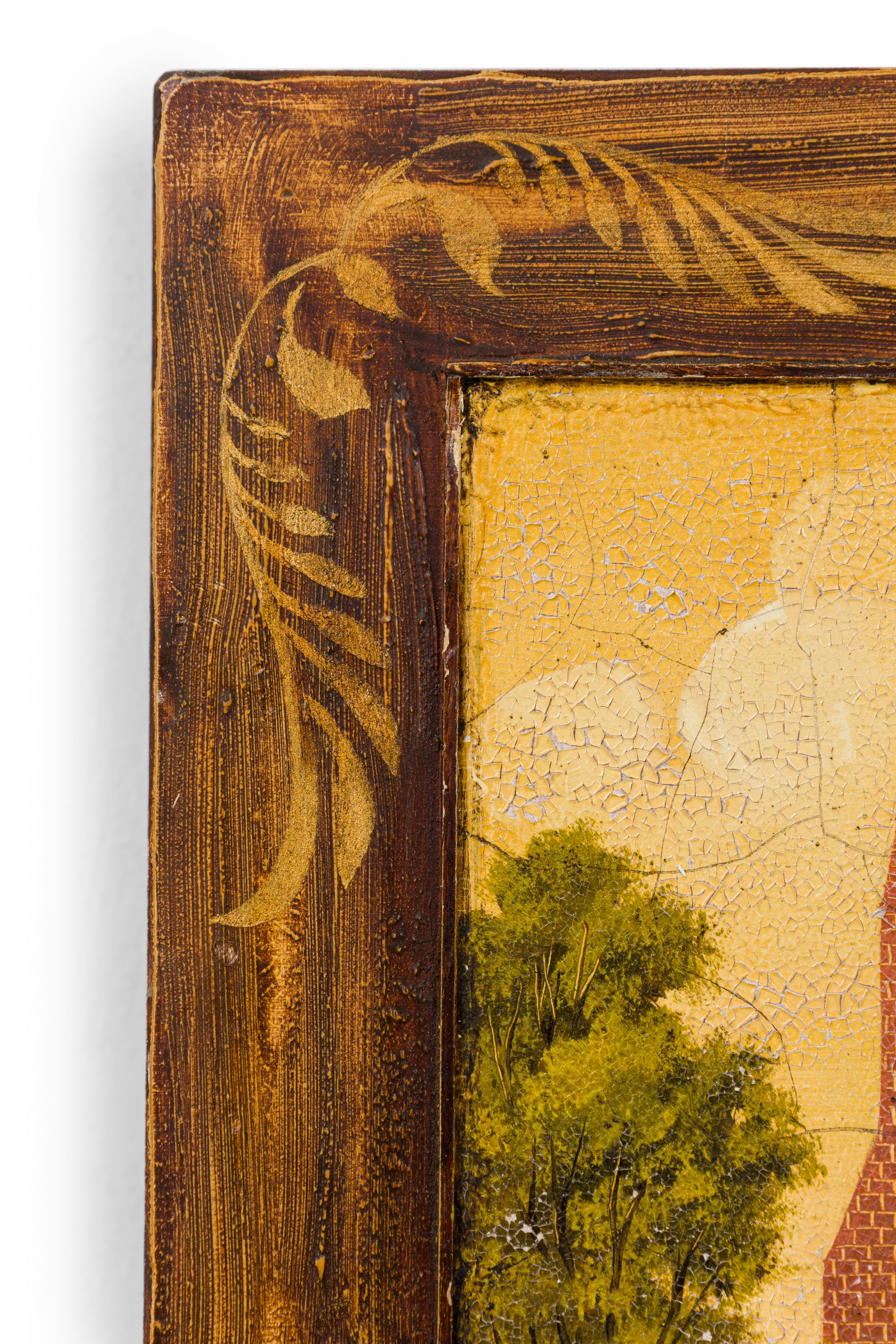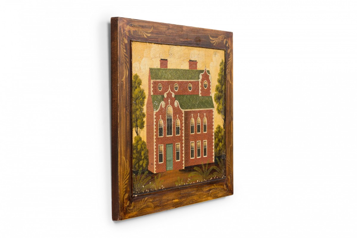 English Country style (20th Cent) acrylic on board painting, depicting a brick house, within faux wood and decorated frame. (7 Similar pieces: 057835A, 057835B, 057835C, 057835D, 057835F, 057835G, 057835H)