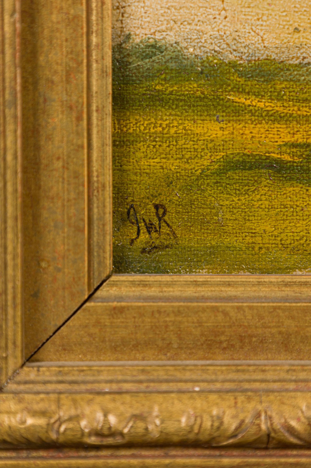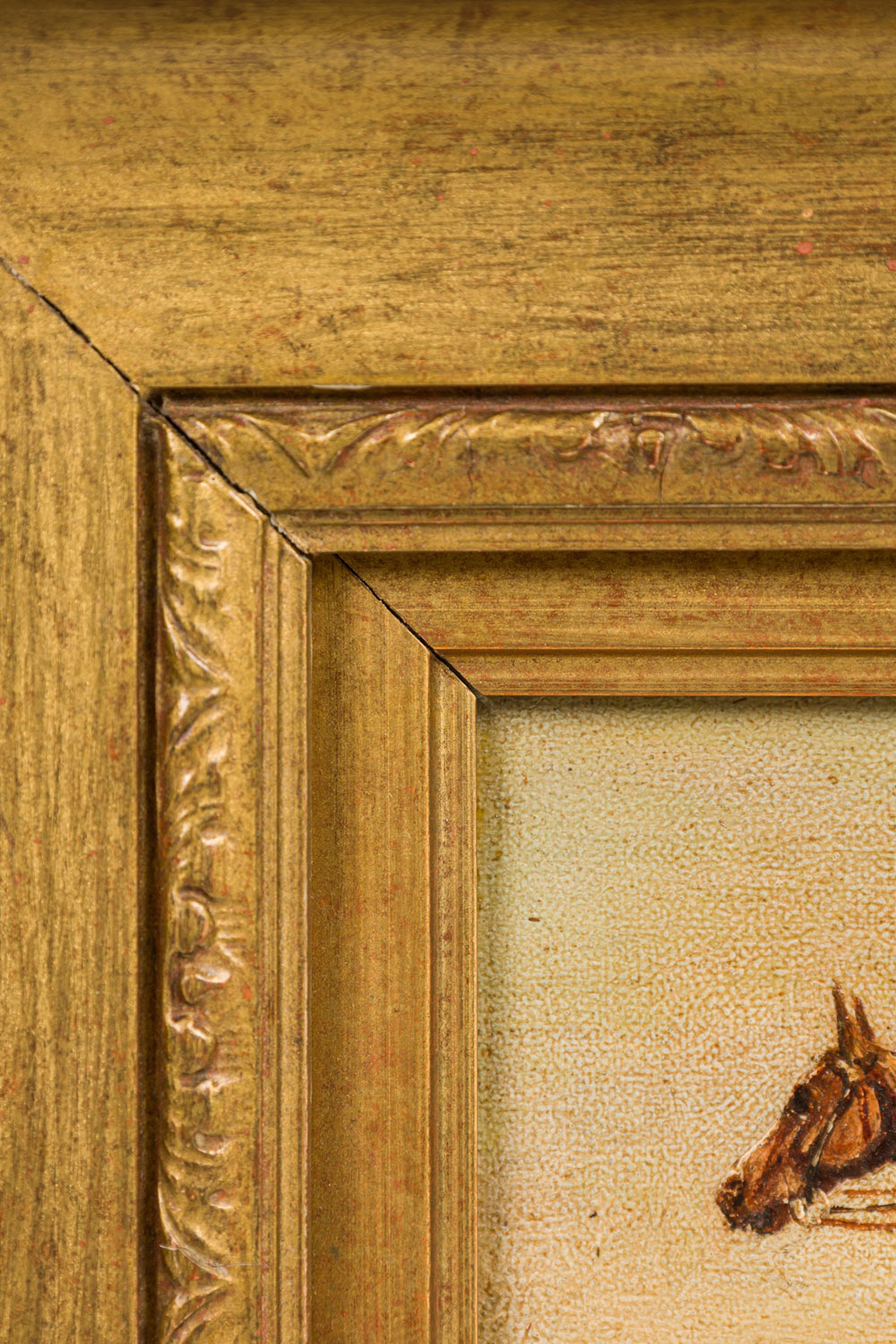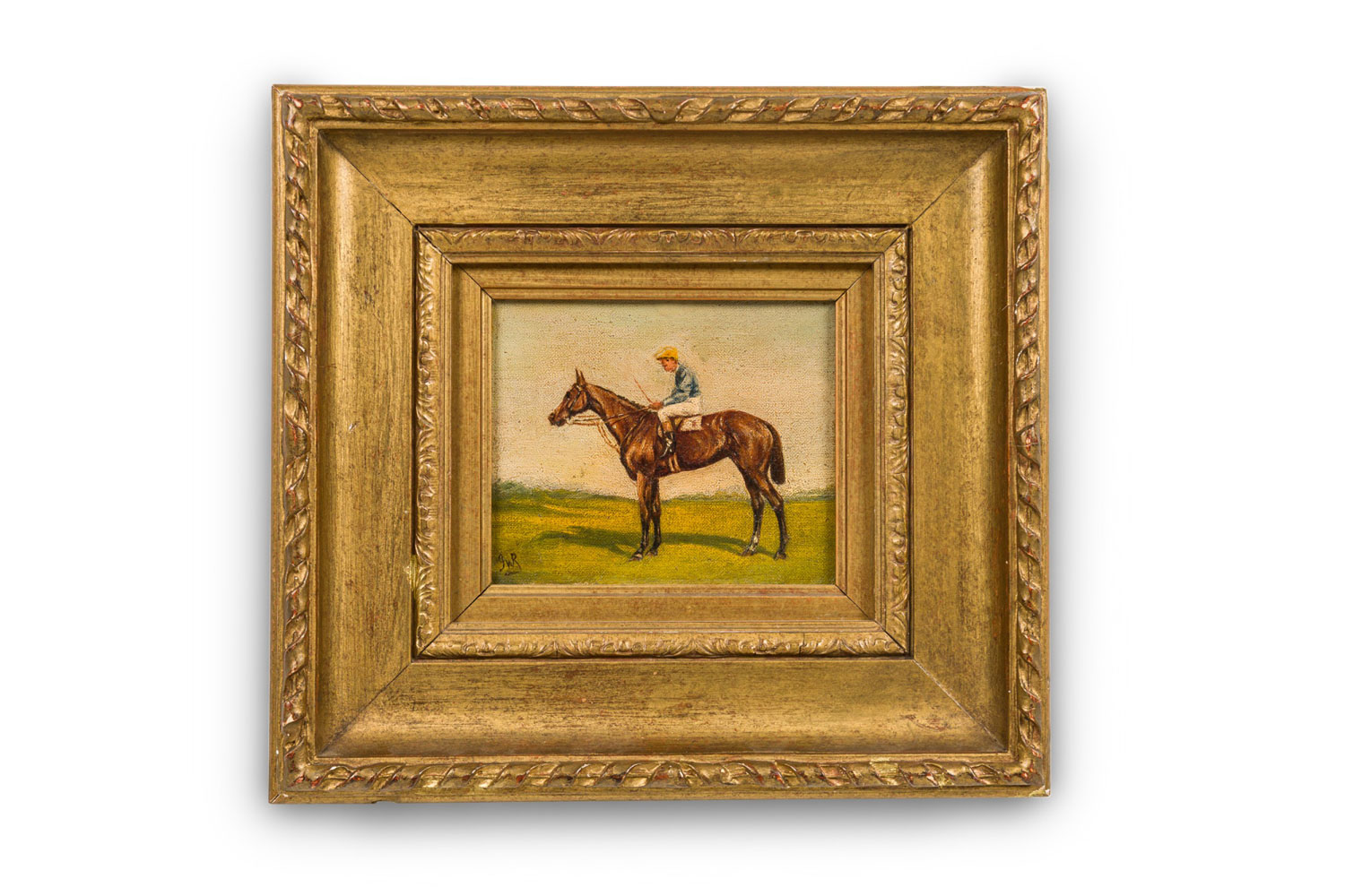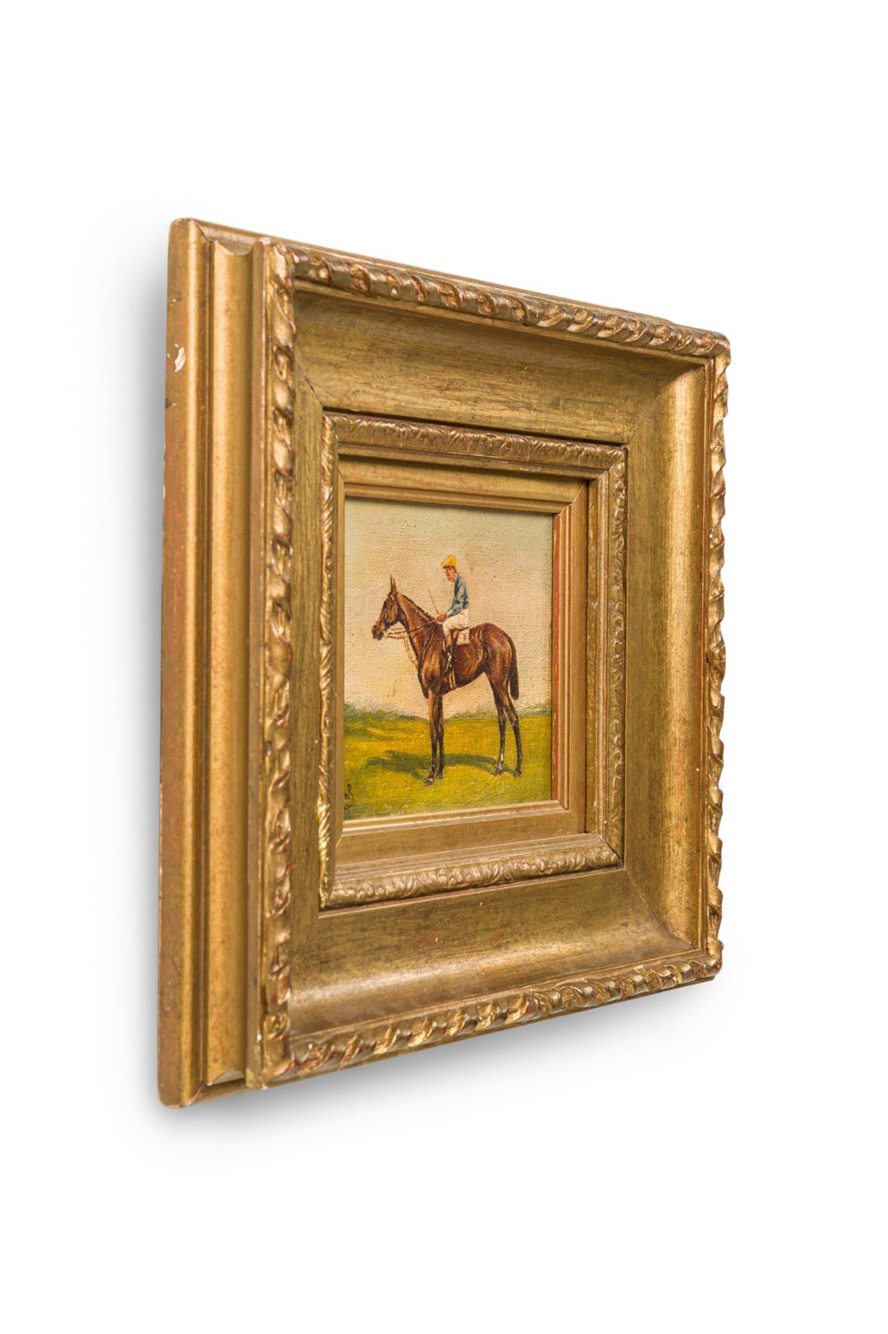 English Country style gilt framed oil painting of horse and jockey wearing blue shirt