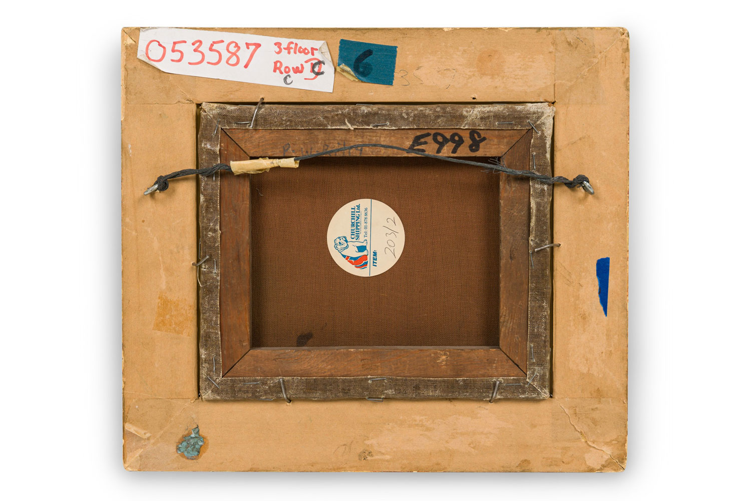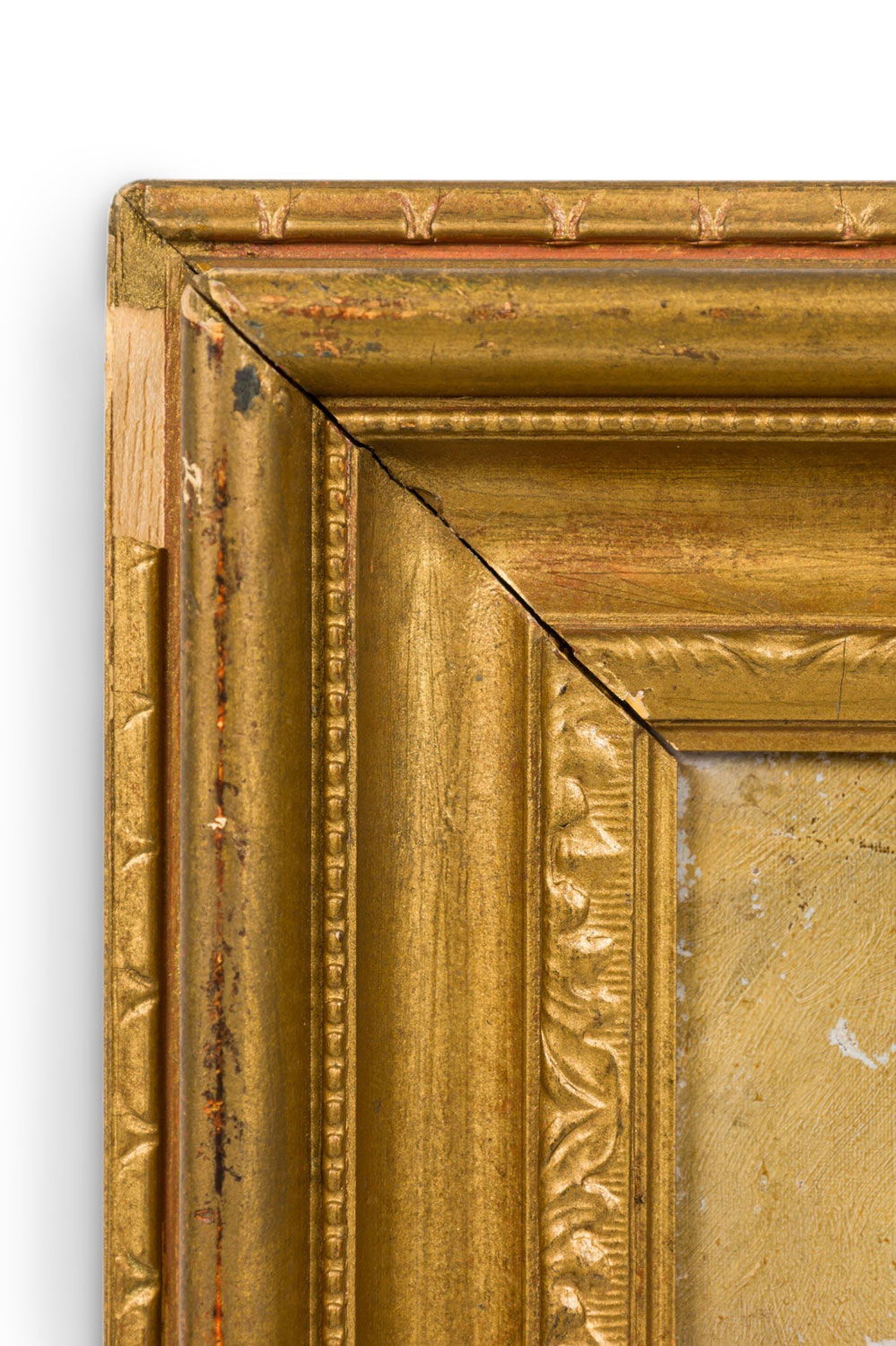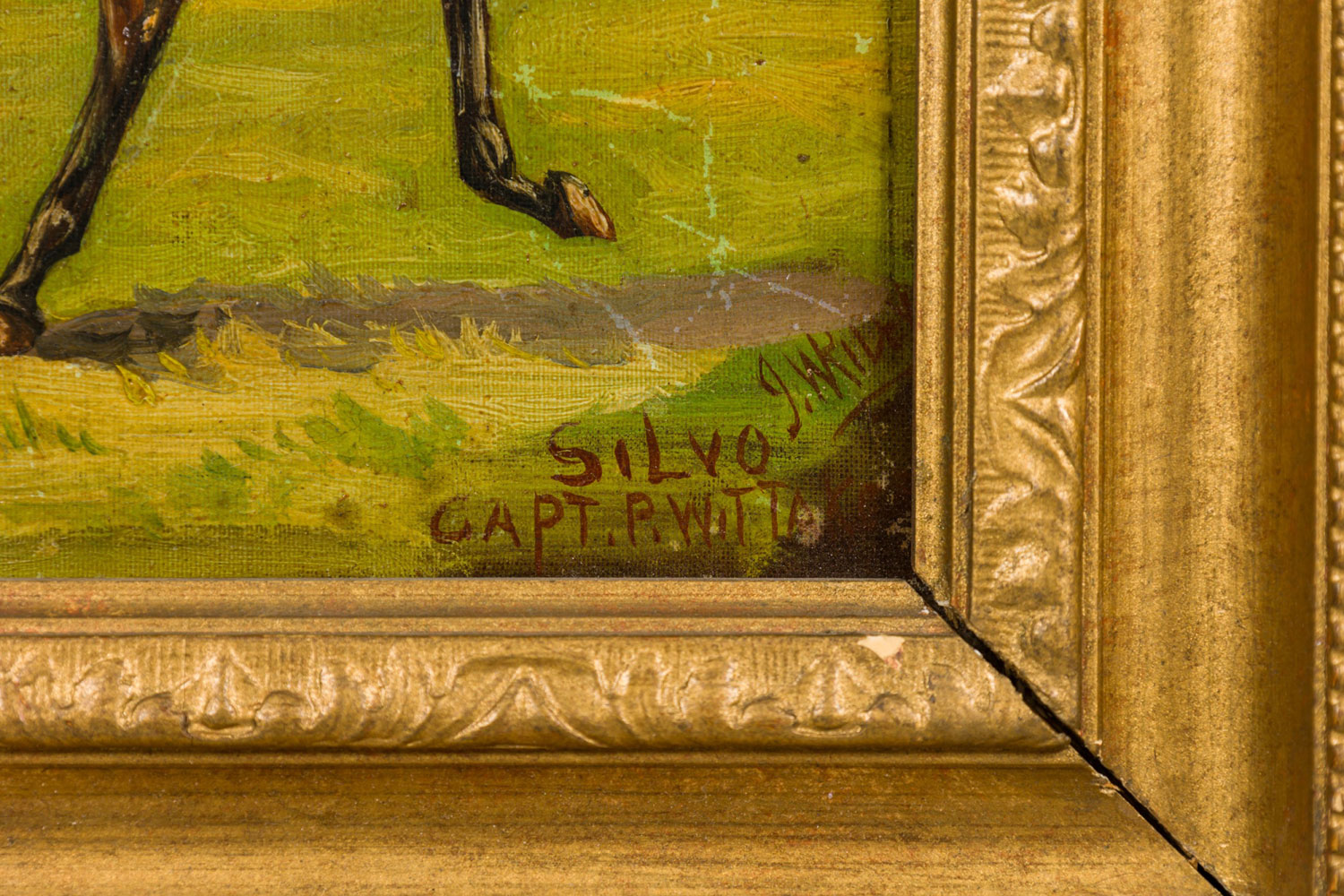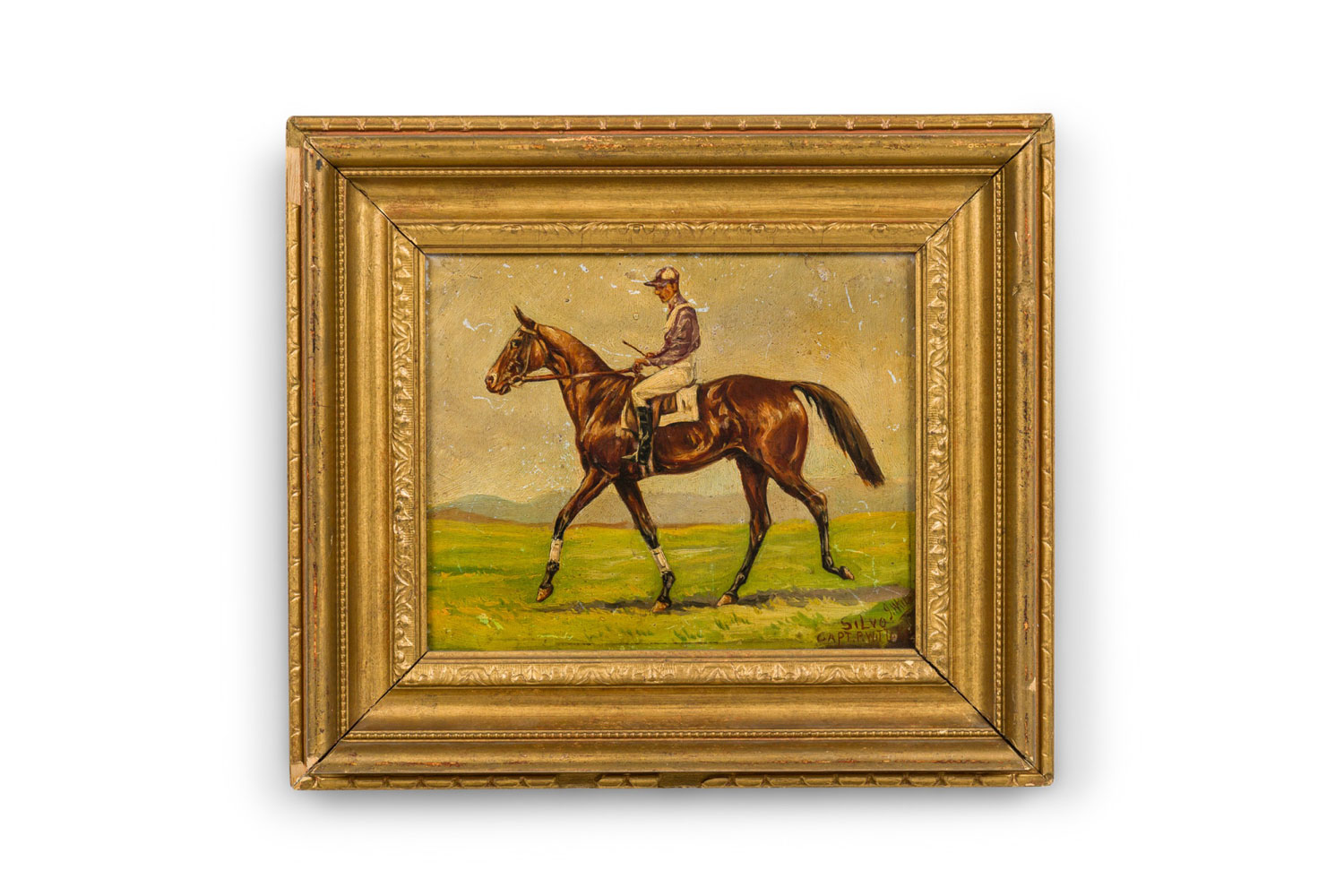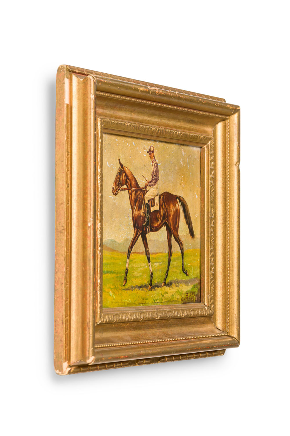 English Country style gilt framed oil painting of horse (Silvo) and jockey wearing purple shirt (signed)