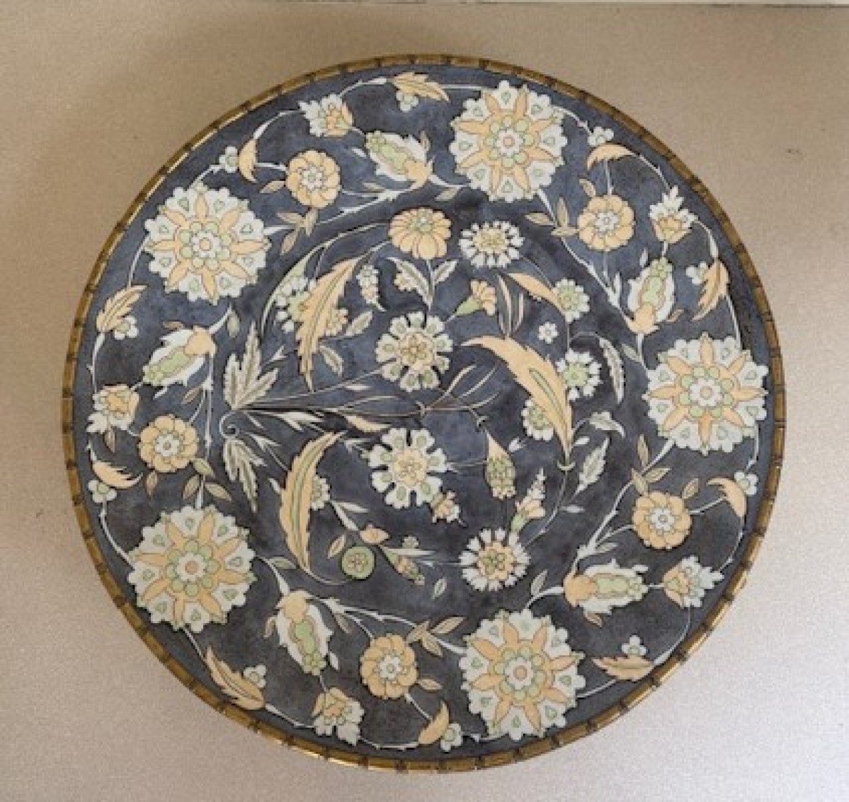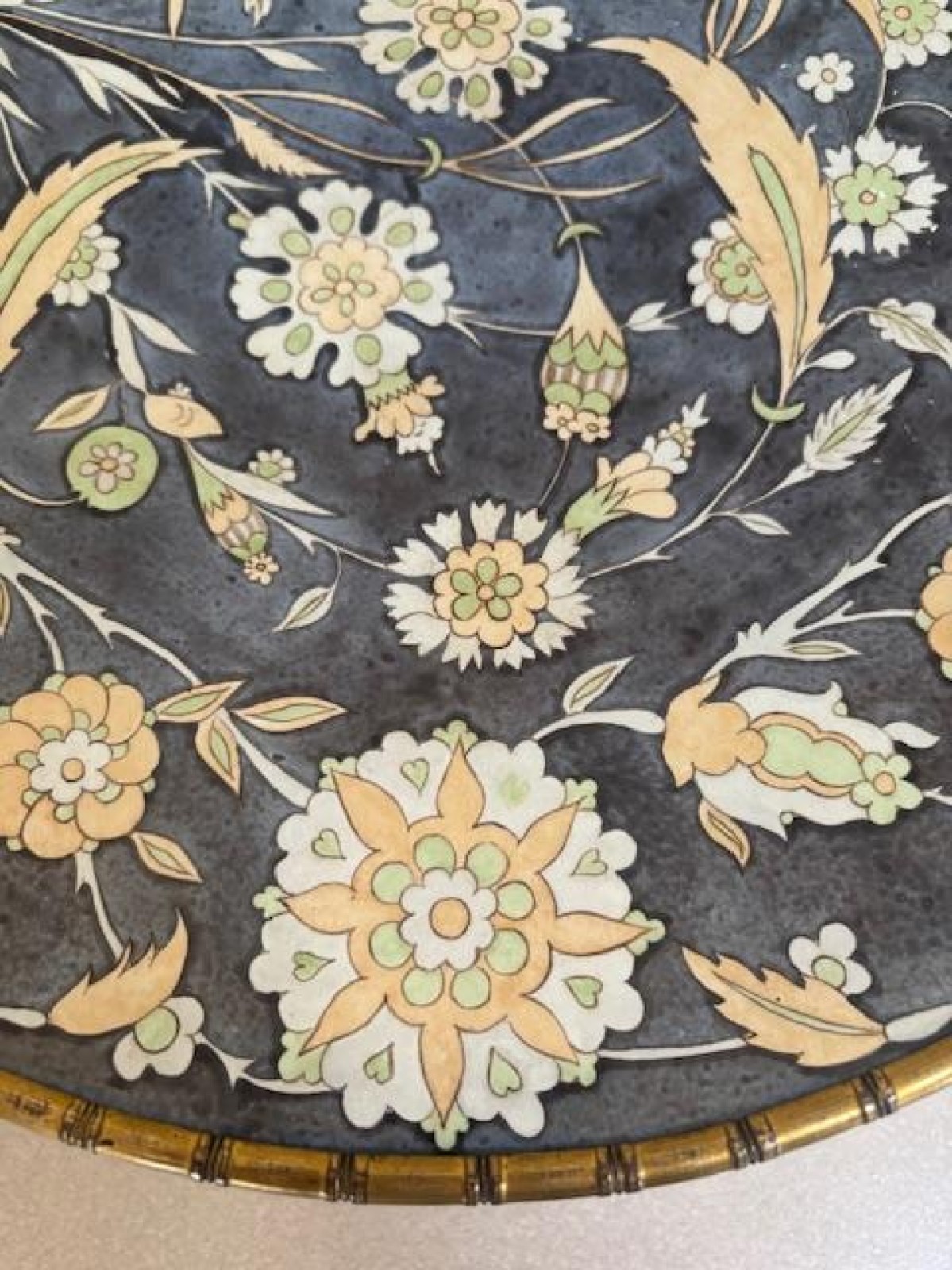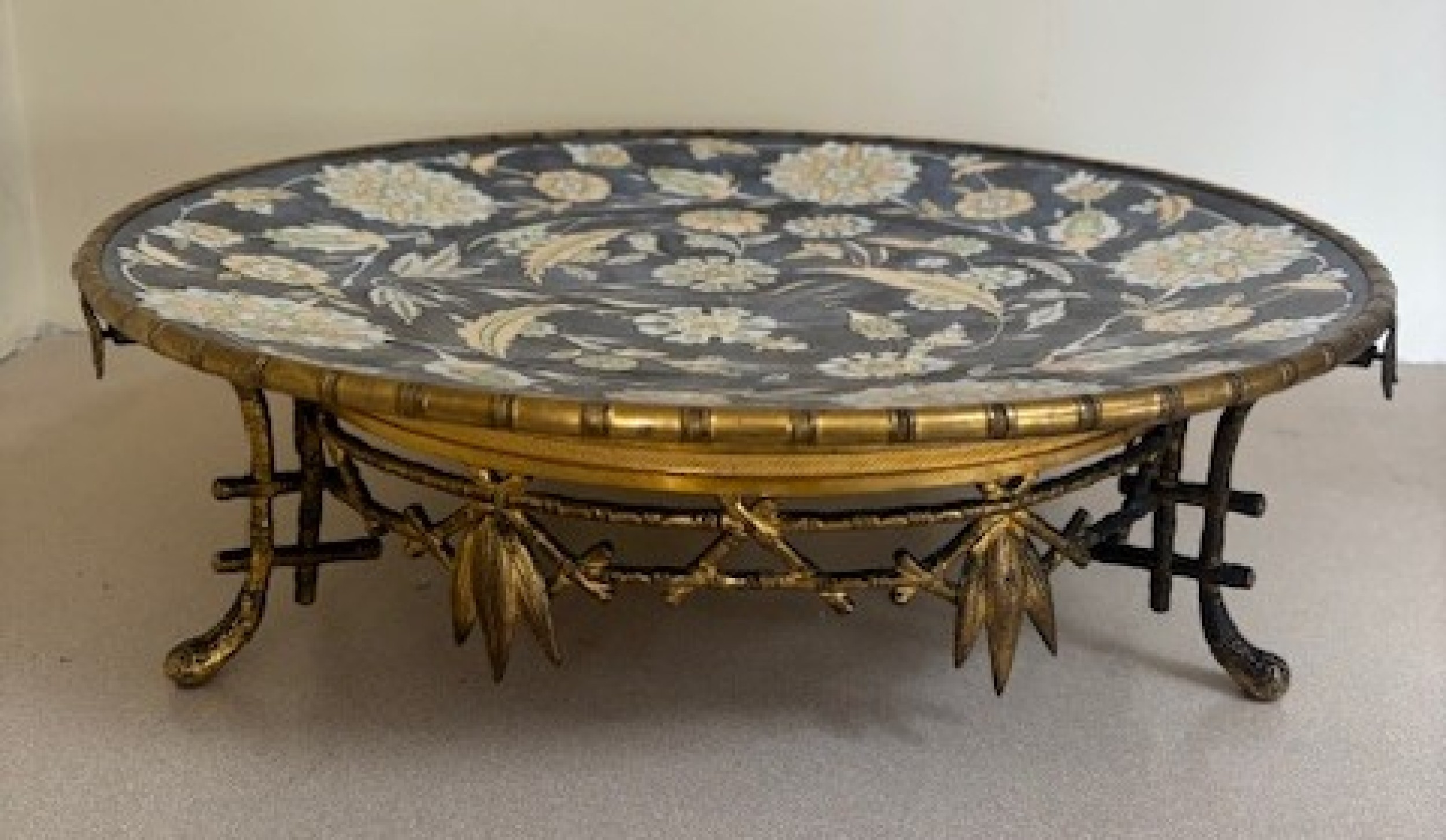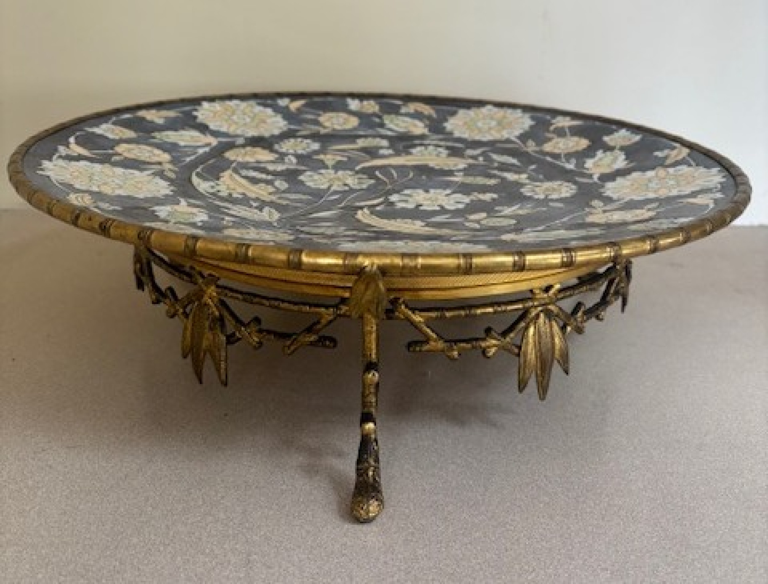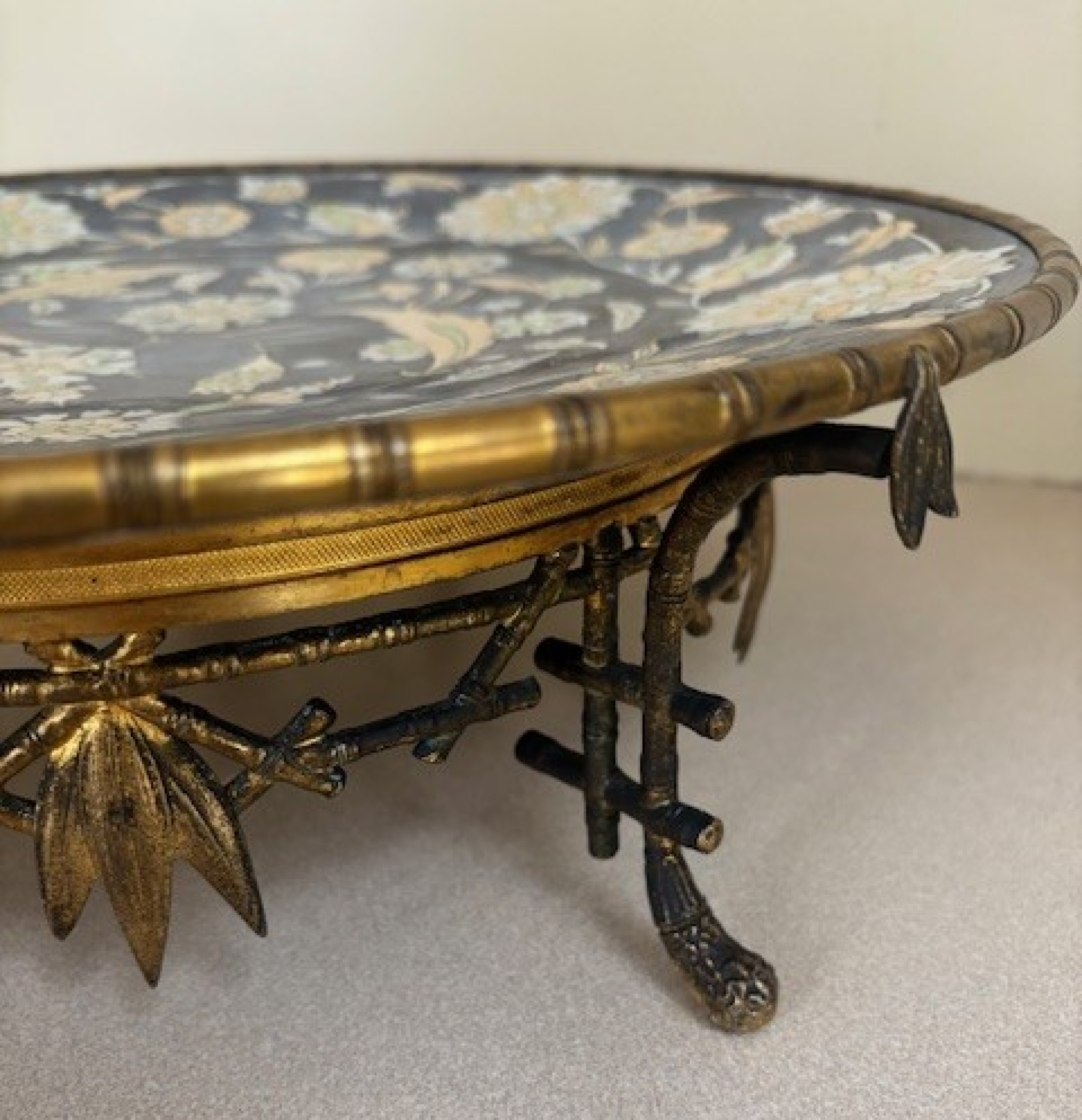 English Regency gilt bamboo base centerpiece holding a round porcelain floral platter