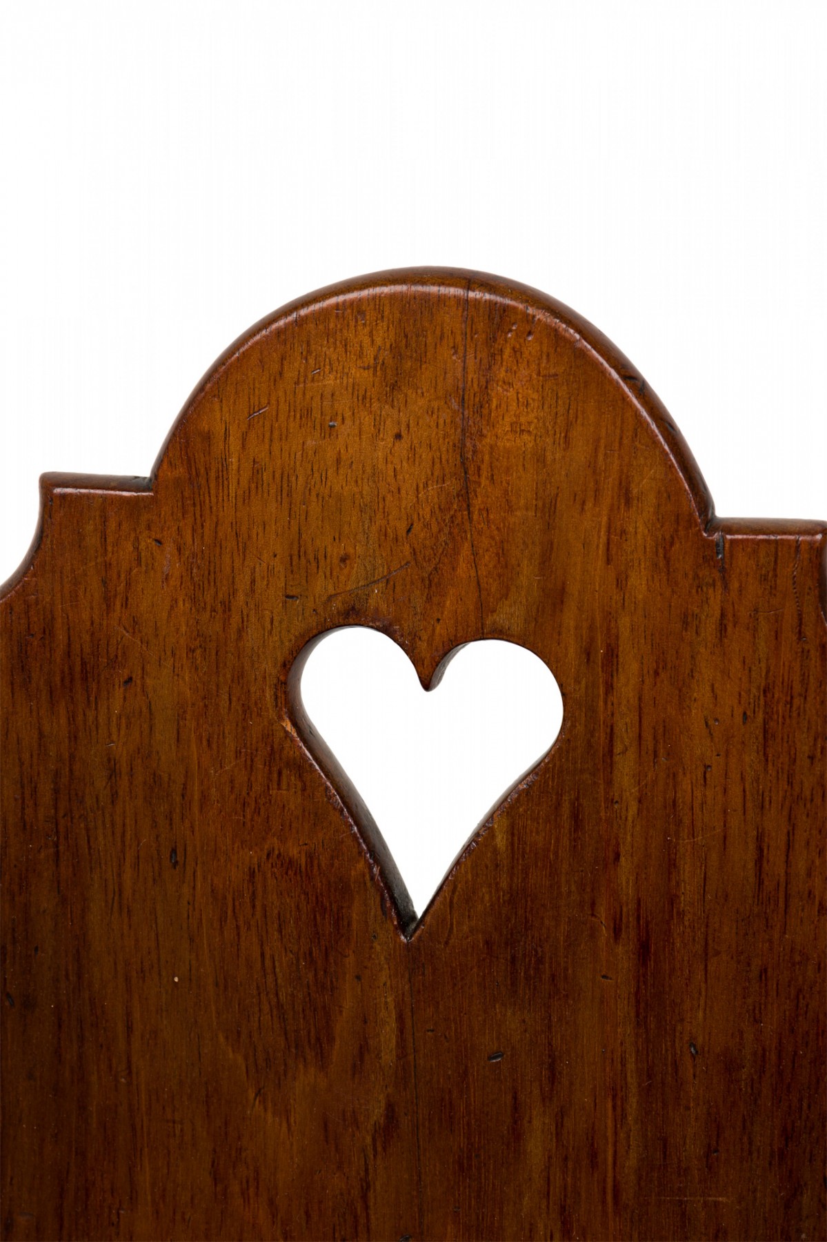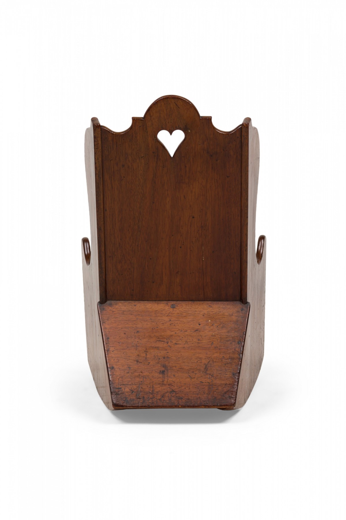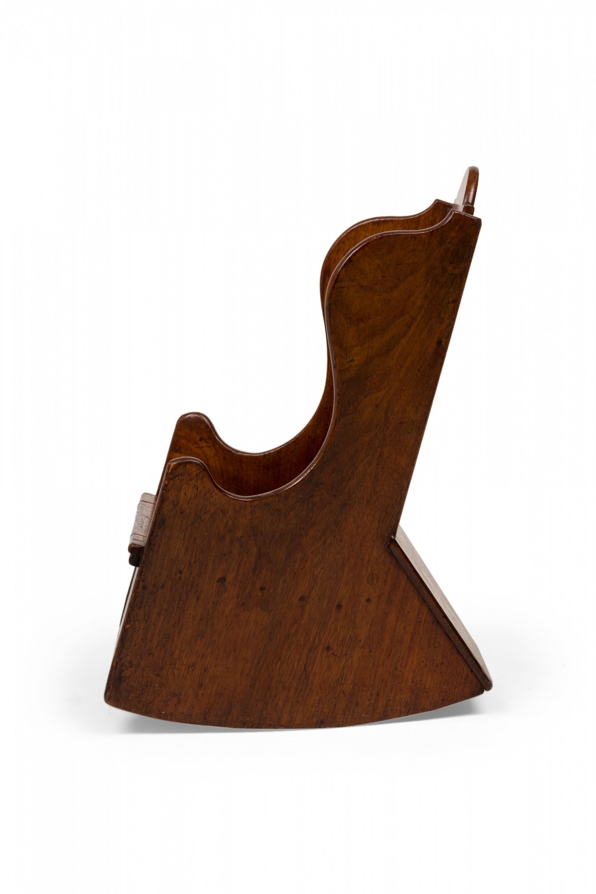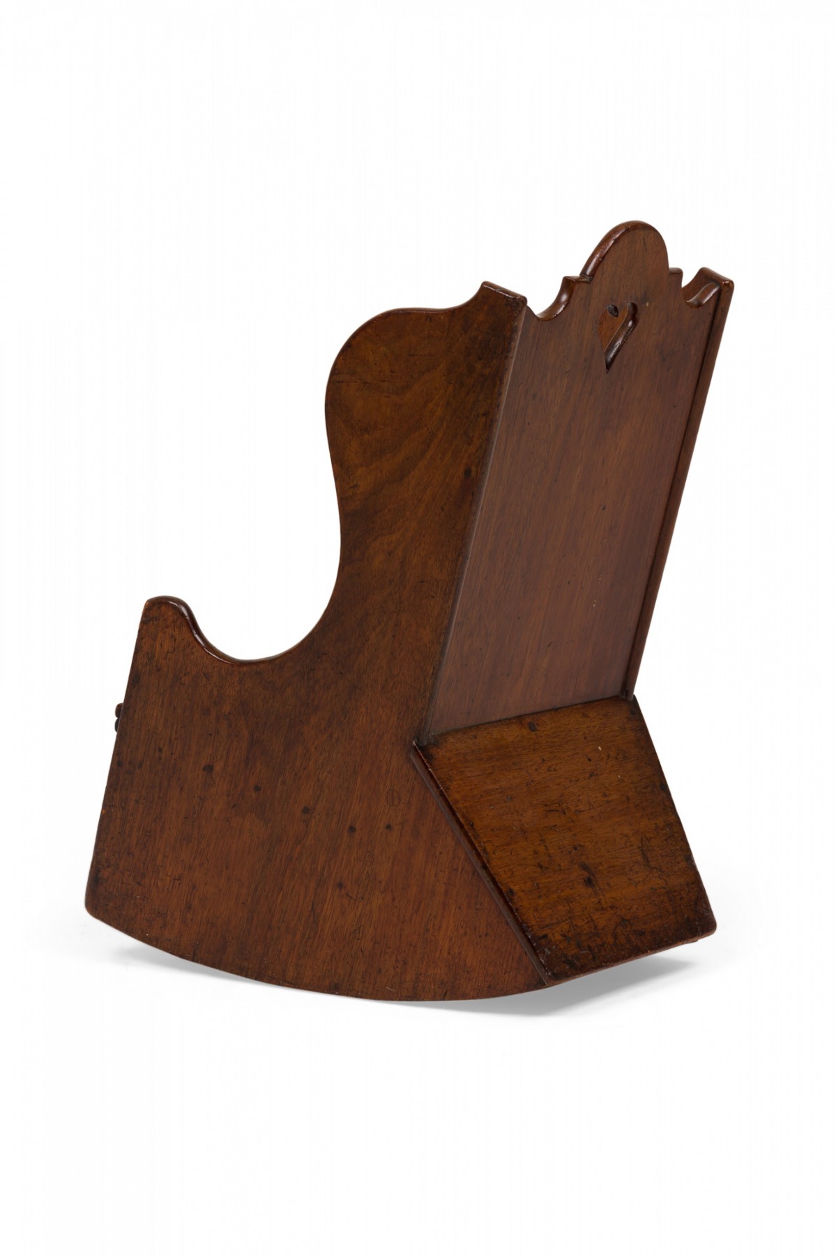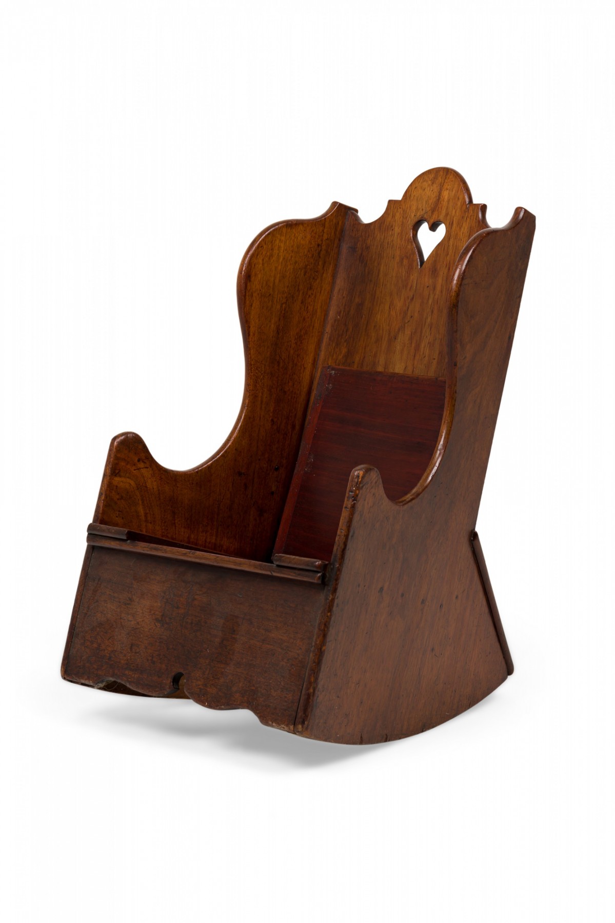 English George III wooden child's rocking chair with wing arms and shaped top rail above a cut-out heart shaped handle slot, the seat composed of 3 segments, the center of which opens as a hinged lid to reveal a circular opening.