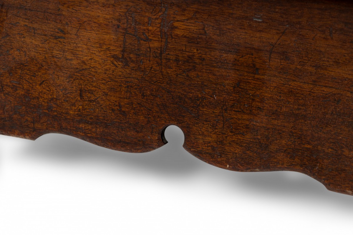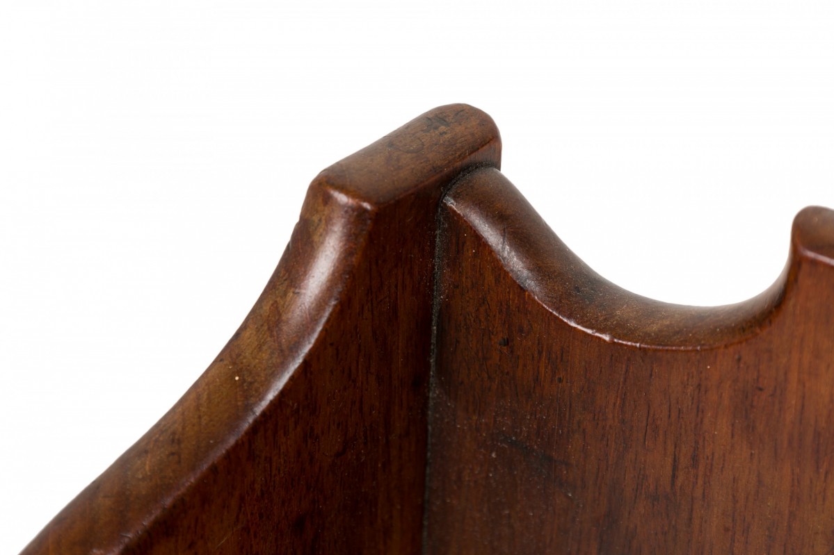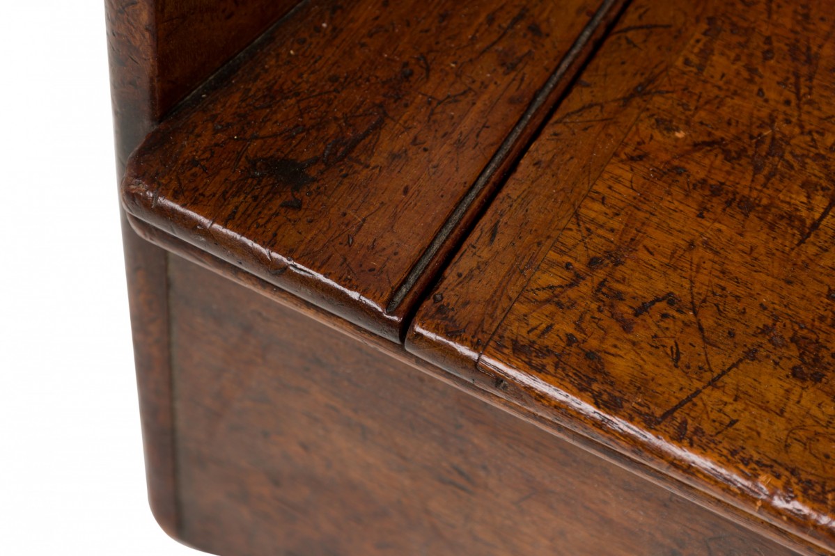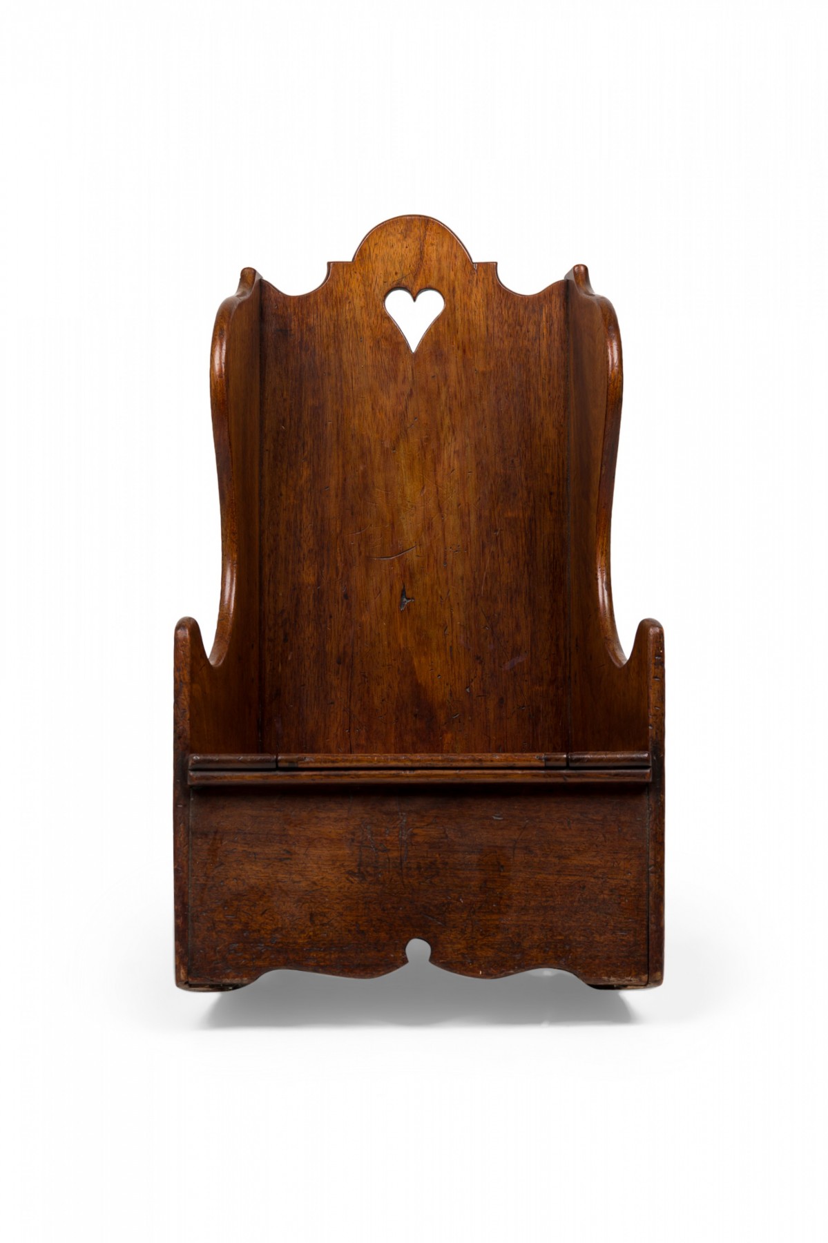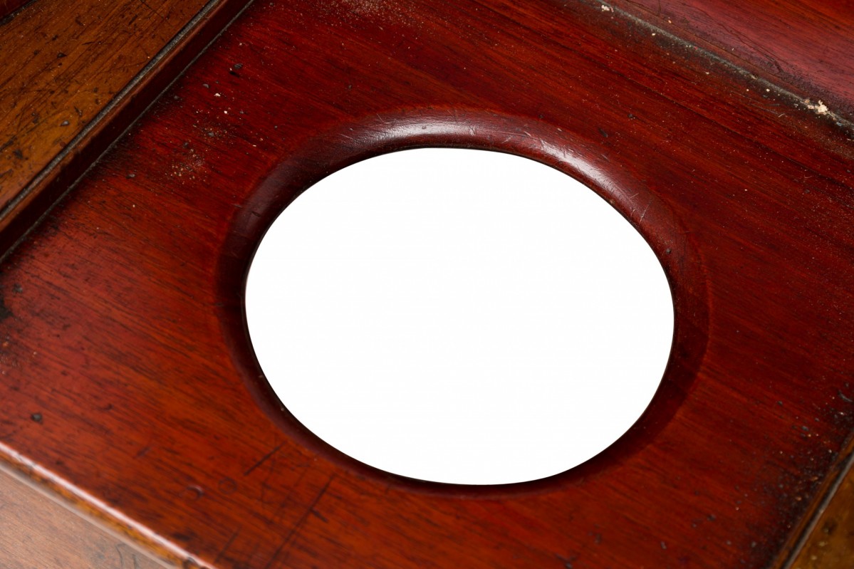 English George III wooden child's rocking chair with wing arms and shaped top rail above a cut-out heart shaped handle slot, the seat composed of 3 segments, the center of which opens as a hinged lid to reveal a circular opening.