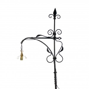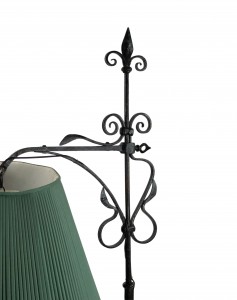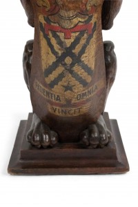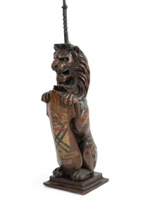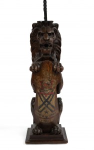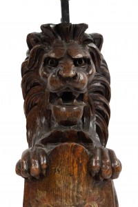 2 English Georgian style (19/20th Century) oak carved lamps of heraldic lion figures with wrought iron single arm and green pleated silk shade (PRICED EACH)