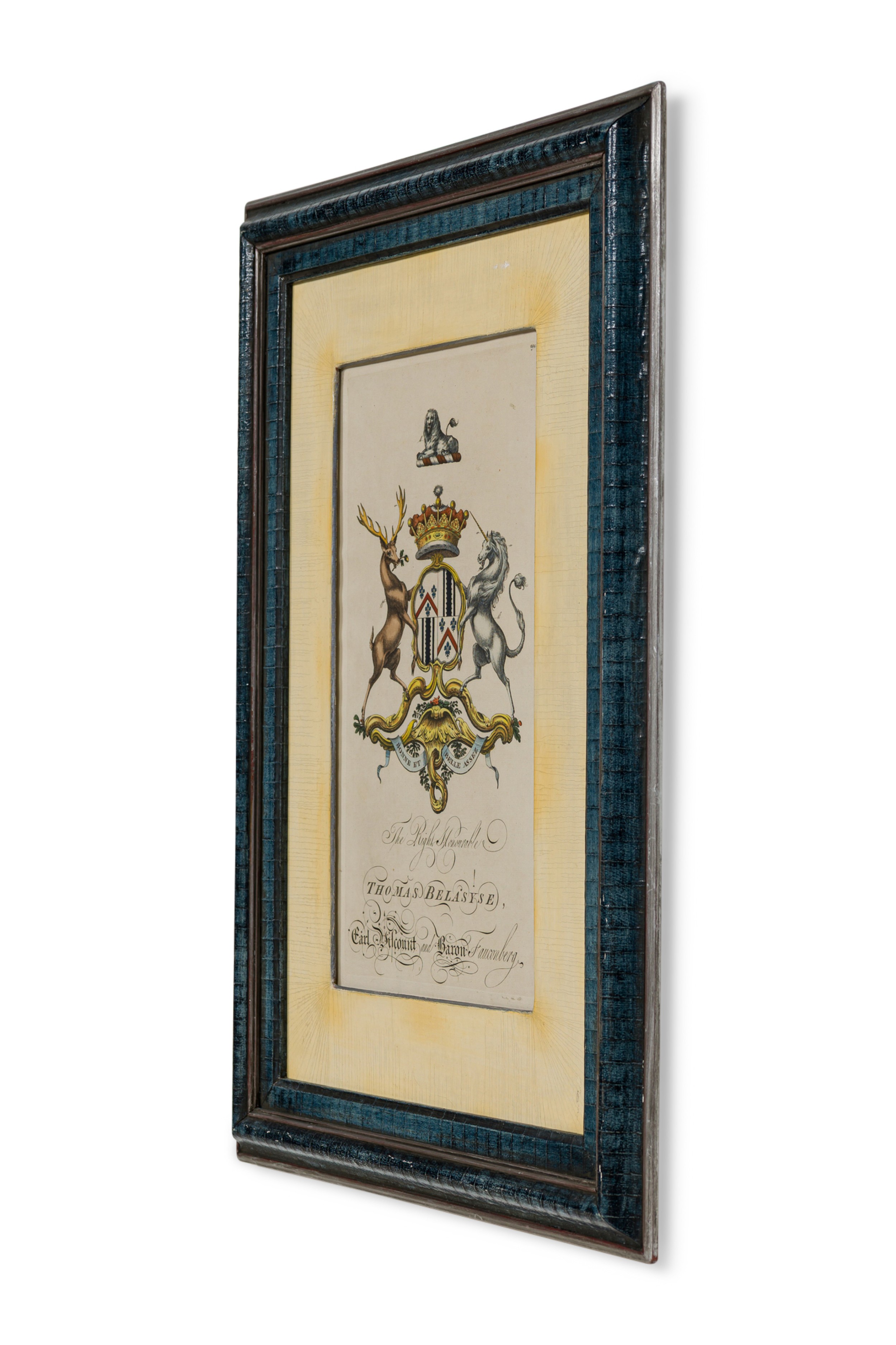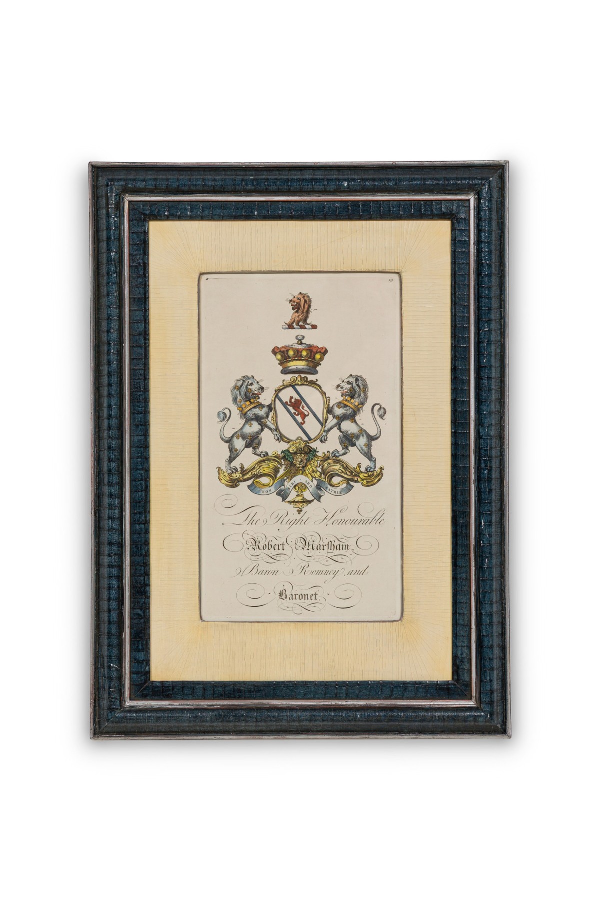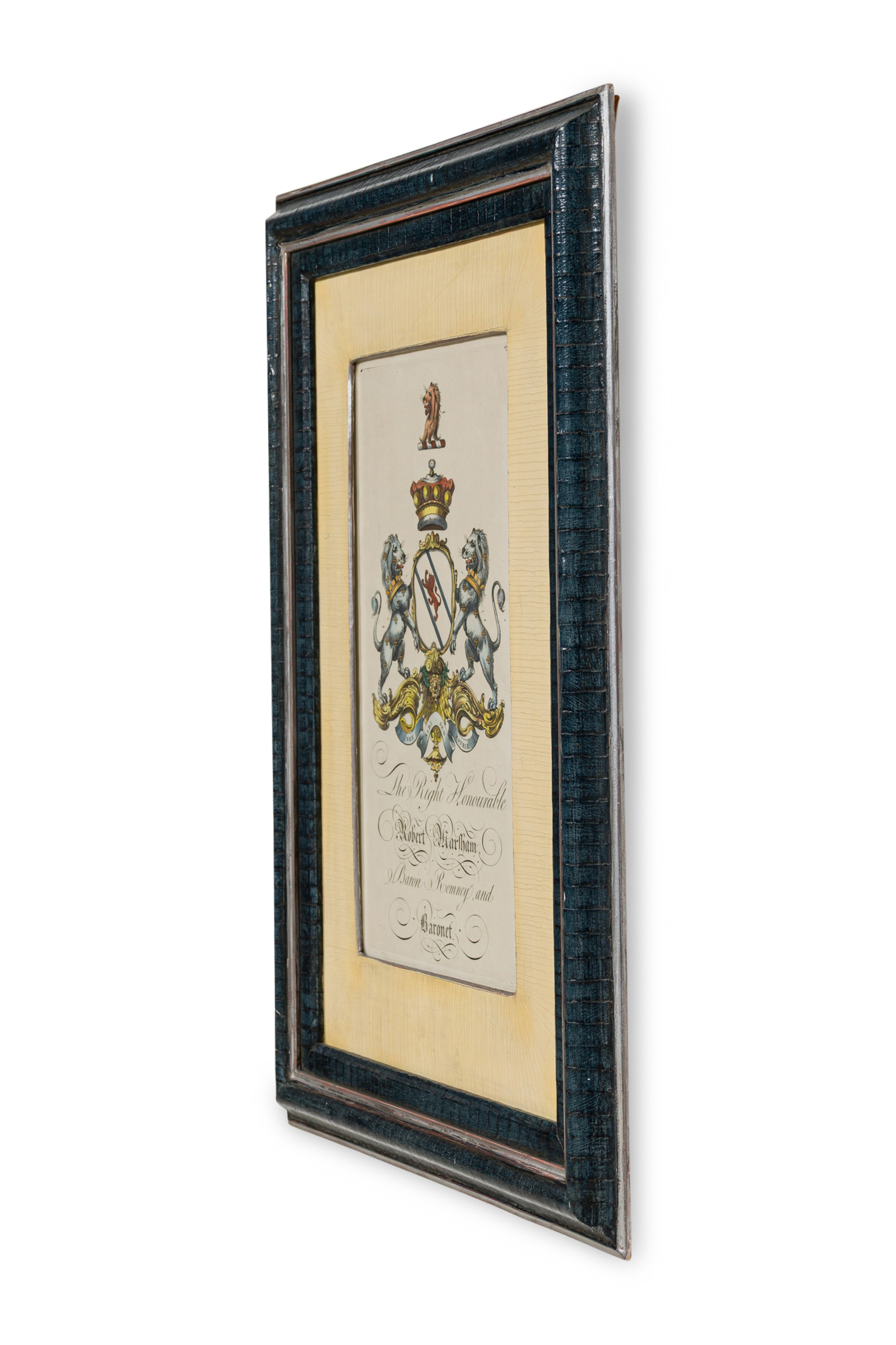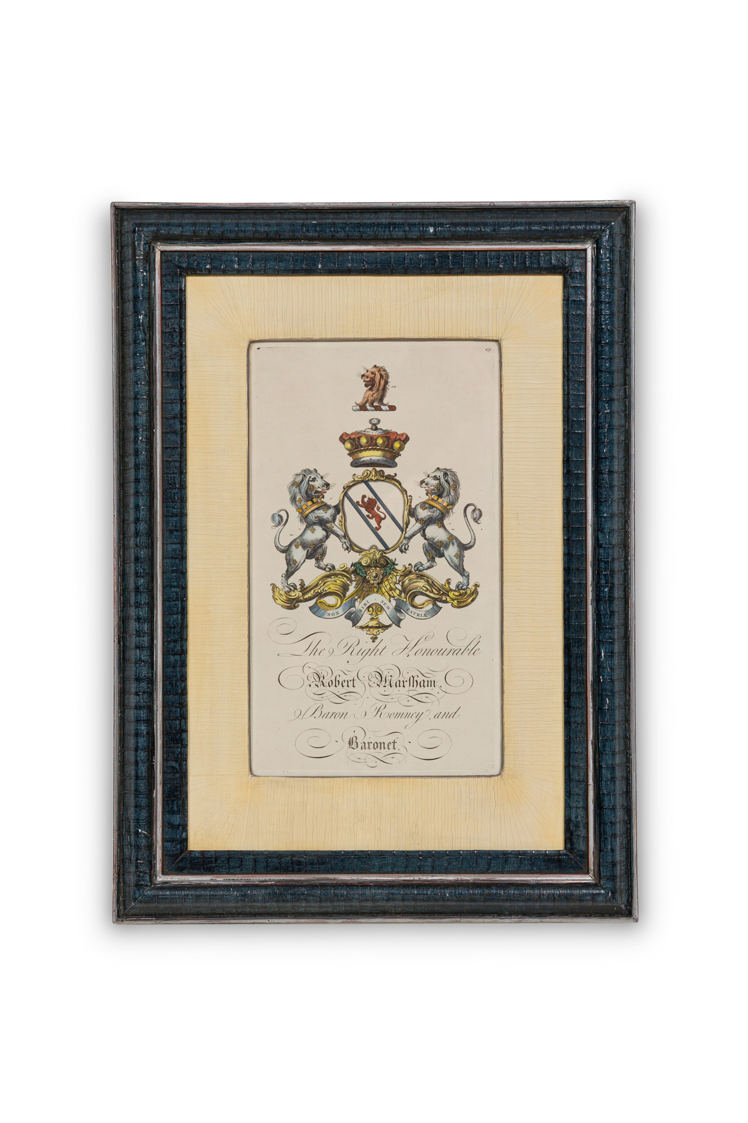9 English Georgian (18th Cent) hand-colored copper plate engravings of coat of arms in blue with gold trimmed frames (by Joseph Edmondson, 1770) (PRICED EACH)