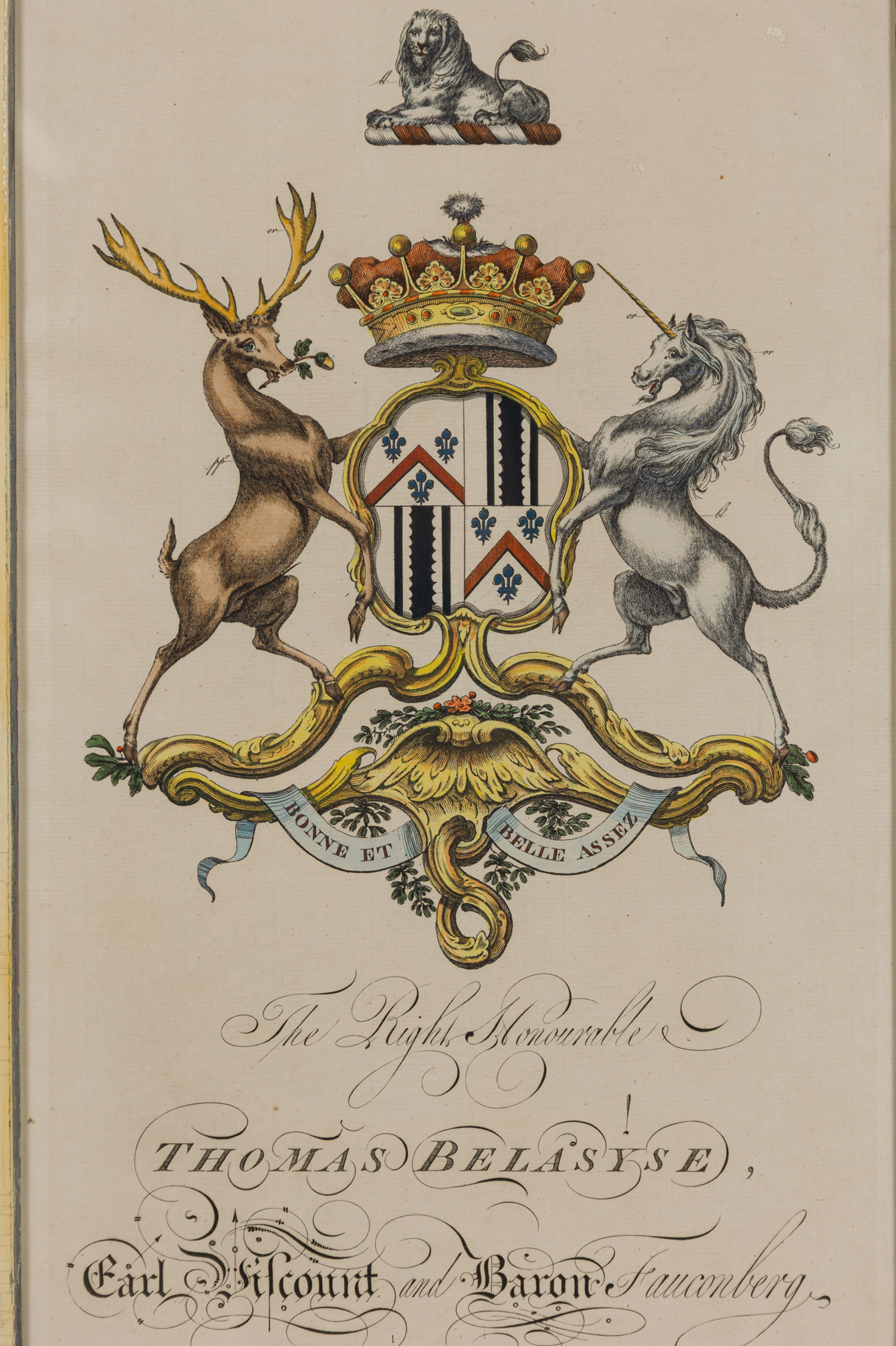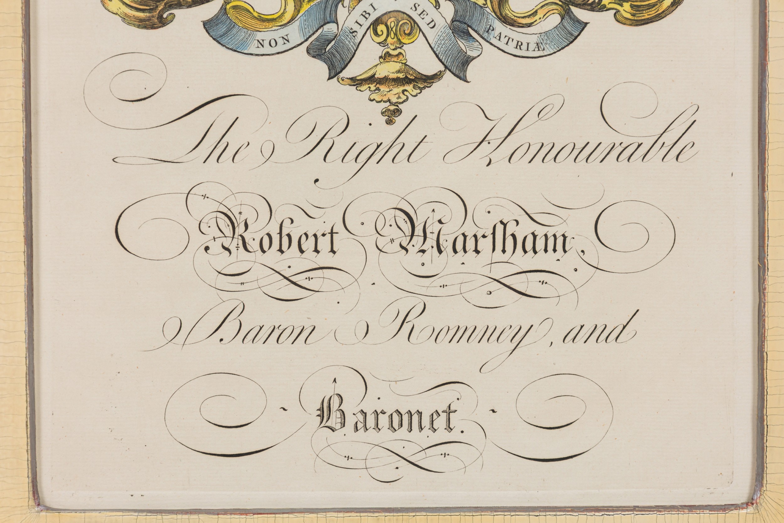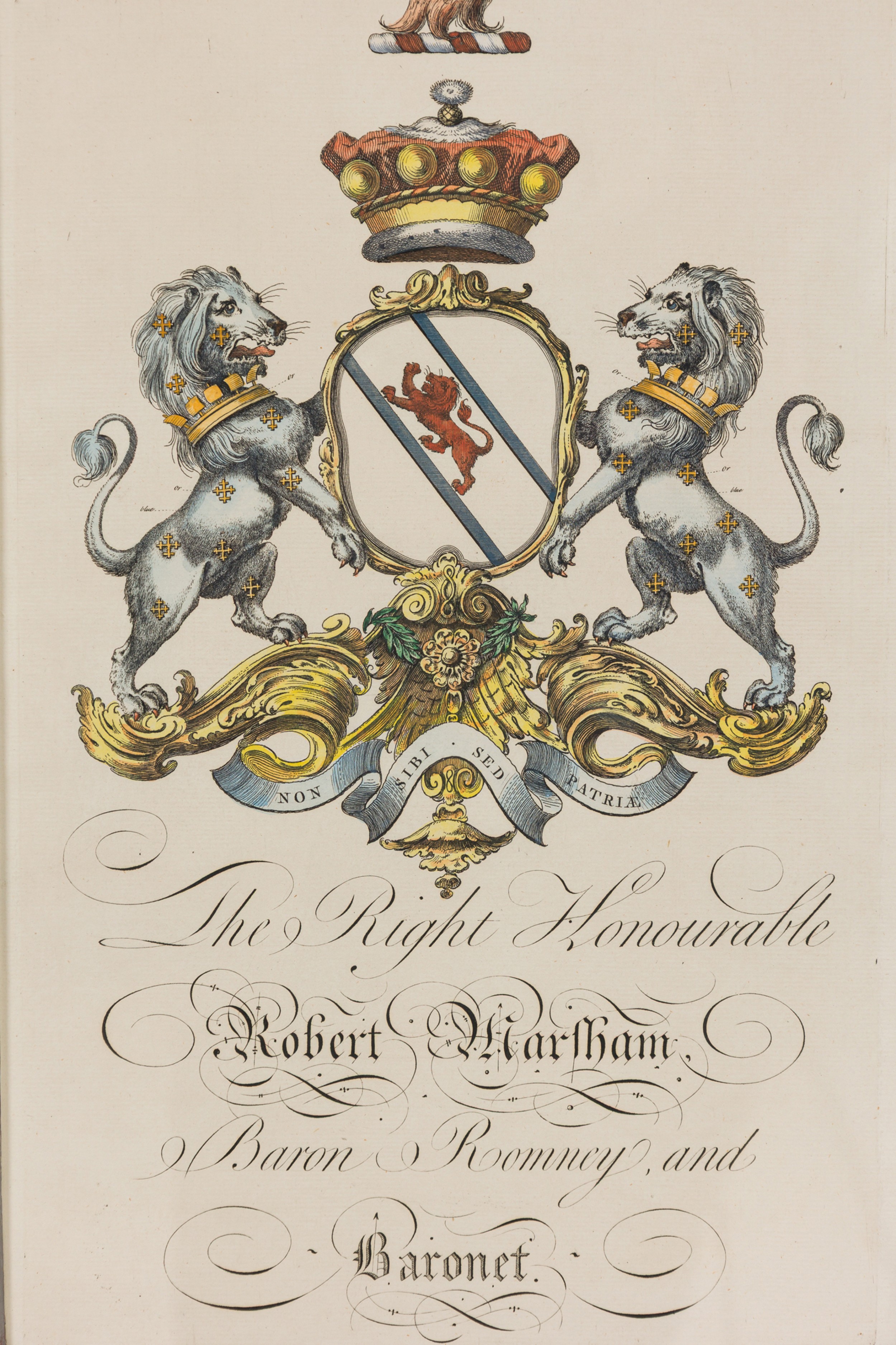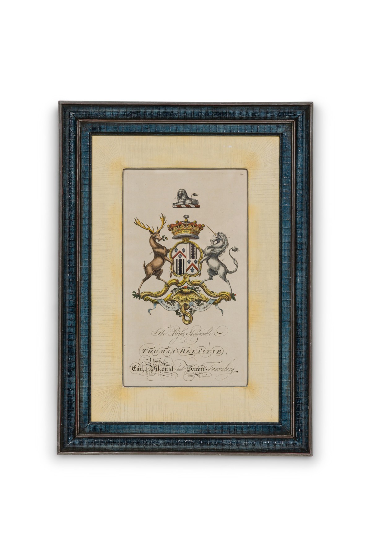 9 English Georgian (18th Cent) hand-colored copper plate engravings of coat of arms in blue with gold trimmed frames (by Joseph Edmondson, 1770) (PRICED EACH)