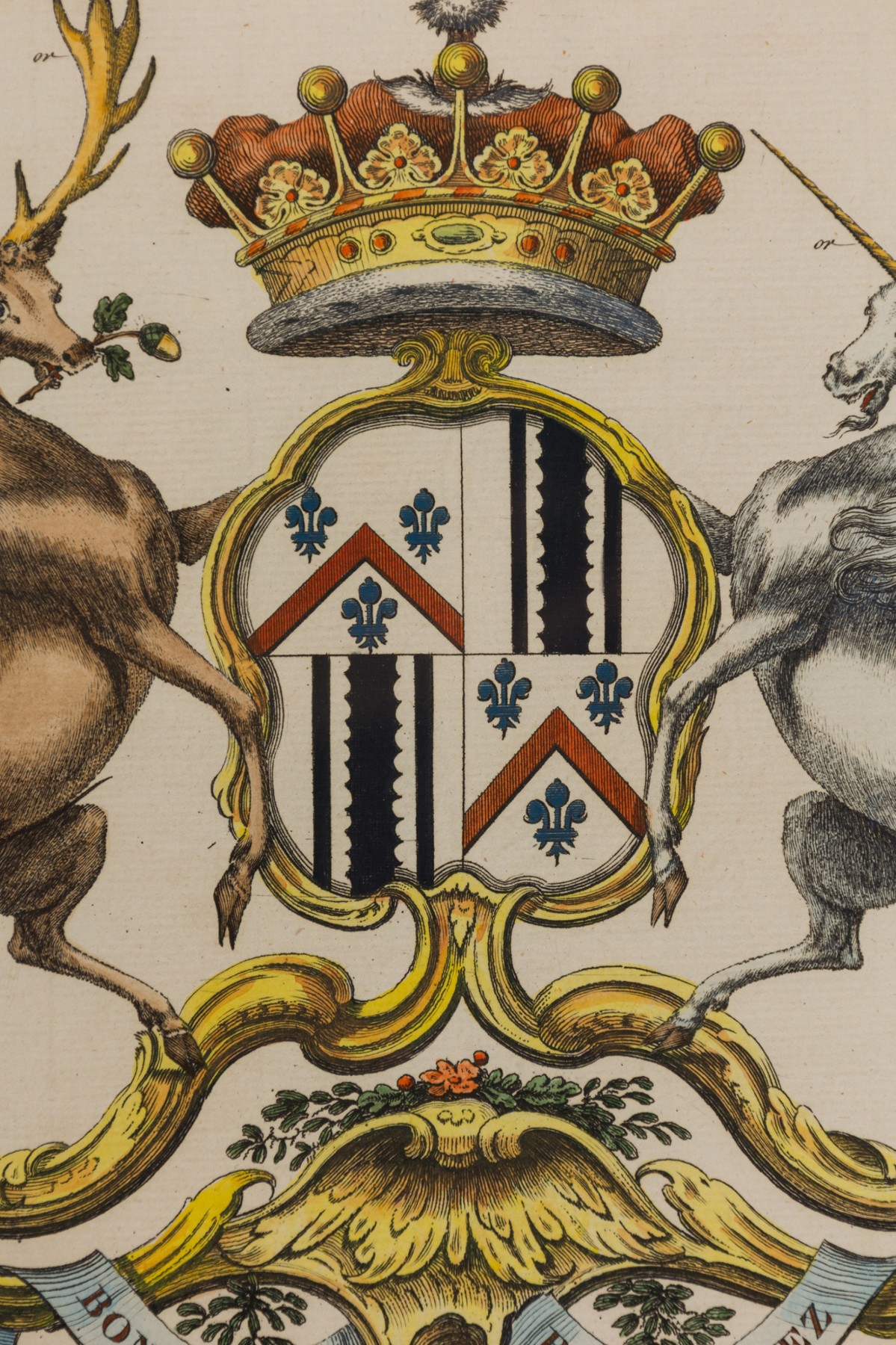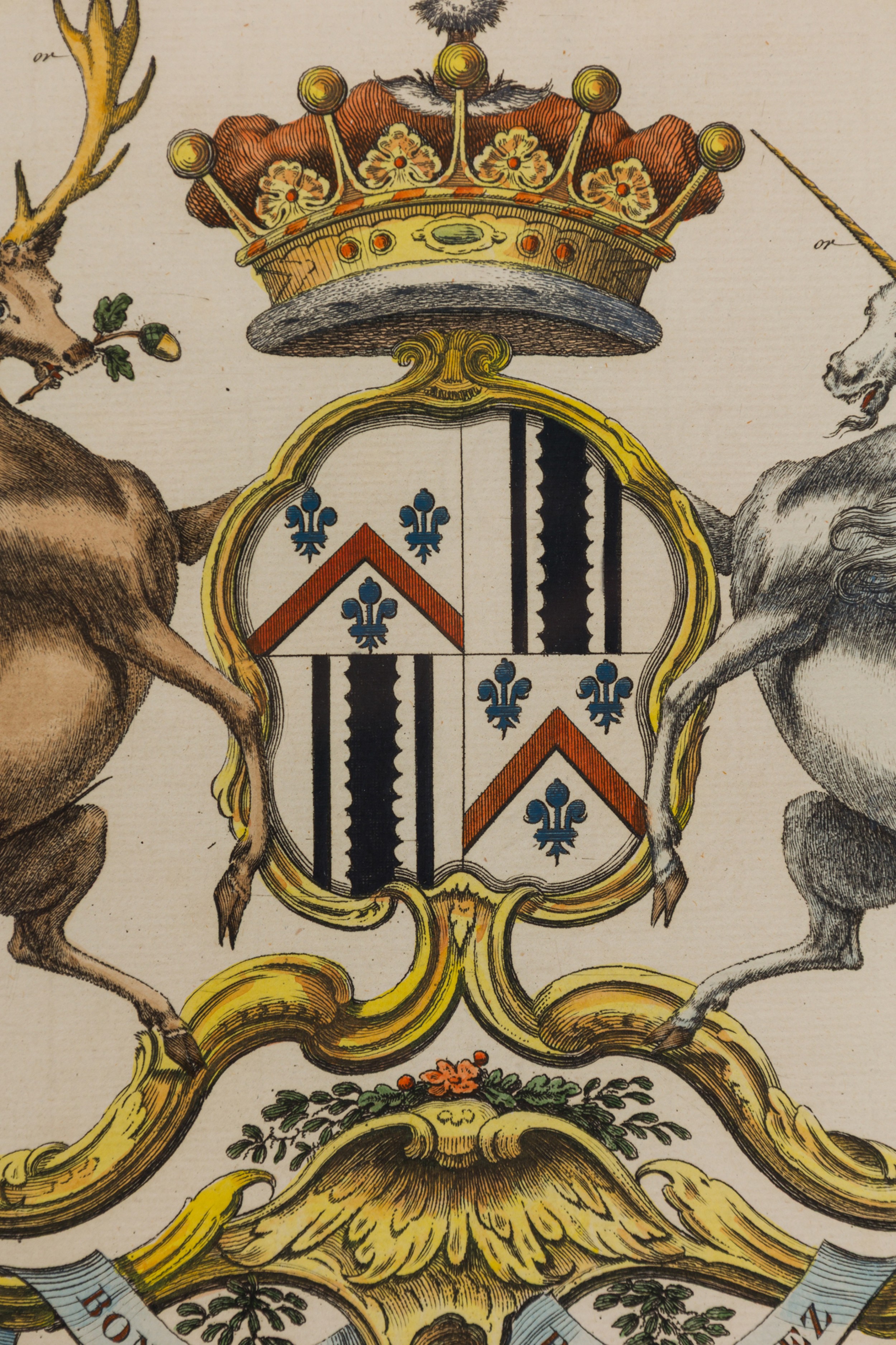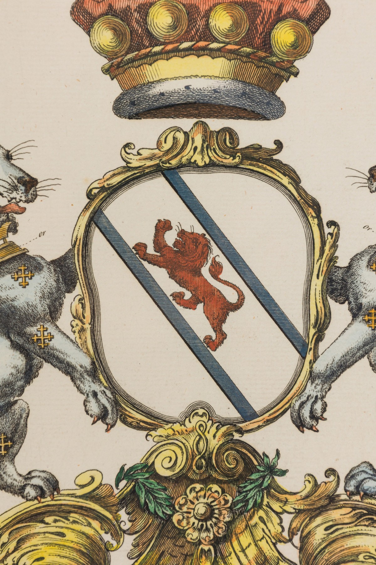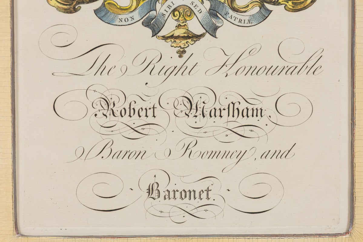 9 English Georgian (18th Cent) hand-colored copper plate engravings of coat of arms in blue with gold trimmed frames (by Joseph Edmondson, 1770) (PRICED EACH)
