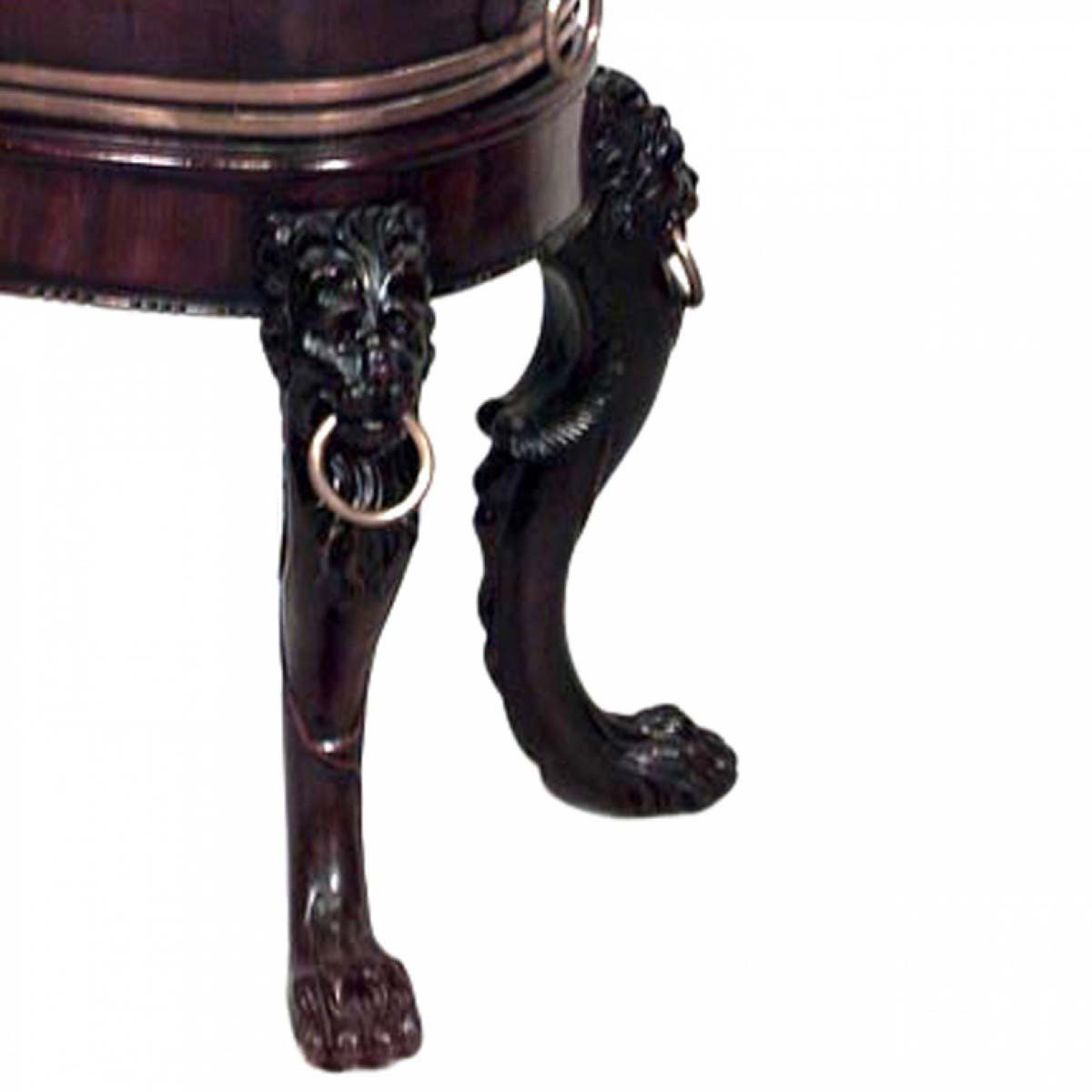 English Georgian style (19th Cent) mahogany oval fernery/planter with lion carving on legs and brass trim with copper liner.