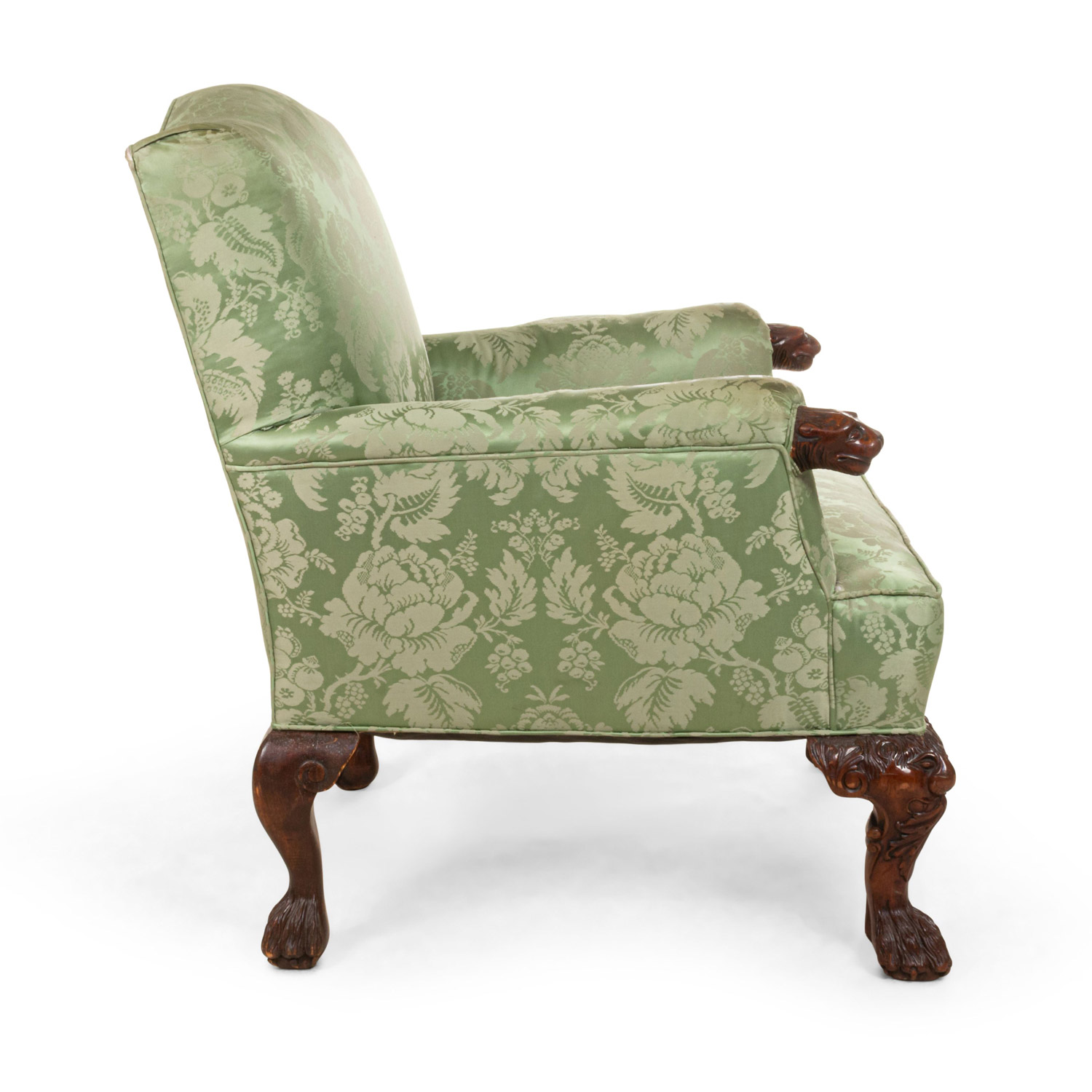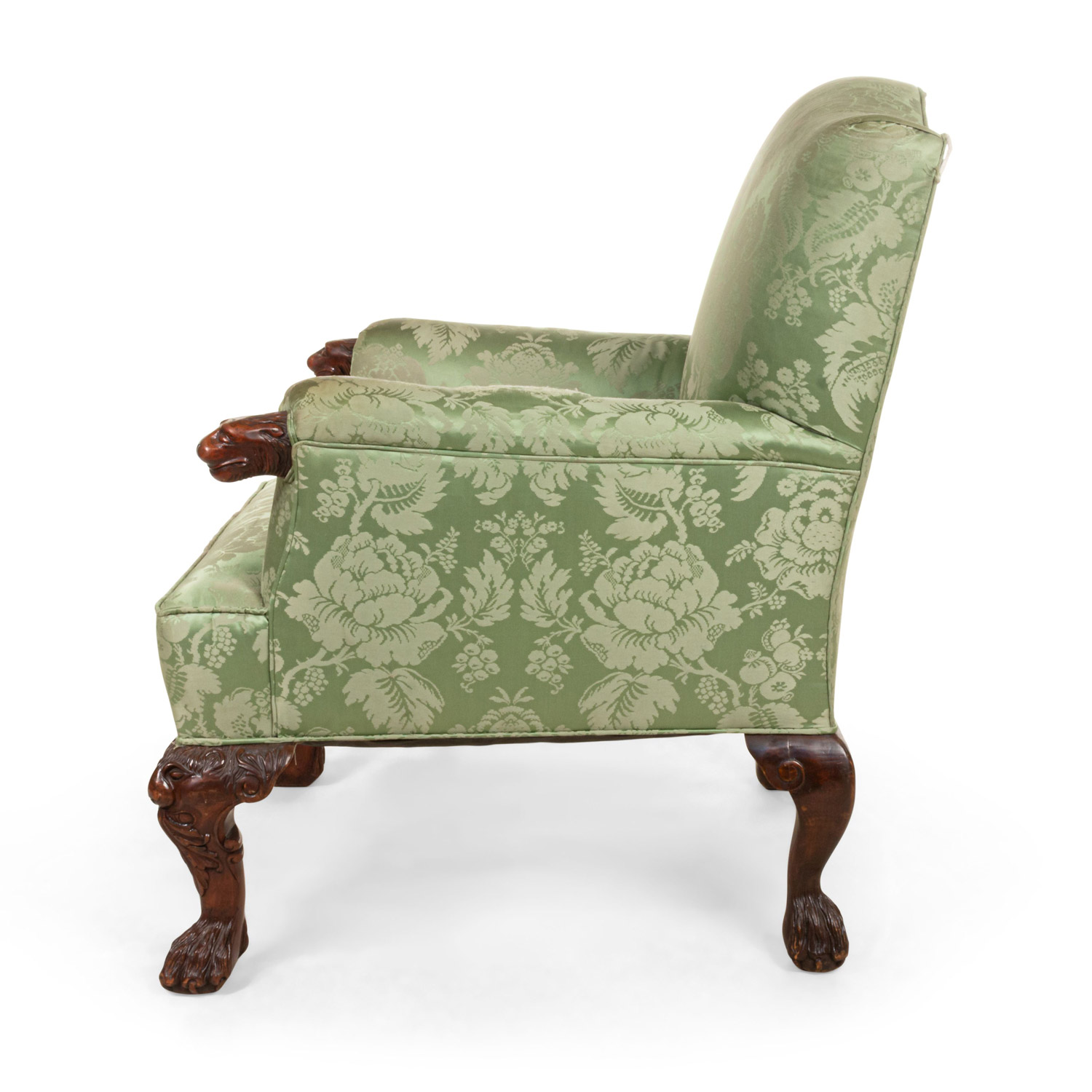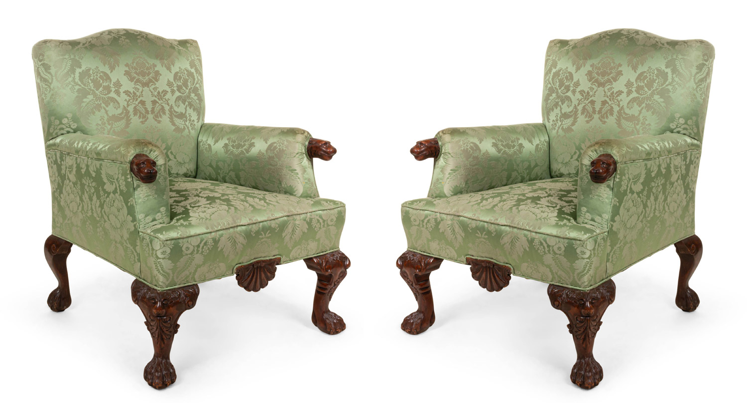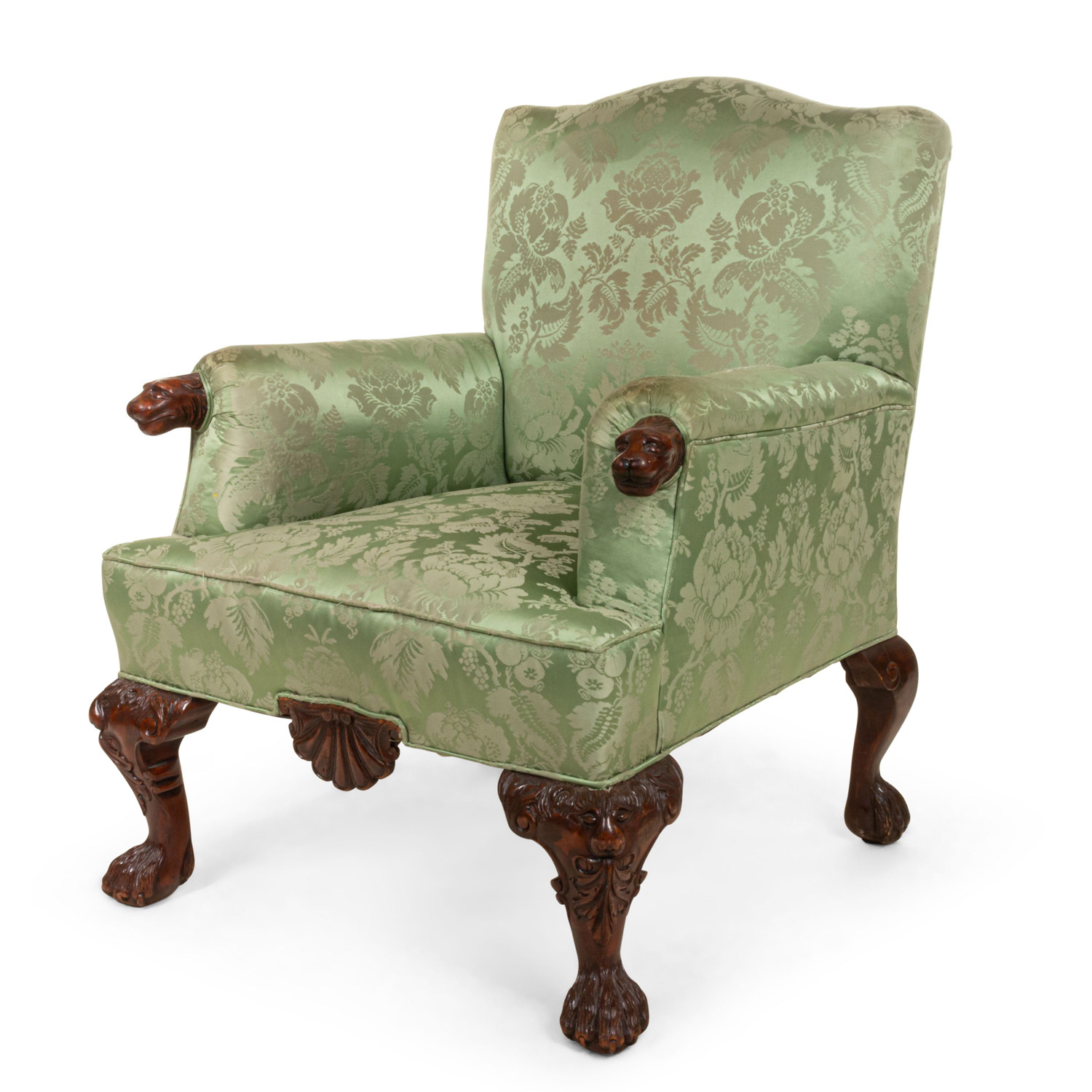 2 English Georgian style mahogany armchairs with carved lion arms & heads on legs with green upholstery (PRICED EACH) (SEE ALSO: matching sofa: BAS026A)