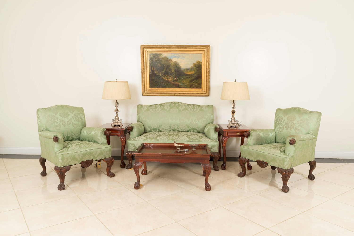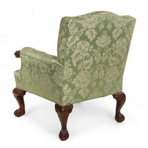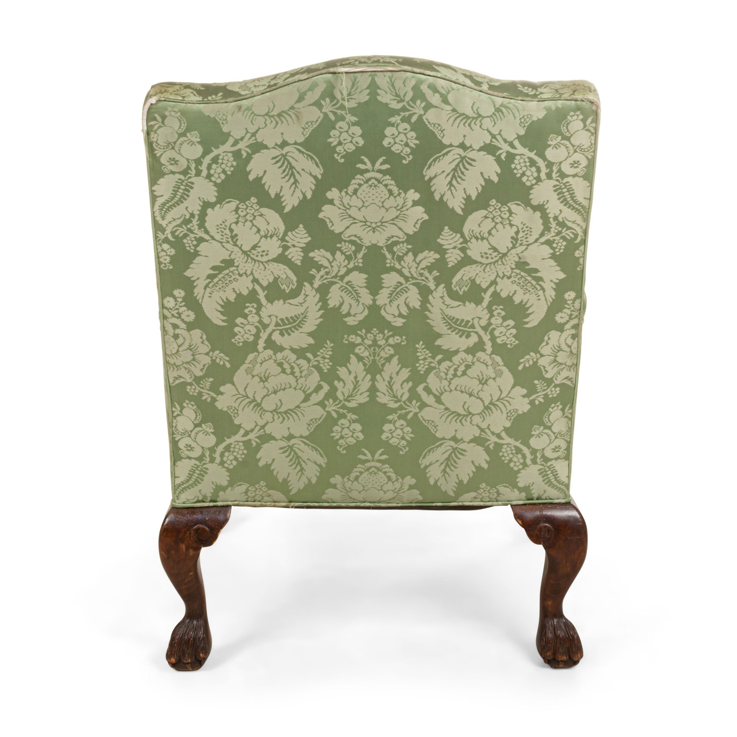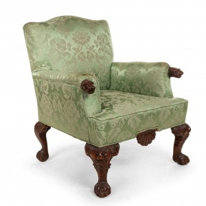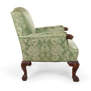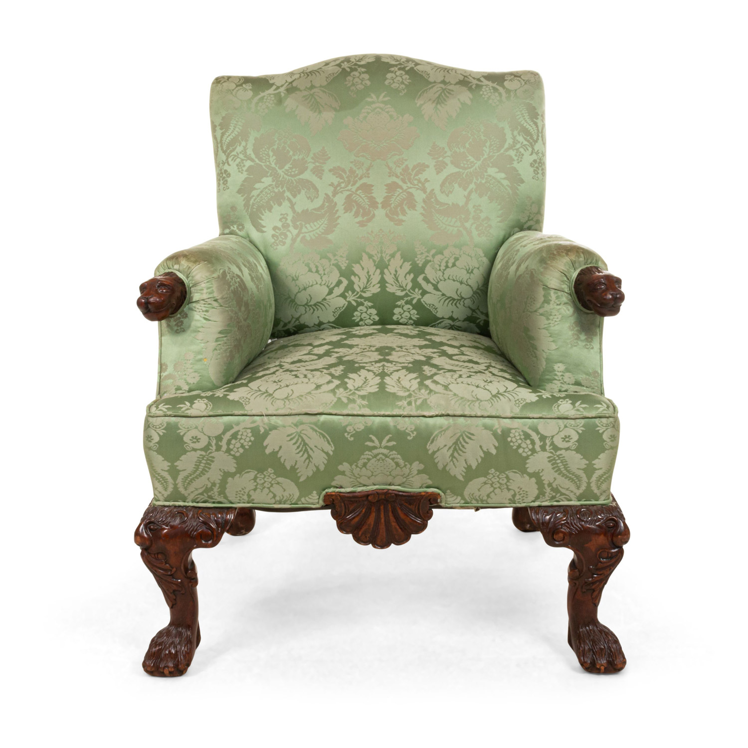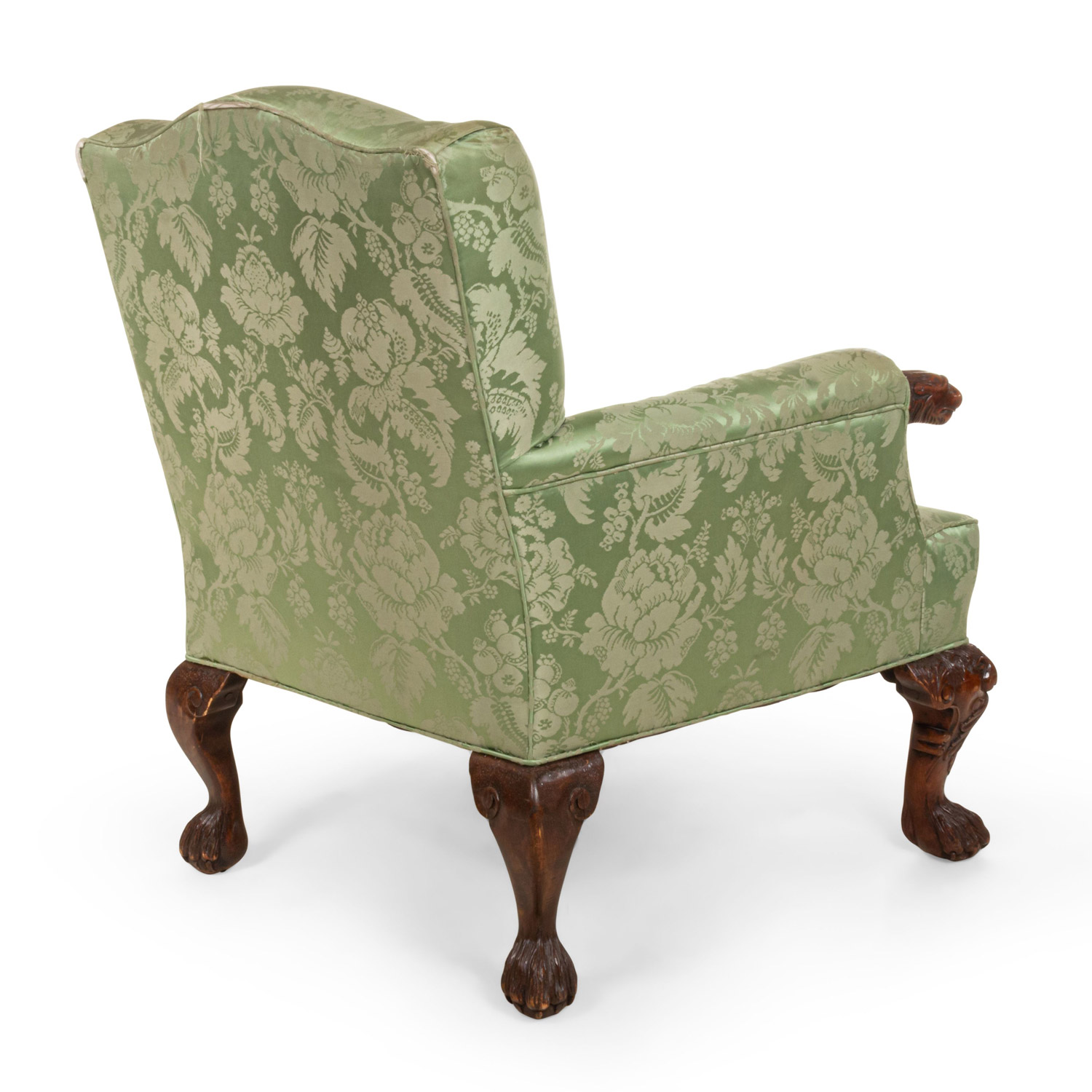 2 English Georgian style mahogany armchairs with carved lion arms & heads on legs with green upholstery (PRICED EACH) (SEE ALSO: matching sofa: BAS026A)