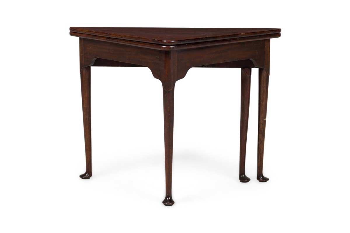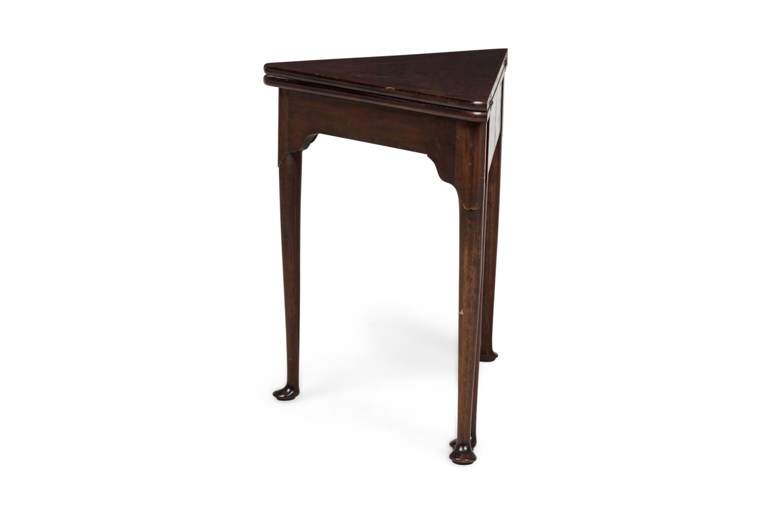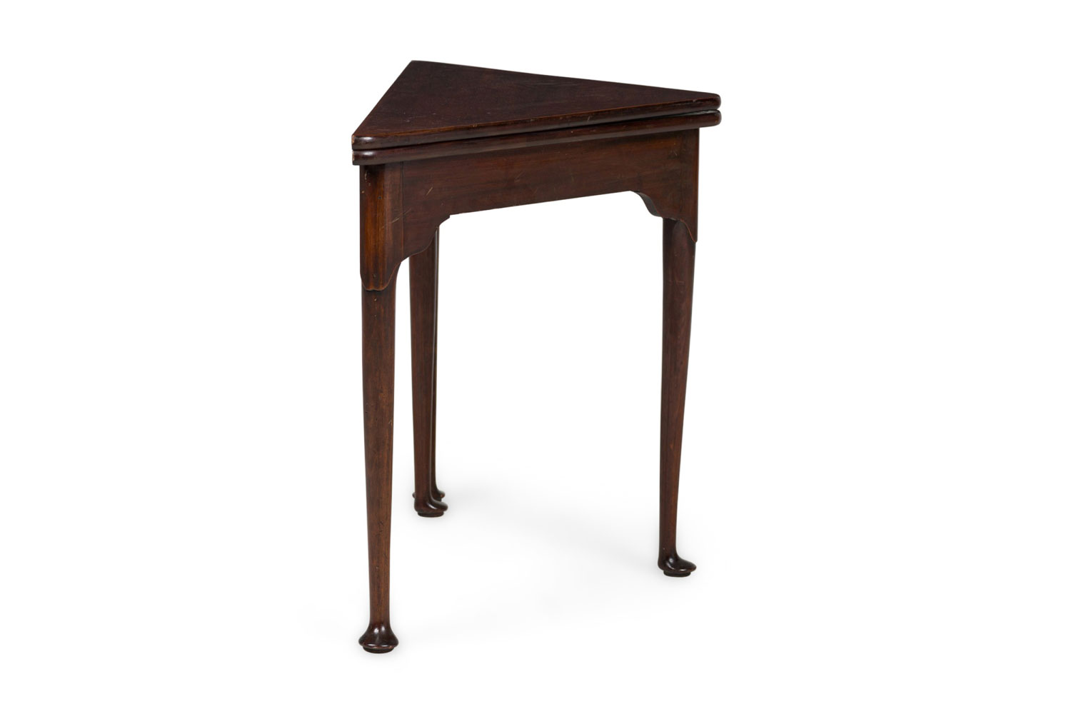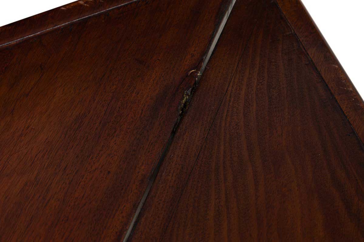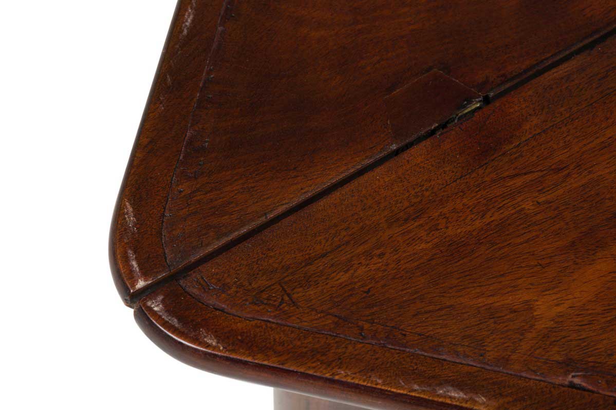 English Georgian-style (20th Century) mahogany triangular shaped flip top console table (Top measures 30.25" wide x 30.25" deep when opened)