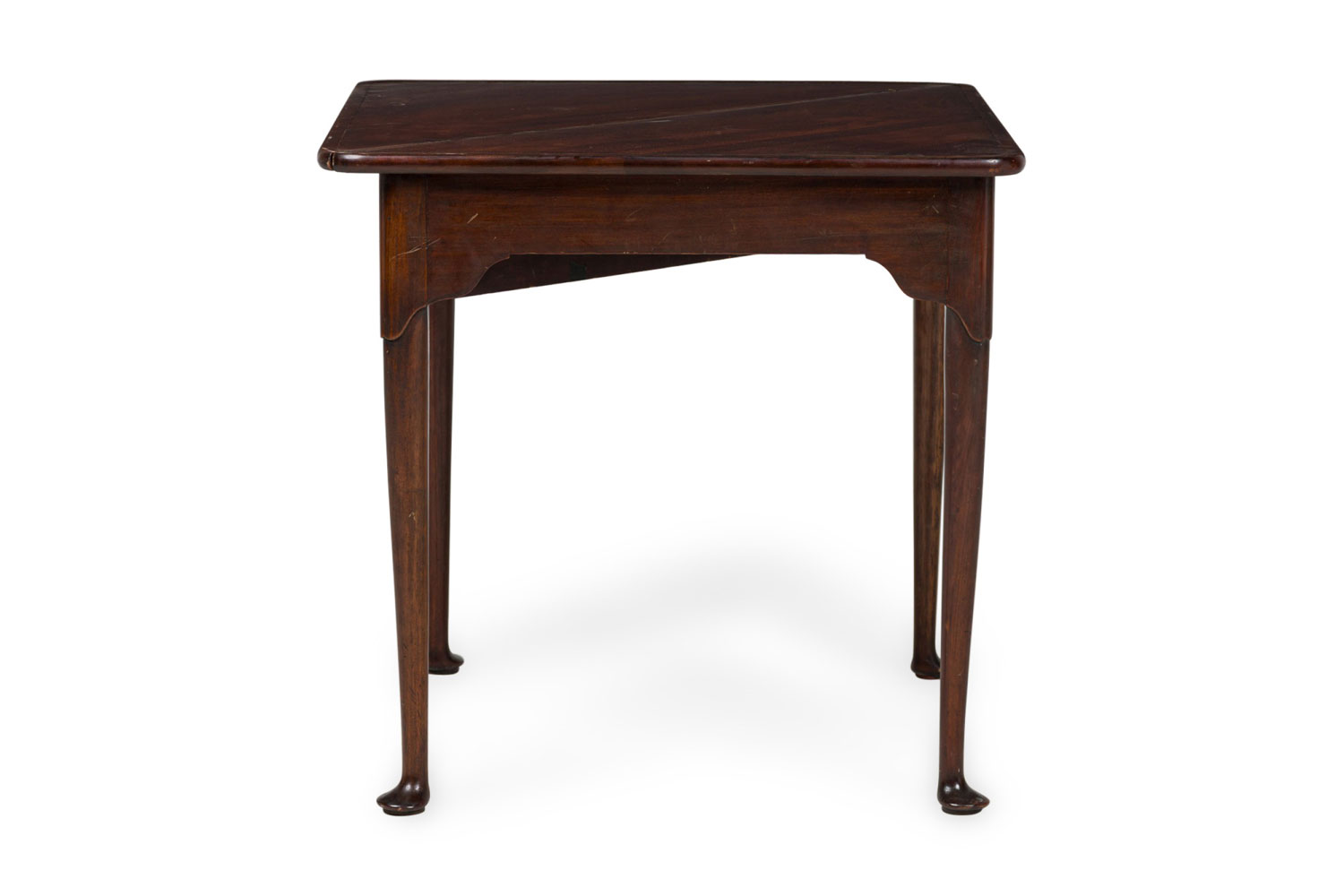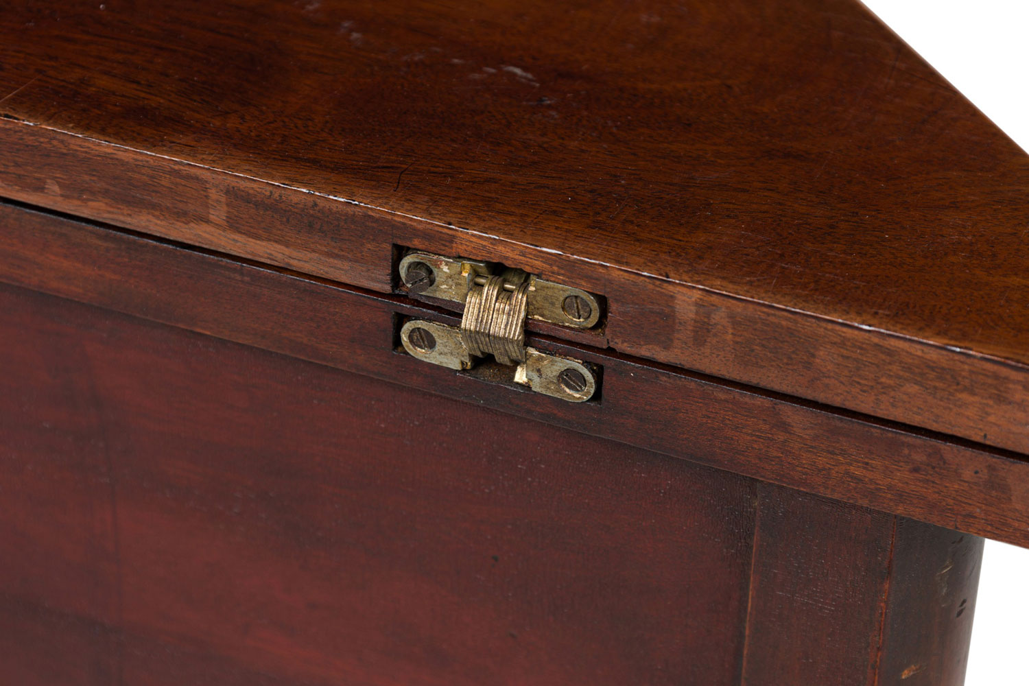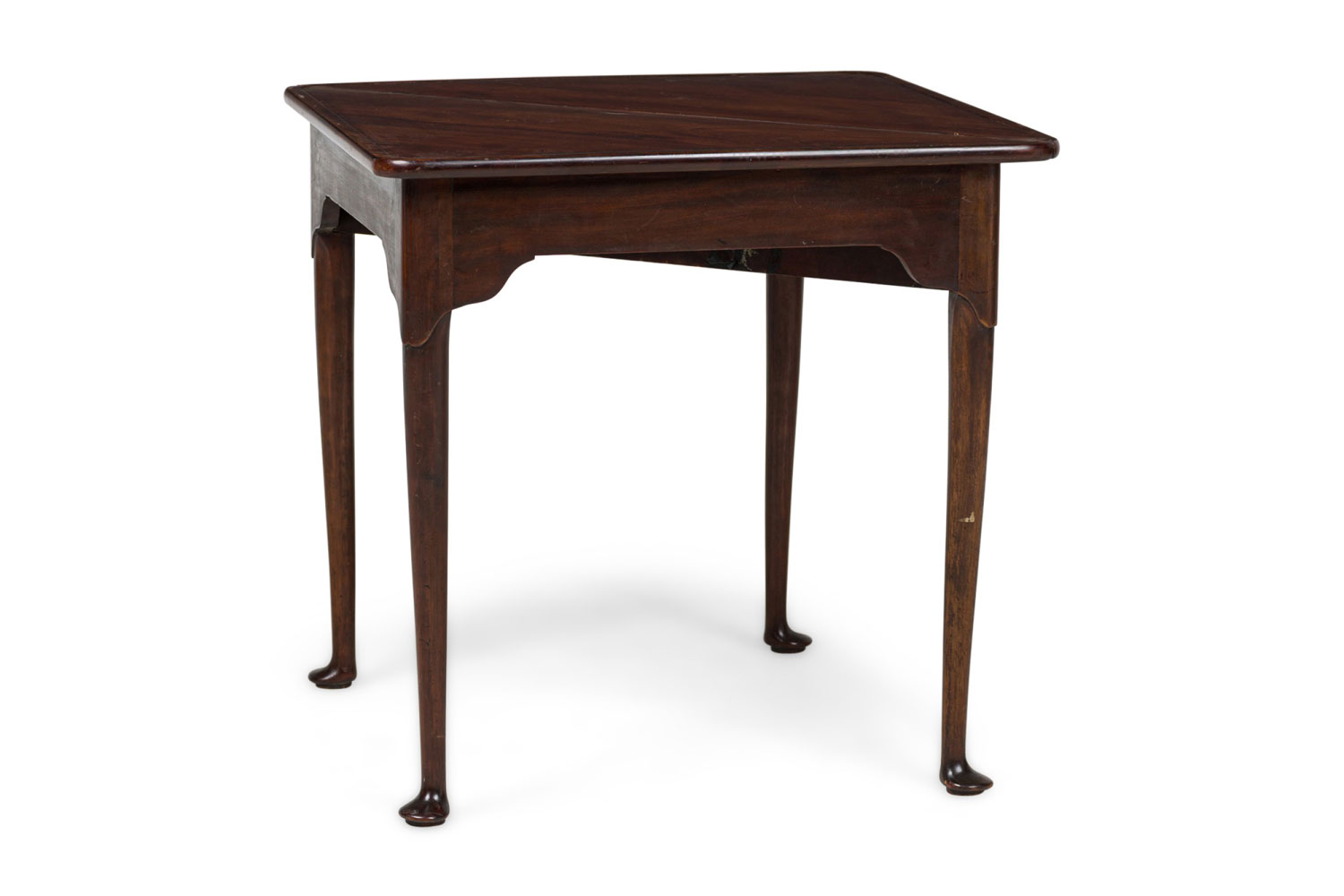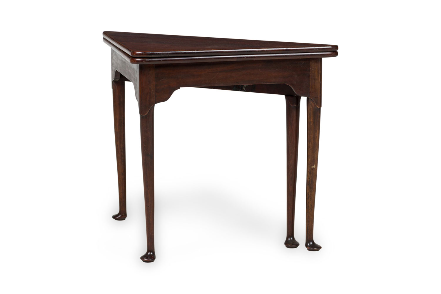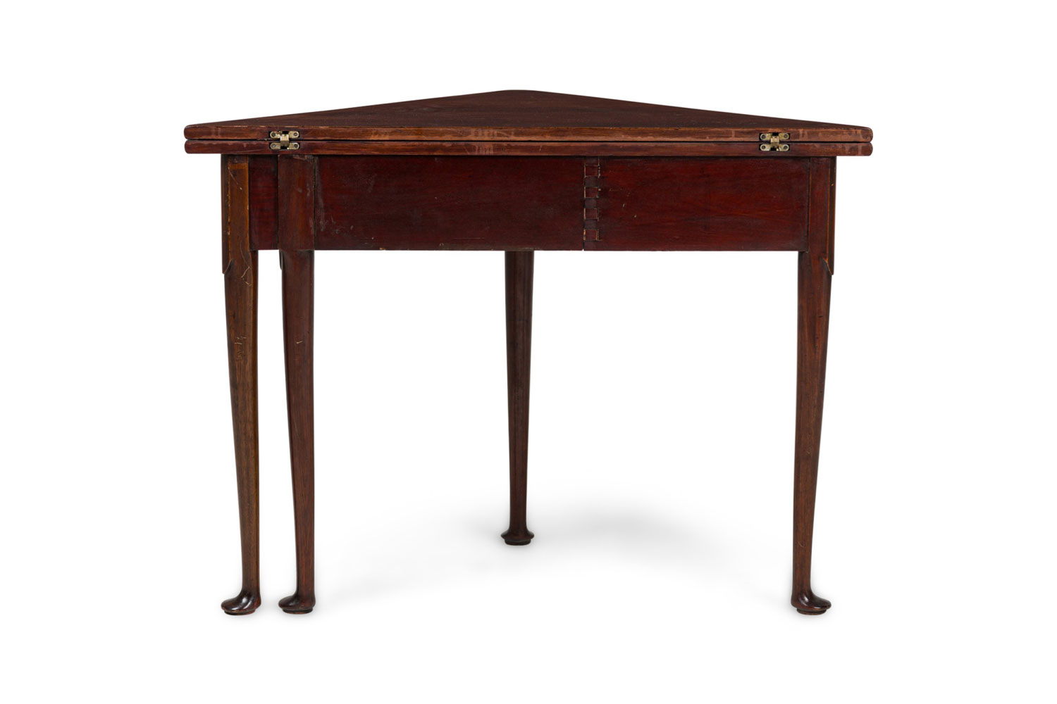 English Georgian-style (20th Century) mahogany triangular shaped flip top console table (Top measures 30.25" wide x 30.25" deep when opened)
