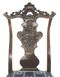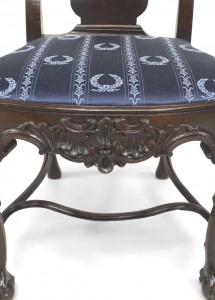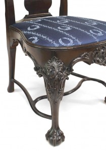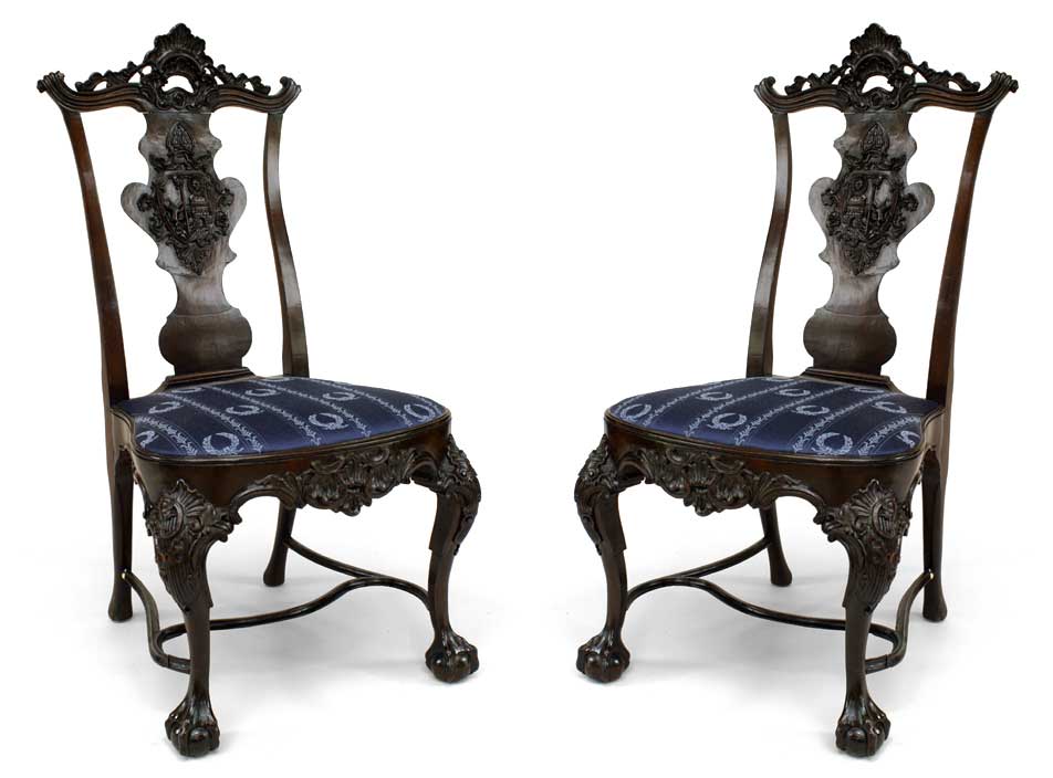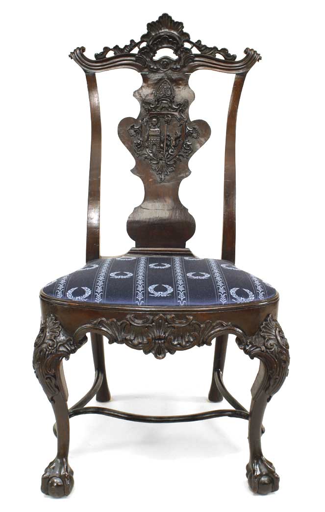 2 English Georgian style carved mahogany armorial splat back side chairs with slip seat and stretcher. (19th Cent.) (PRICED EACH)