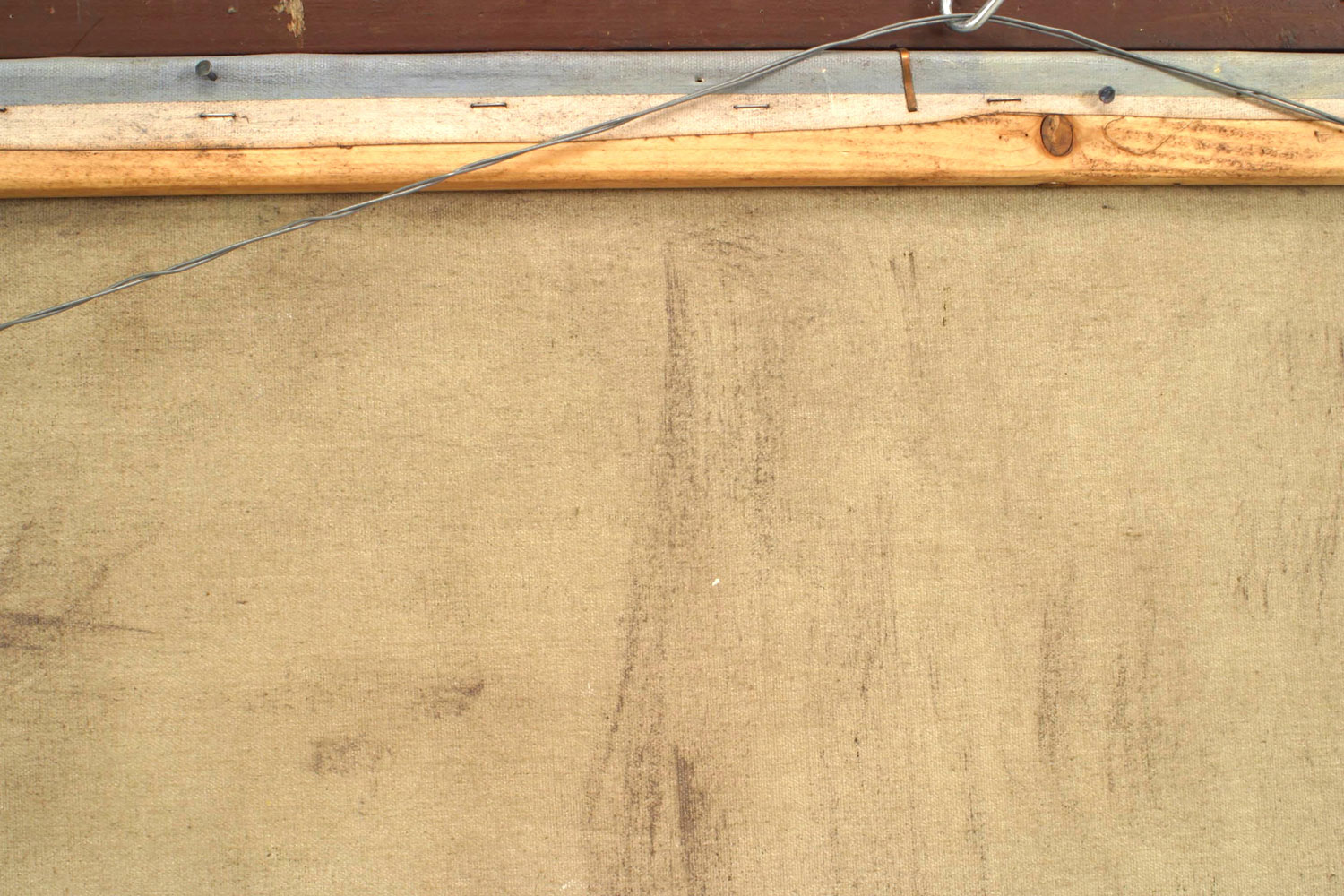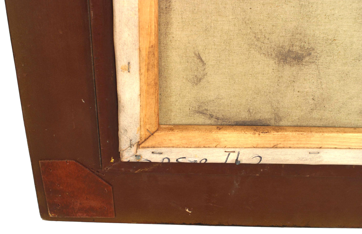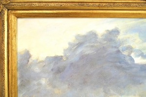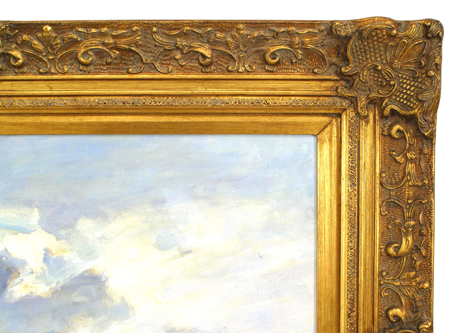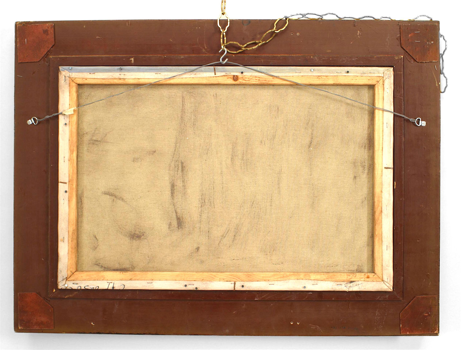English gold framed oil painting of 3 jockeys on horses in a crowd of people at race track.