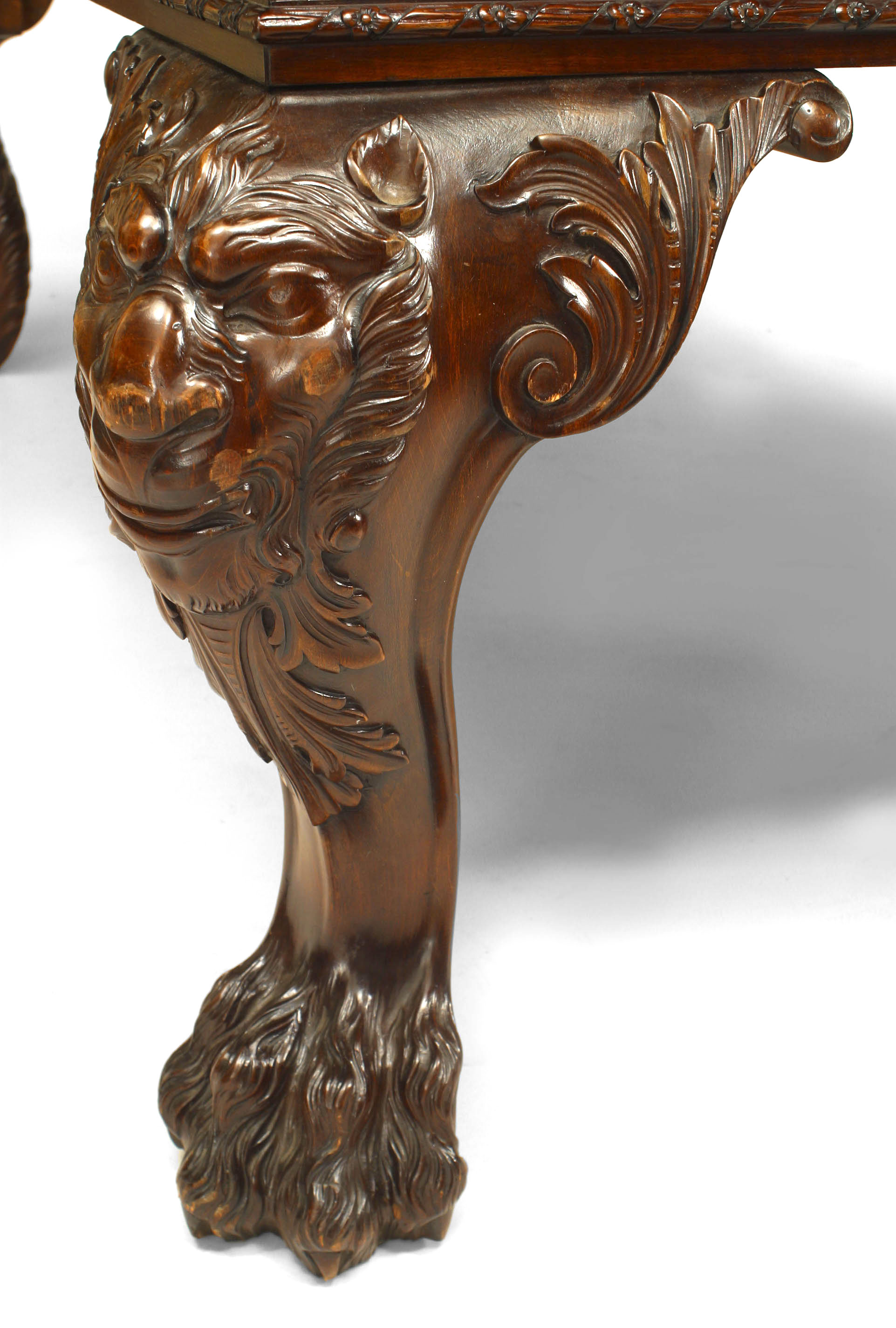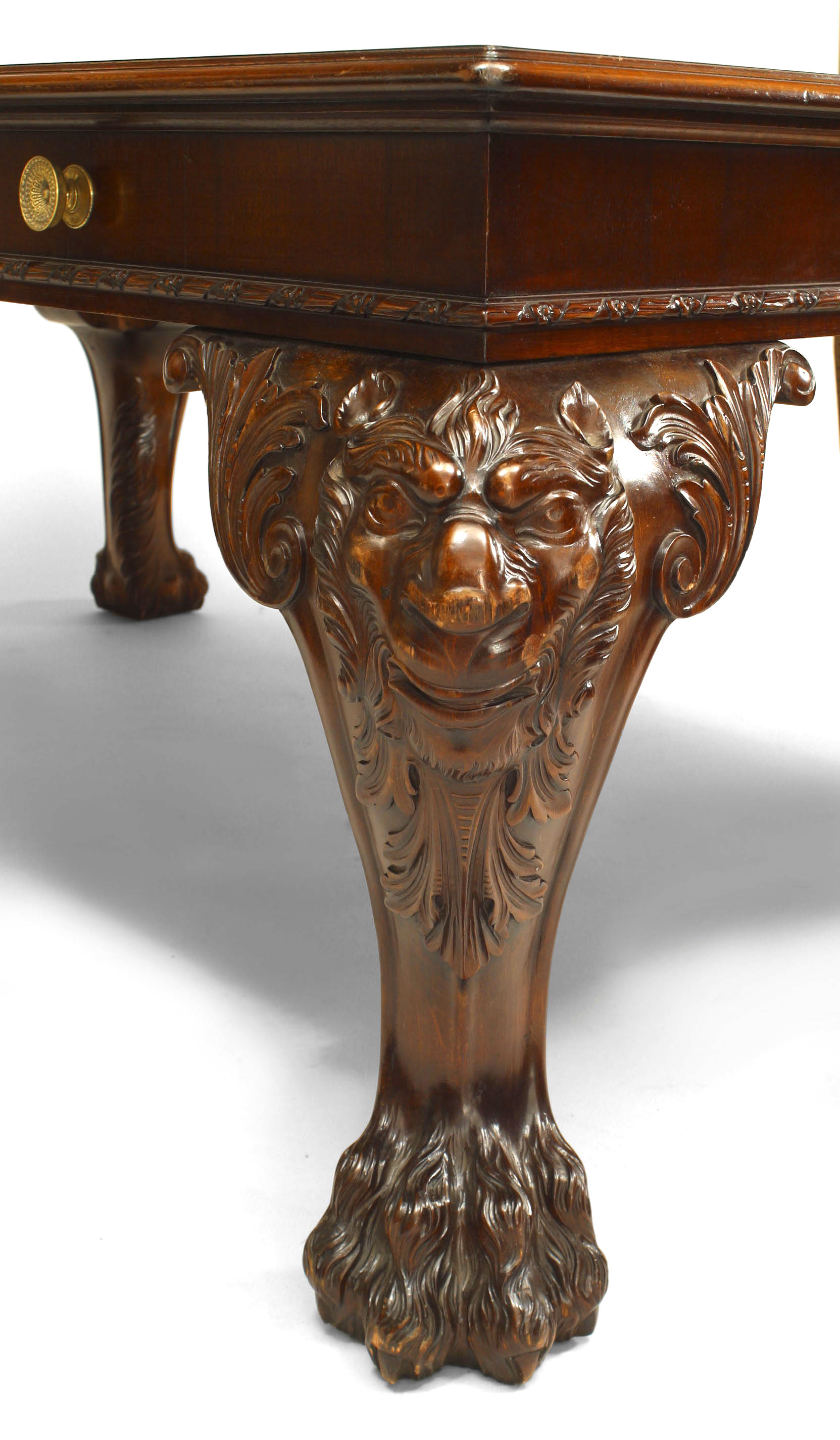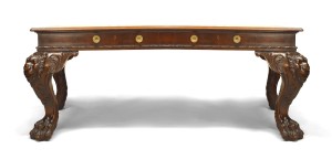 English/Irish Georgian style (19th Century) mahogany table desk with carved lion heads on legs with claw feet and red leather top.