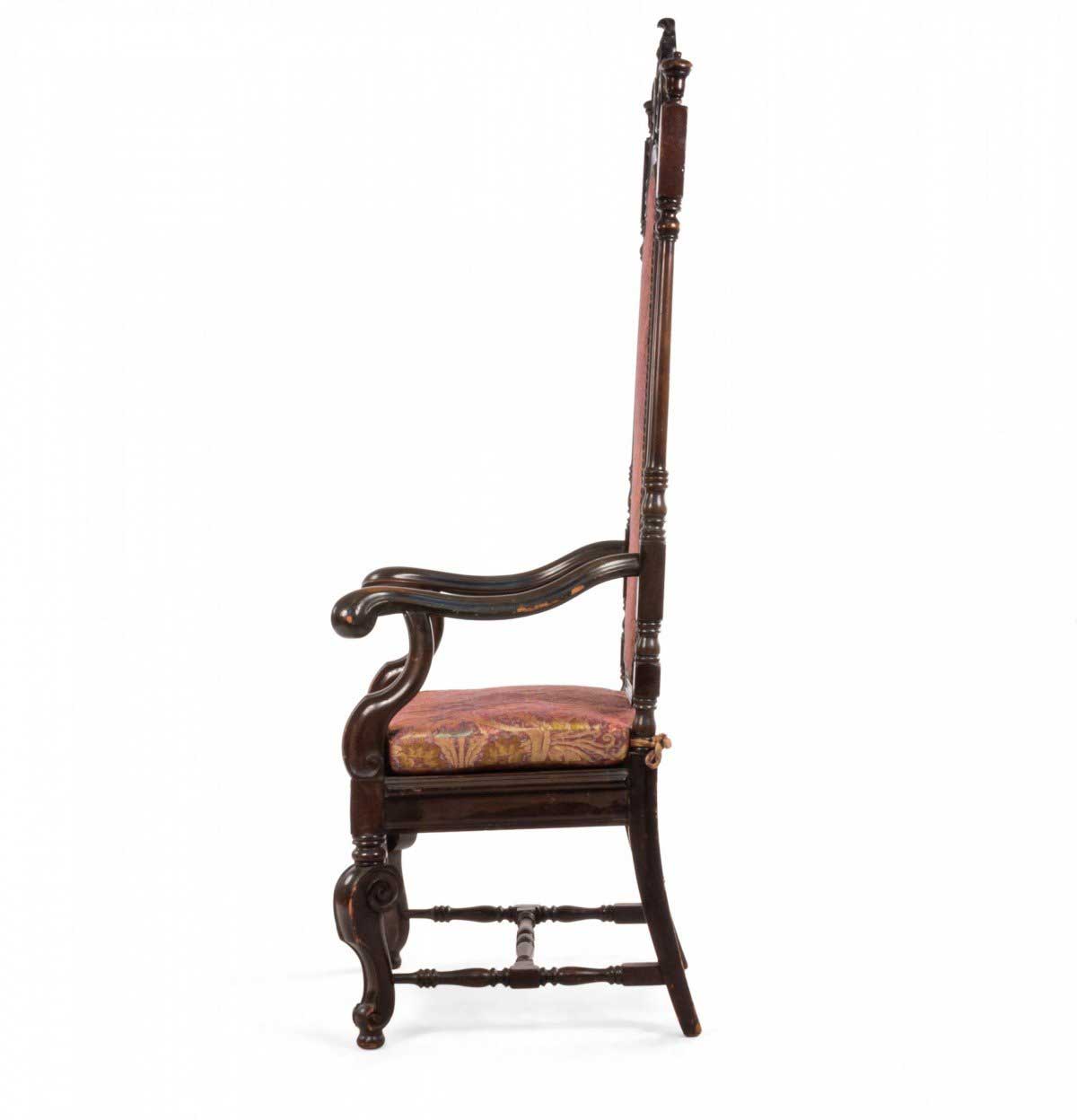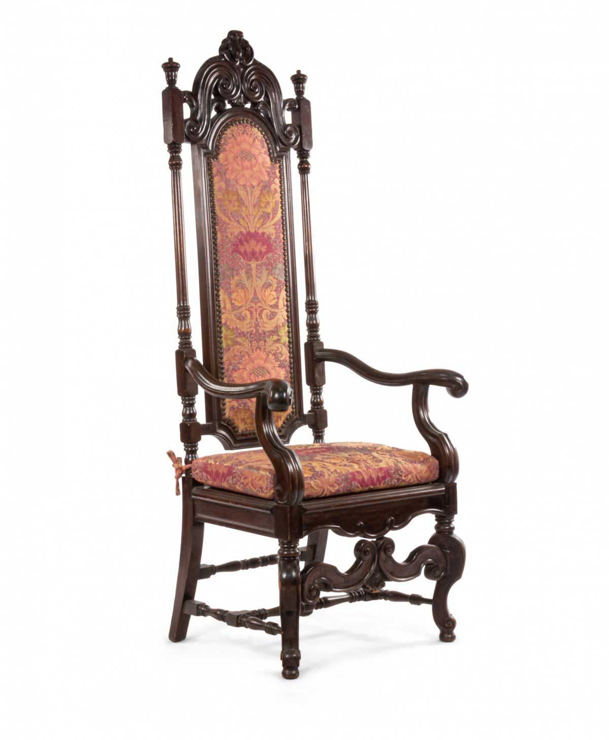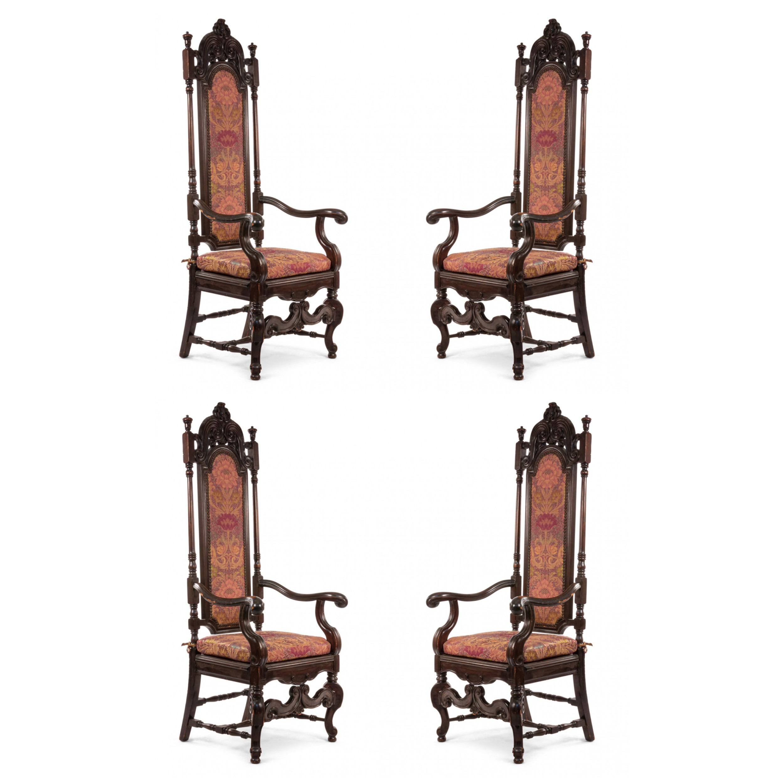4 English James II-style (19th/20th Century) walnut high back armchairs with arched, carved crest rails and floral upholstered backs and seat cushions. (Label for Yeager/ Allentown PA) (PRICED EACH)