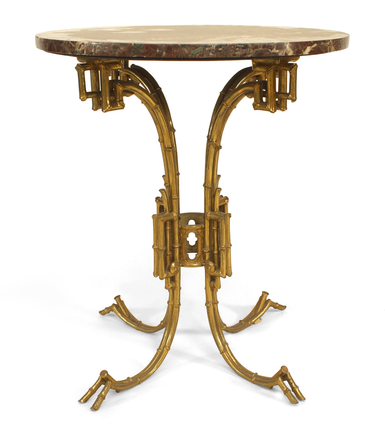 English Regency-style (19/20th Century) brass end table with faux bamboo base supporting a round rouge marble top.