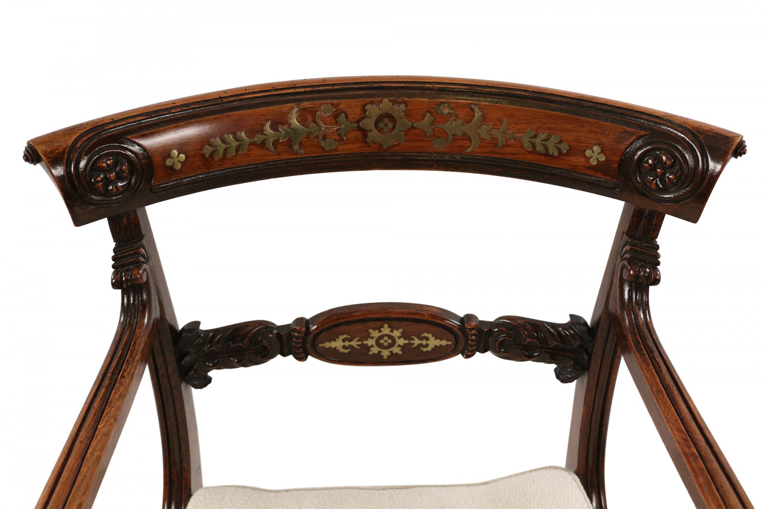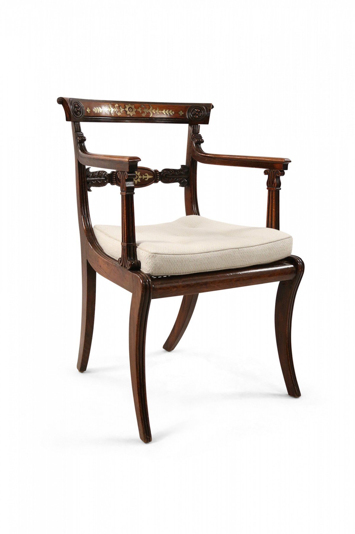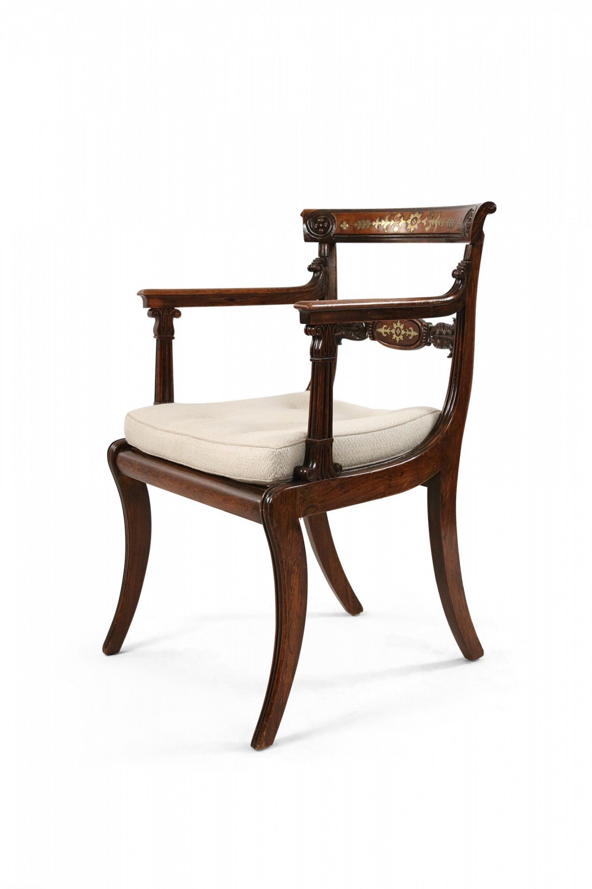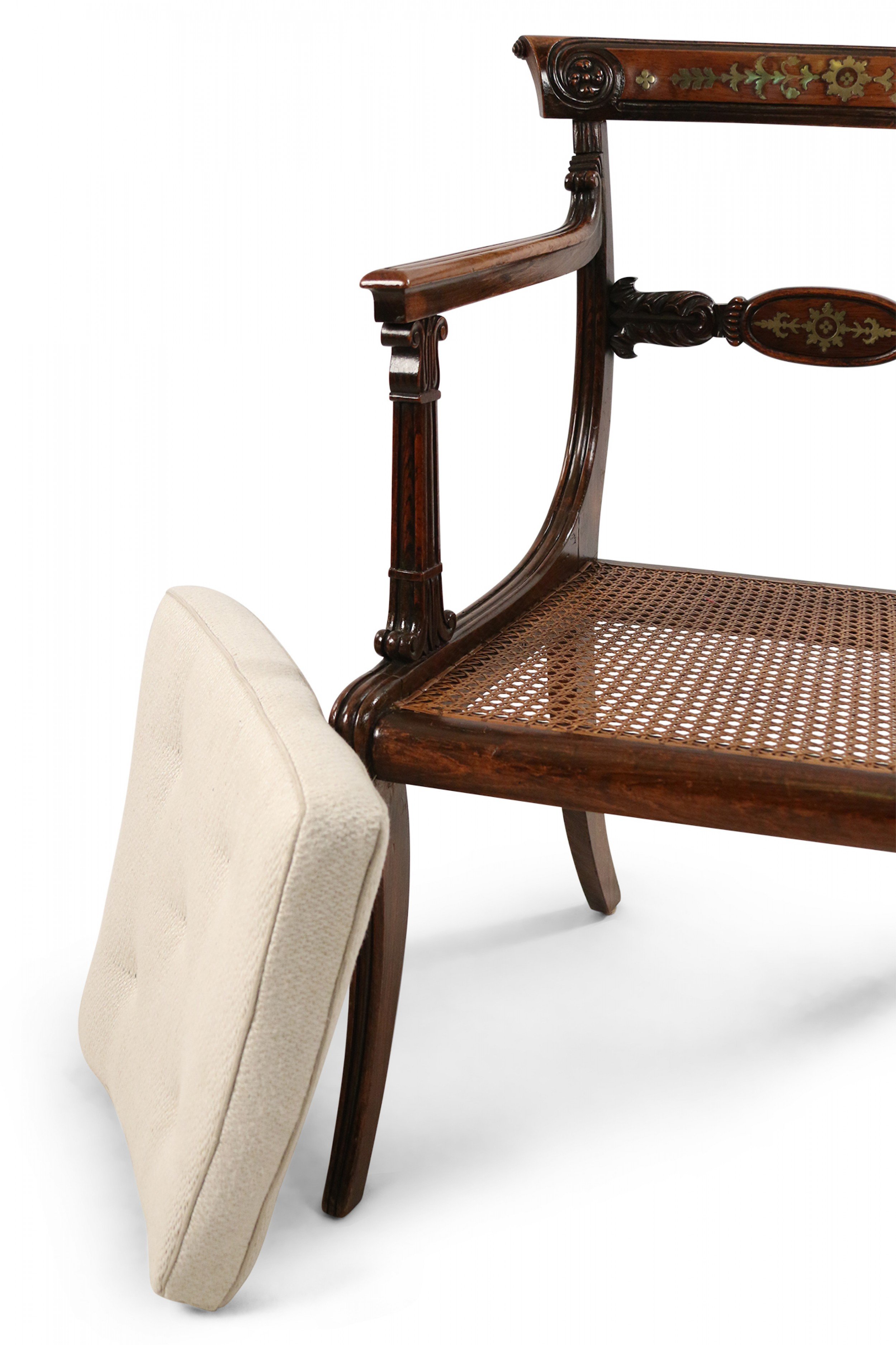 2 English Regency mahogany armchairs with floral brass inlay pattern, carved details, cane seats, and removable beige tufted upholstered seat cushions. (PRICED EACH)