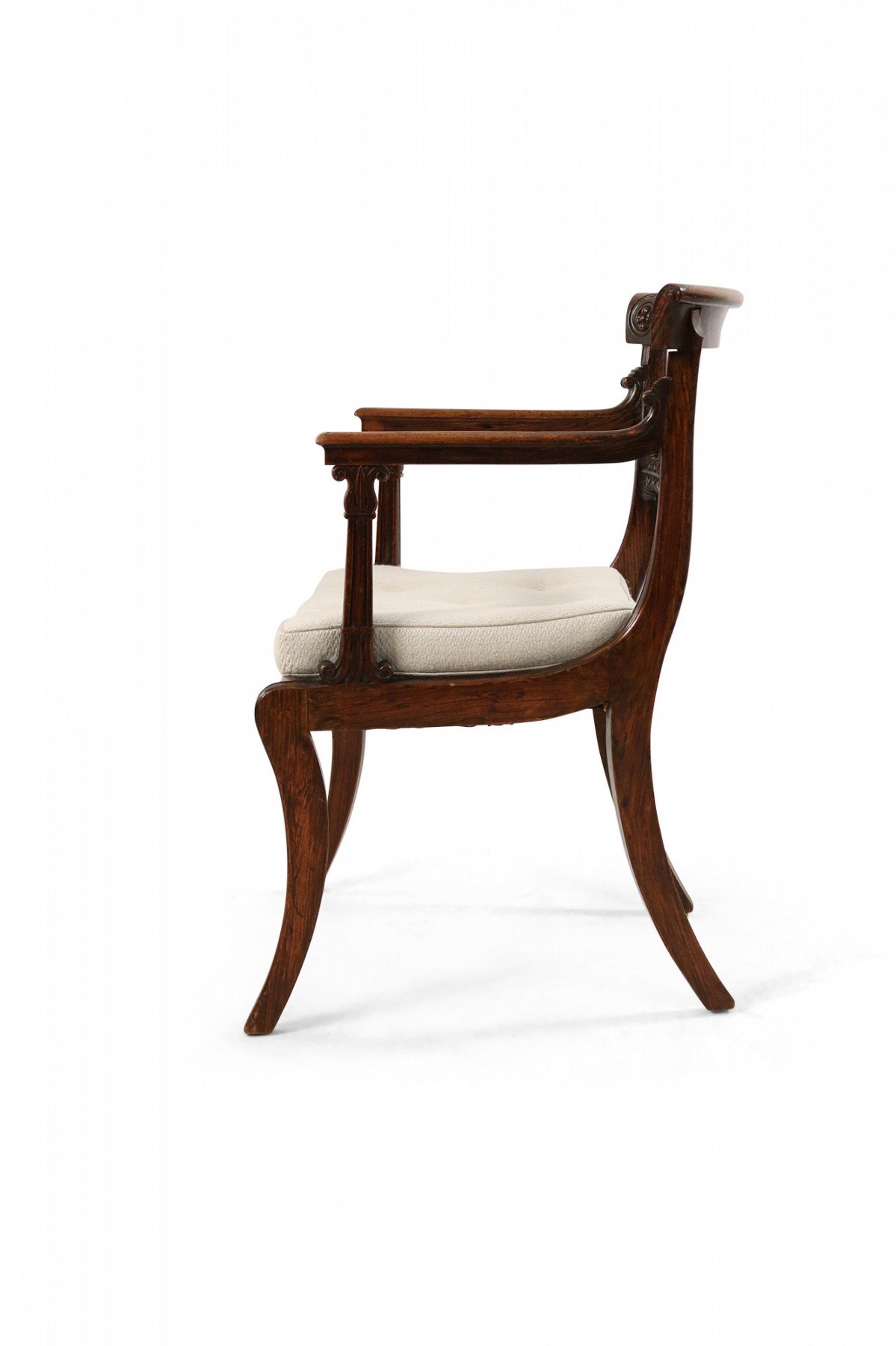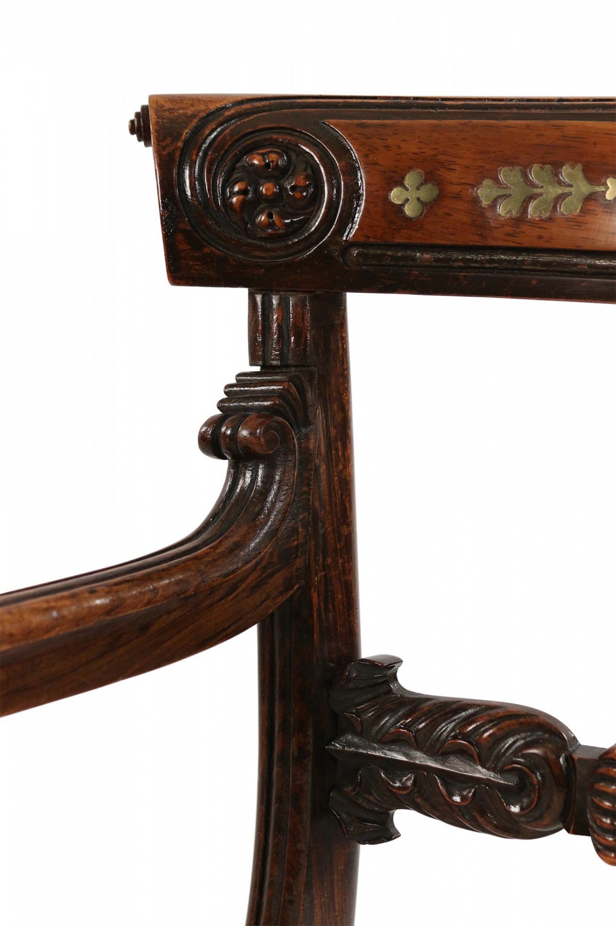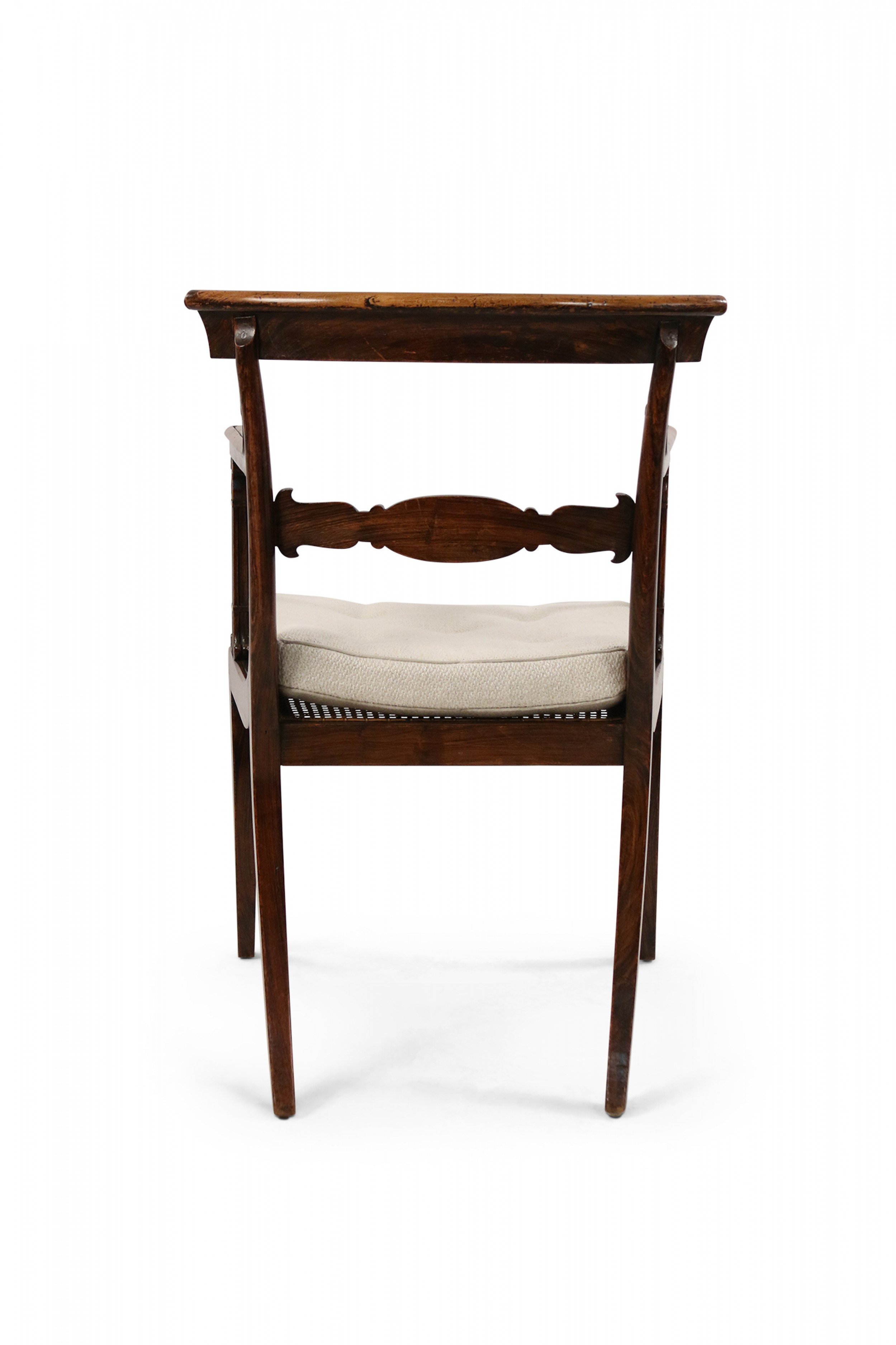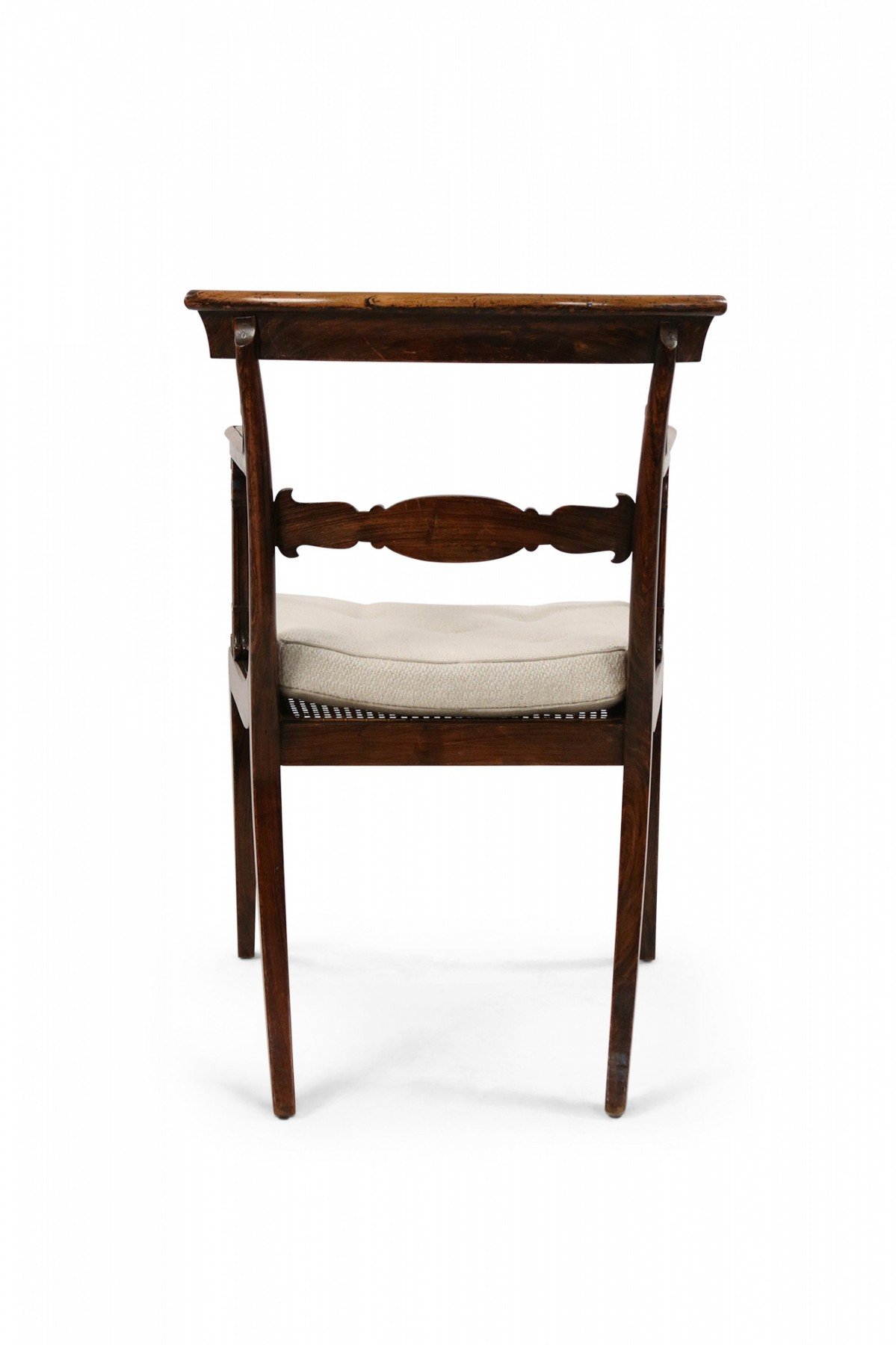 2 English Regency mahogany armchairs with floral brass inlay pattern, carved details, cane seats, and removable beige tufted upholstered seat cushions. (PRICED EACH)