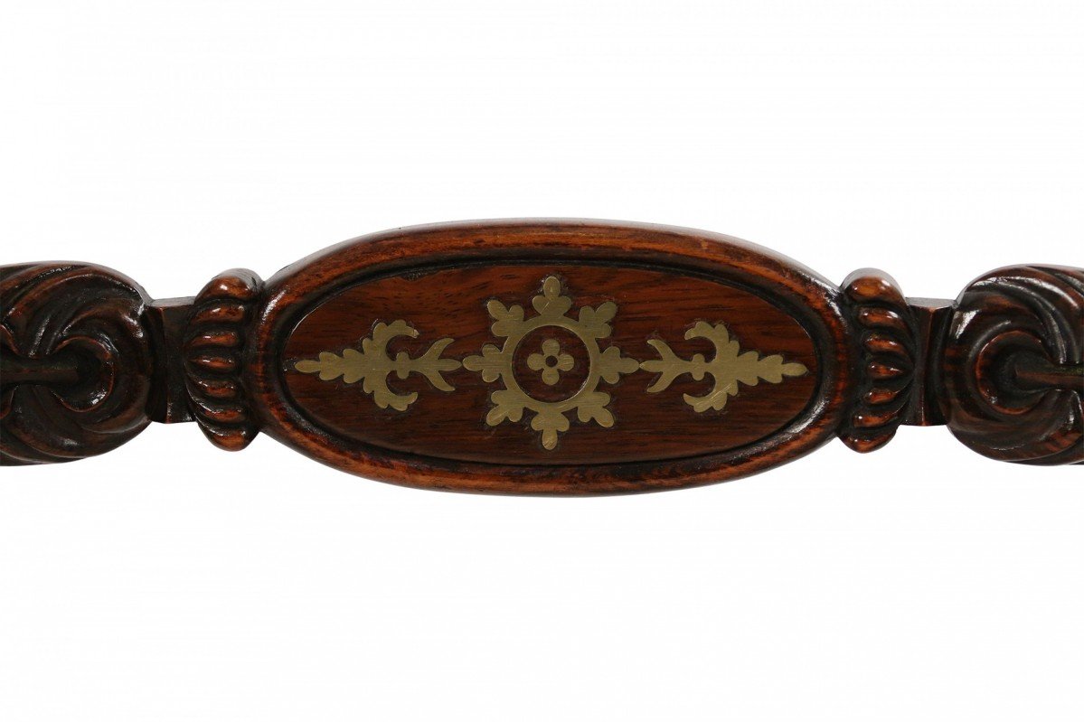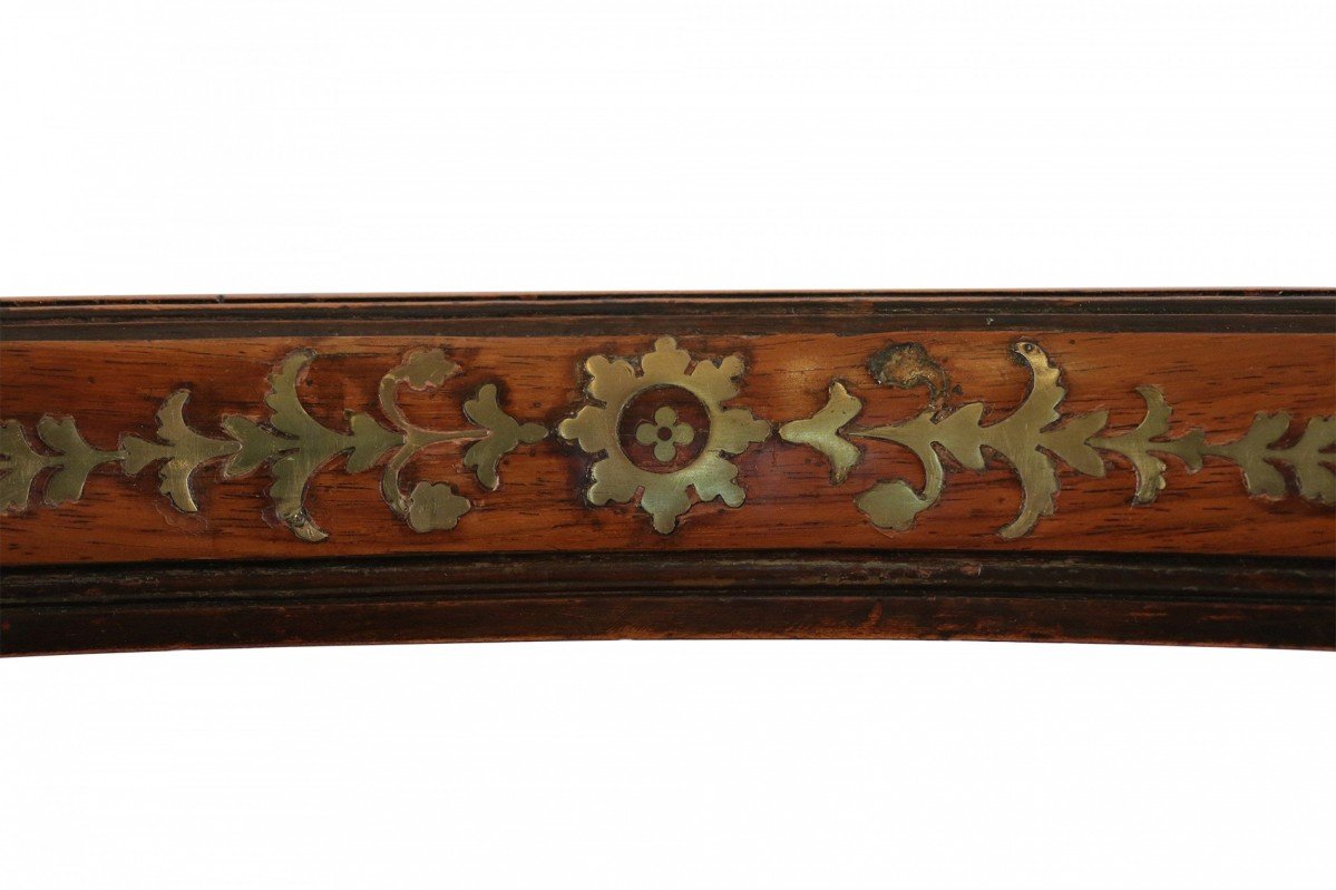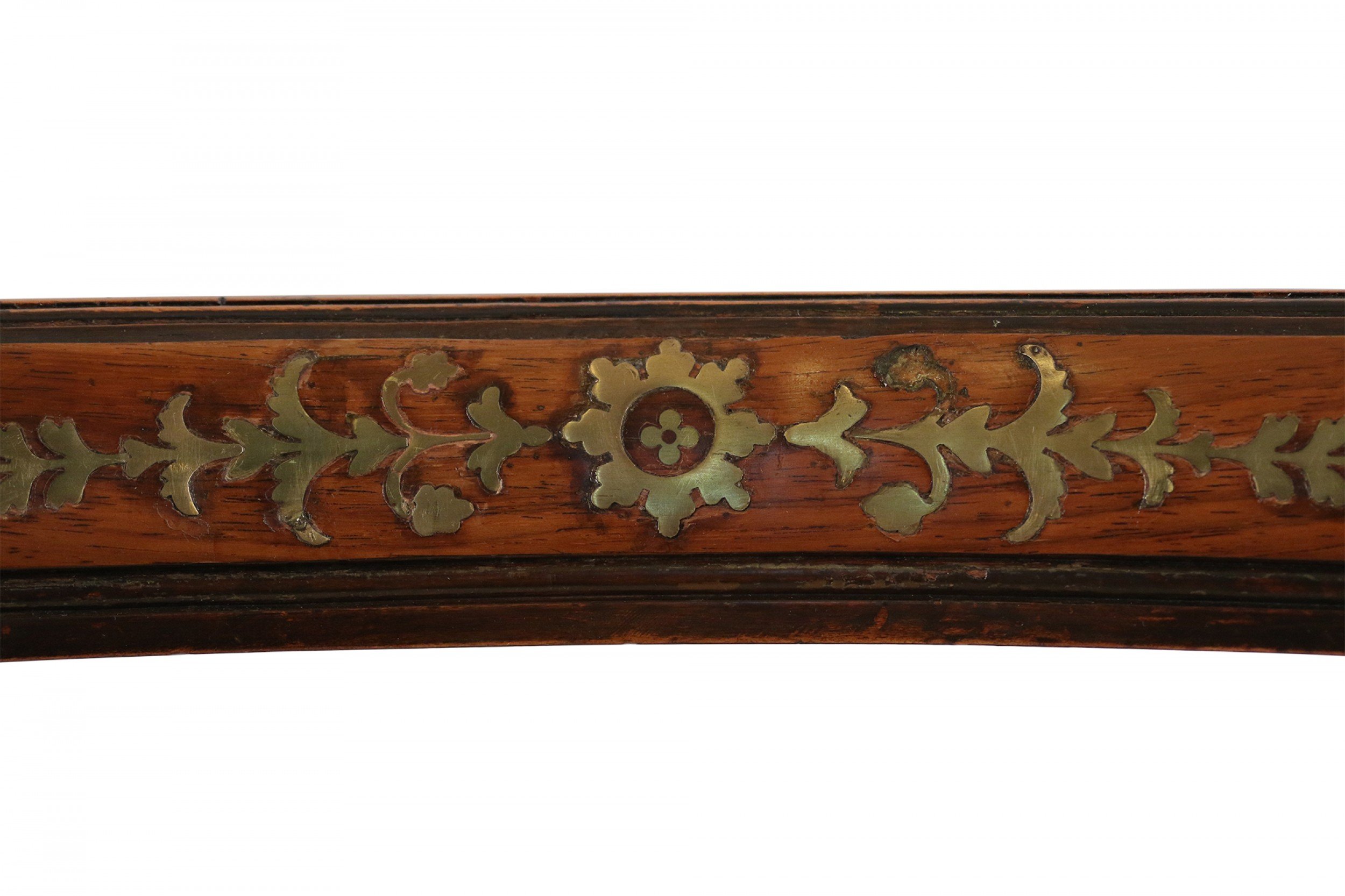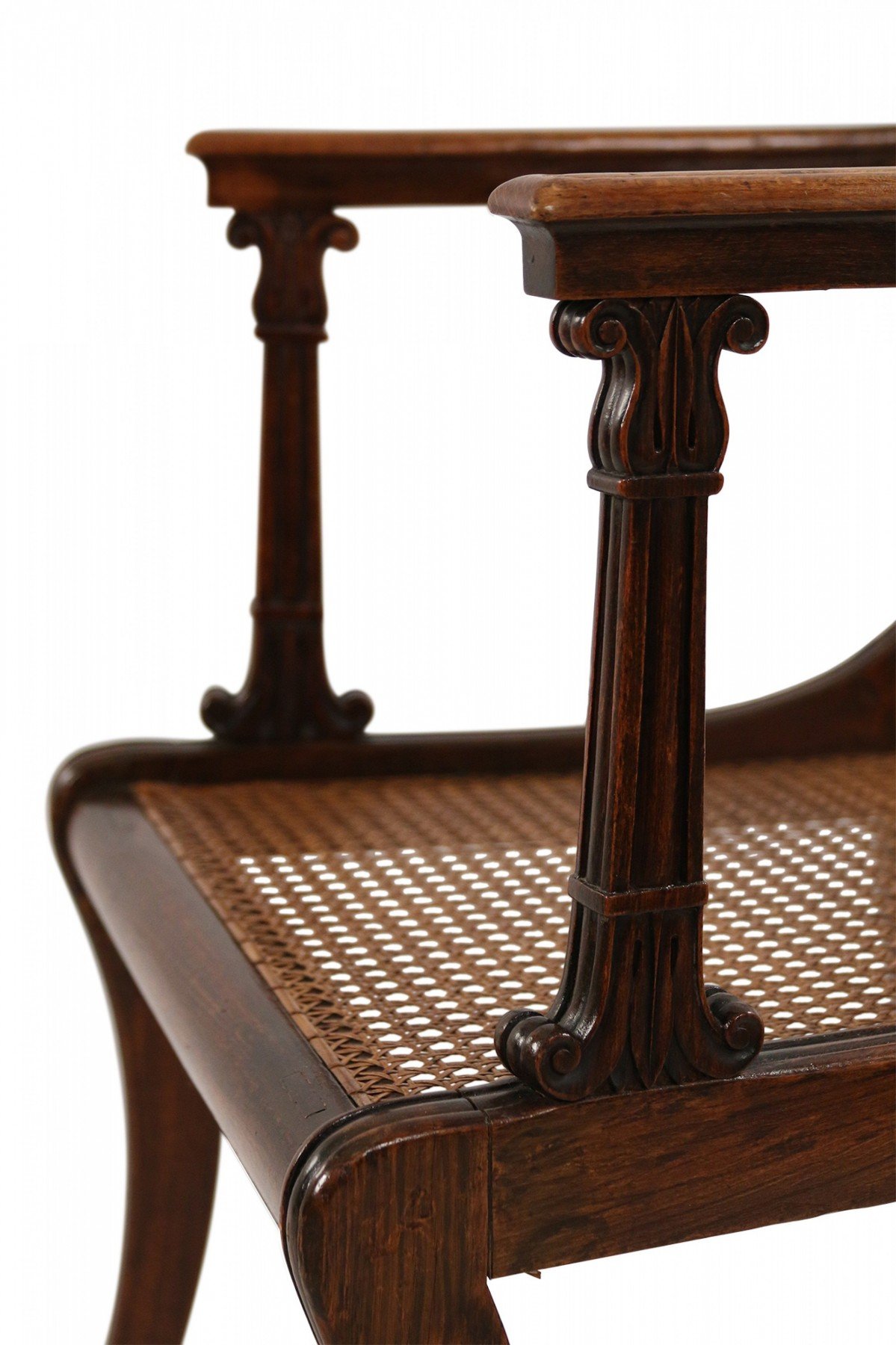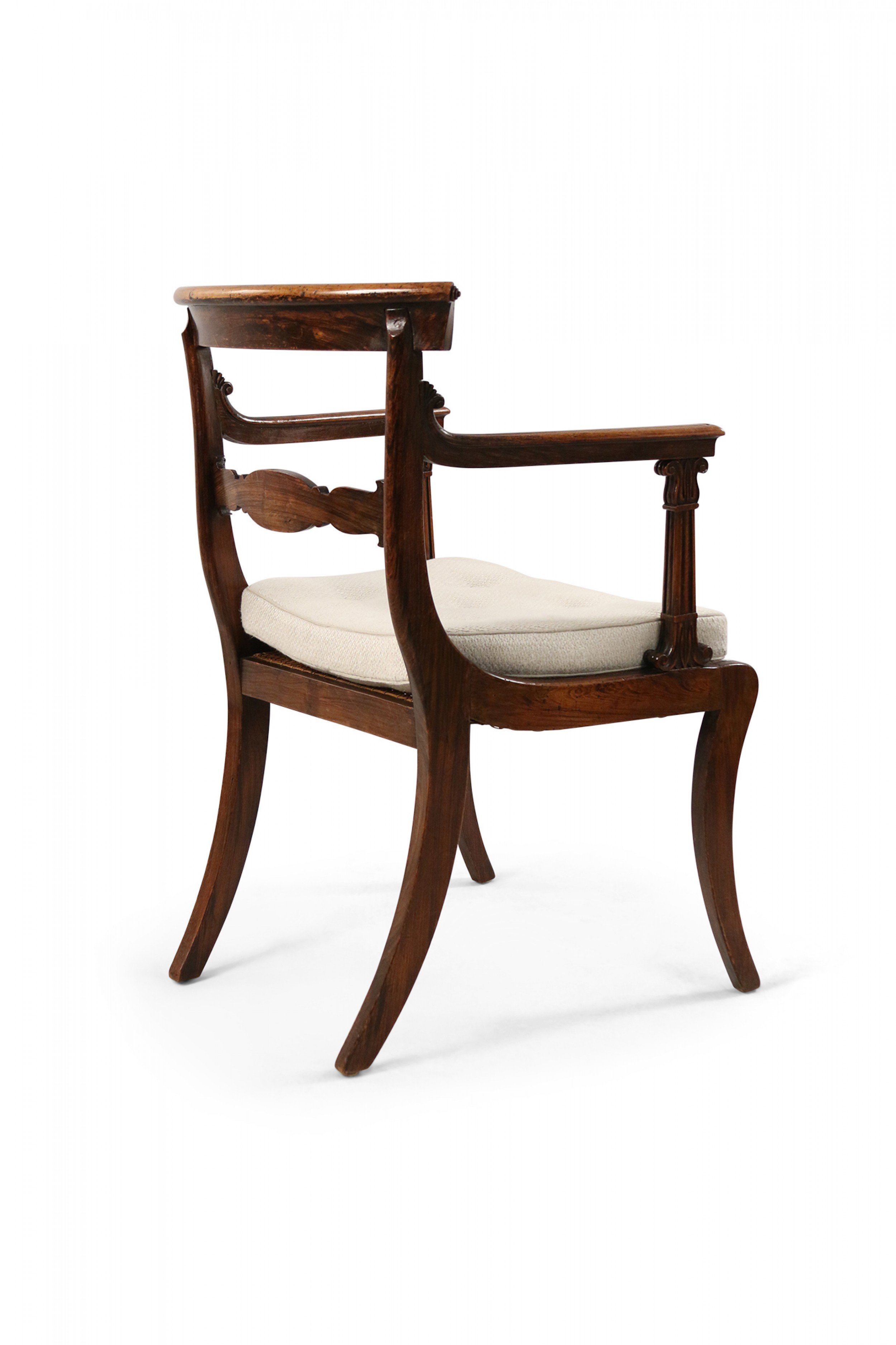 2 English Regency mahogany armchairs with floral brass inlay pattern, carved details, cane seats, and removable beige tufted upholstered seat cushions. (PRICED EACH)